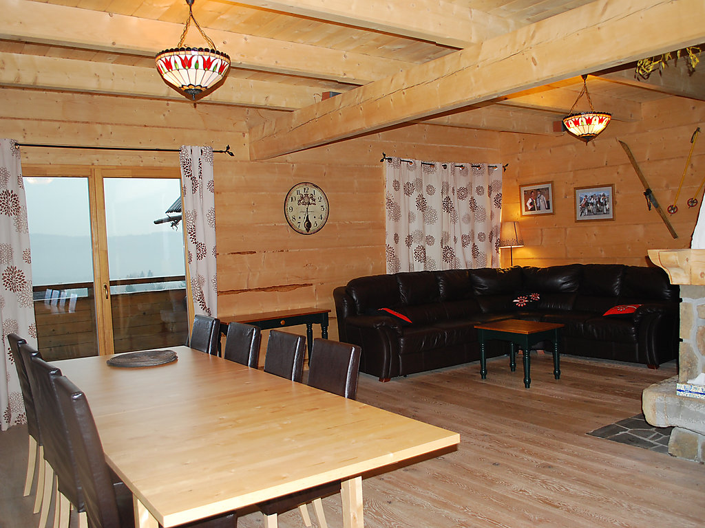 5-Zimmer-Chalet 280 m2 auf 3 Stockwerken. Offenes Wohn-/Esszimmer 46 m2 mit offenem Kamin und Sat-TV (Flachbildschirm), Stereoanlage. Ausgang zum Garten, zur Terrasse. Offene Küche (Geschirrspüler, 4 Glaskeramikherd Platten, Mikrowelle, elektrische Kaffeemaschine). Dusche/WC. Obergeschoss: 1 Zimmer 12 m2 mit 1 Diwanbett (90 cm, Länge 200 cm), 1 franz. Bett (160 cm, Länge 200 cm). 1 Zimmer 15 m2 mit 2 franz. Betten (140 cm, Länge 200 cm). 1 Zimmer 17 m2 mit 1 Bett (90 cm, Länge 200 cm), 1 Diwanbett und 1 Doppelbett (160 cm, Länge 200 cm). Dusche/WC. Dachgeschoss: 1 Zimmer 30 m2 mit 1 Doppeldiwanbett (140 cm, Länge 200 cm), 1 Doppelbett (160 cm, Länge 200 cm). Terrasse 25 m2. Terrassenmöbel. Sehr schöne Sicht auf die Berge, das Tal und die Landschaft. Zur Verfügung: Waschmaschine, Kinderhochstuhl, Babybett bis 3 Jahre, Haartrockner, Holz (gratis). Internet (Wireless LAN, gratis). Parkplatz beim Haus. Bitte beachten: geeignet für Familien. Nichtraucher-Haus.