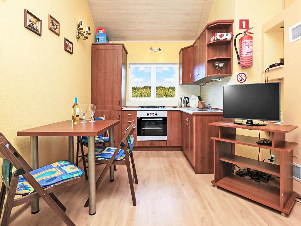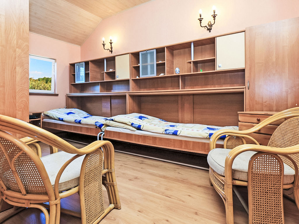 2-Zimmer-Haus 40 m2, im Erdgeschoss. Wohnzimmer mit 1 Doppeldiwanbett, offenem Kamin, Sat-TV und Radio. 1 Zimmer mit 2 Wandklappbetten (80 cm, Länge 200 cm). Offene Küche (4 Kochplatten, Tiefkühler). Dusche/WC. Holzheizung. 1 Haustier/Hund erlaubt.
