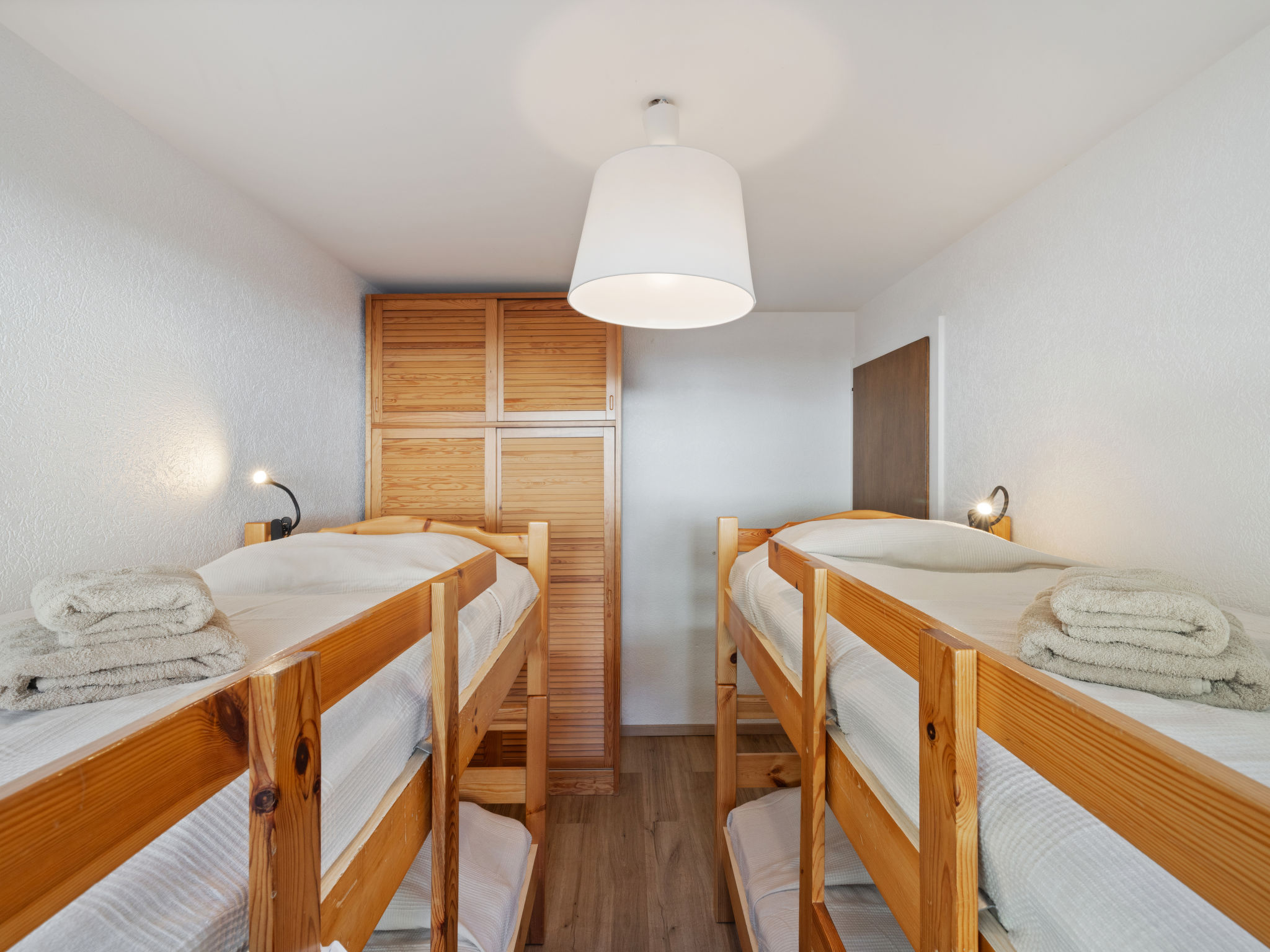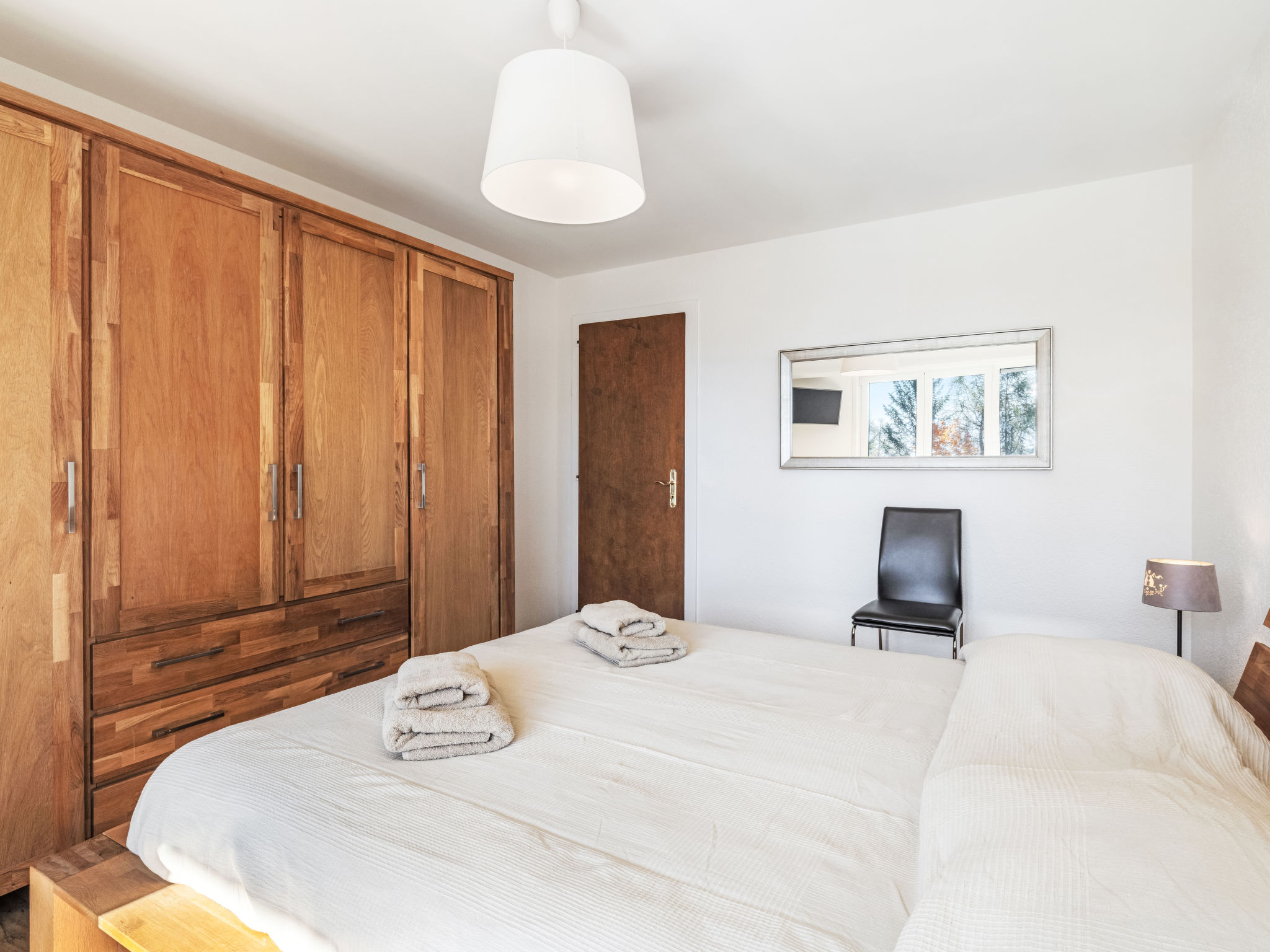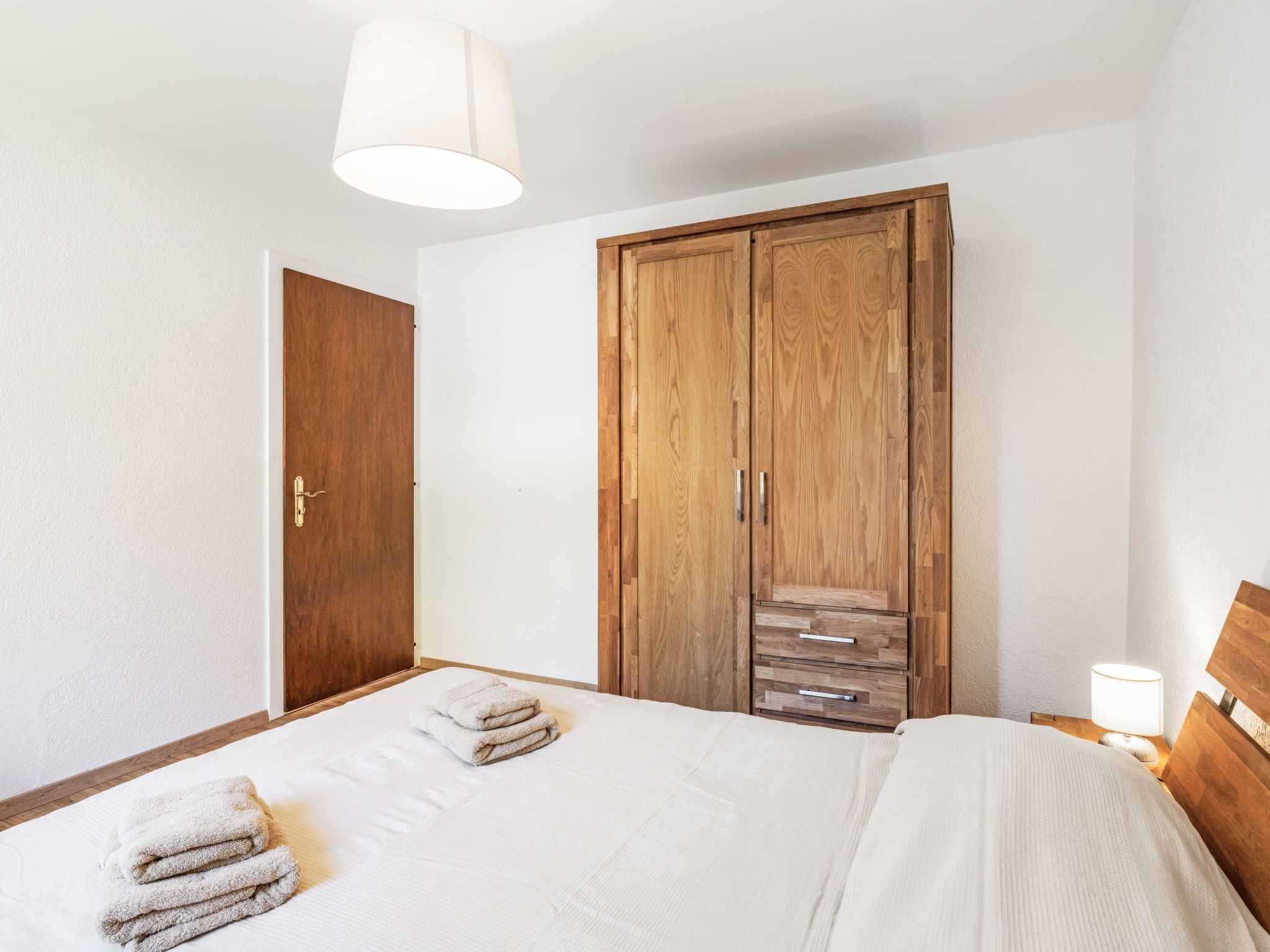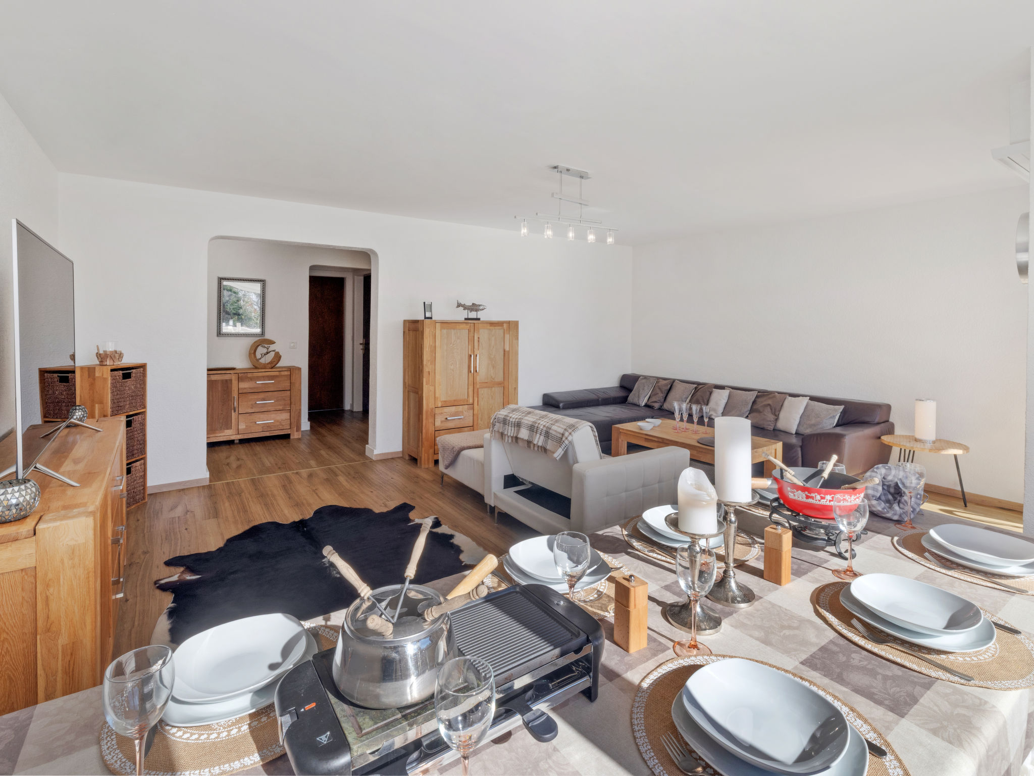 4-Zimmer-Wohnung 100 m2, im erhöhten Erdgeschoss. Vollständig renoviert im Jahre 2016, schön eingerichtet: Wohn-/Esszimmer mit Kabel-TV, Flachbildschirm, Video, Radio und CD. 1 Zimmer mit 1 franz. Bett (180 cm, Länge 200 cm), Kabel-TV (Flachbildschirm). Ausgang zum Balkon, Richtung Süden. 1 Zimmer mit 1 franz. Bett (180 cm, Länge 200 cm). 1 Kinderzimmer mit 2 x 2 Etagenbetten (90 cm, Länge 190 cm). Küche (Backofen, Geschirrspüler, 4 Glaskeramikherd Platten, Toaster, Wasserkocher, Mikrowelle, elektrische Kaffeemaschine, Kapseln für die Kaffeemaschine (Nespresso) extra, Racletteofen, Fondue Set (Chinoise, Käse)) mit Esstisch. Bad/WC, Dusche/WC, Doppelwaschbecken. Grosser Balkon, Südlage. Balkonmöbel, Liegestühle (2). Sicht auf die Berge und die Landschaft. Zur Verfügung: Bügeleisen, Haartrockner. Internet (Wireless LAN, gratis). Garage Nr. 26, Höhe 200 cm, Breite 230 cm. Bitte beachten: Nichtraucher-Unterkunft.