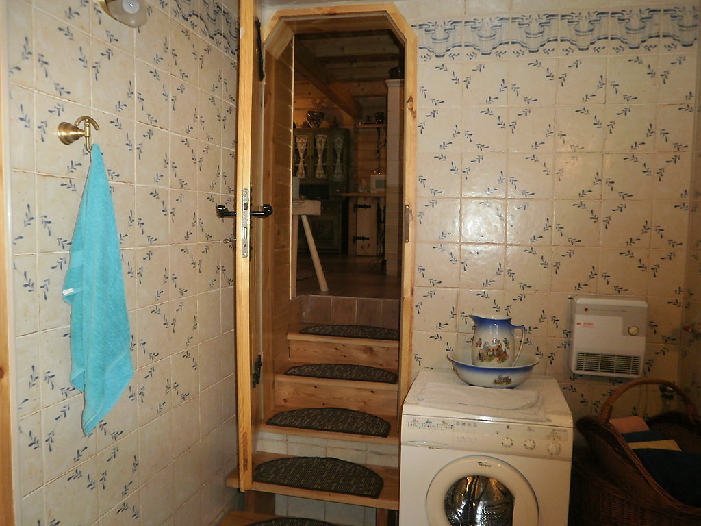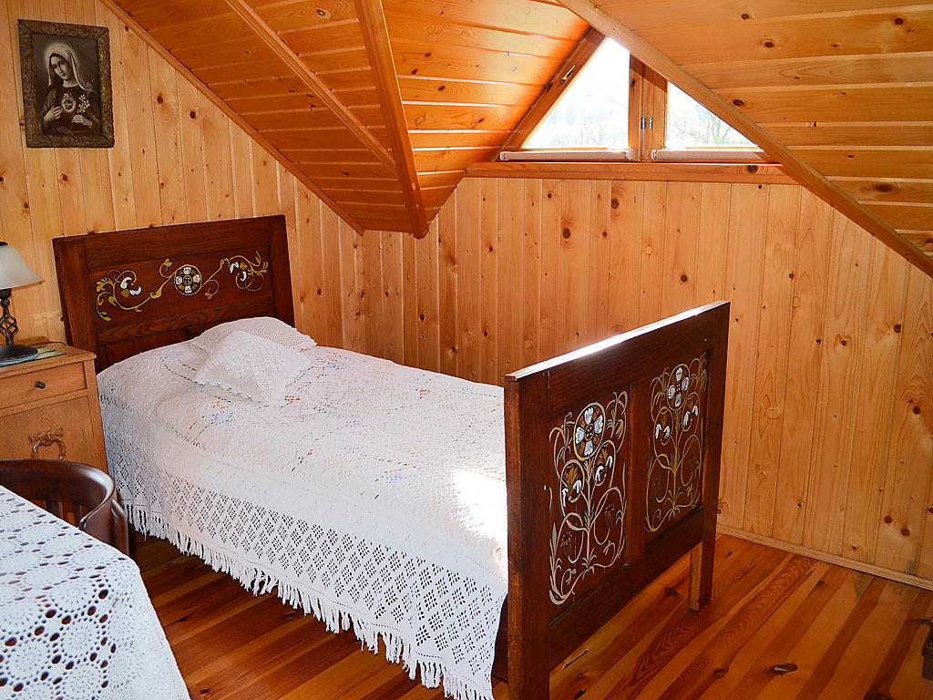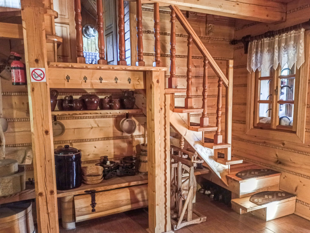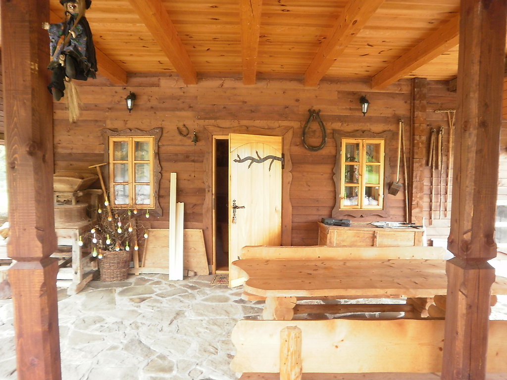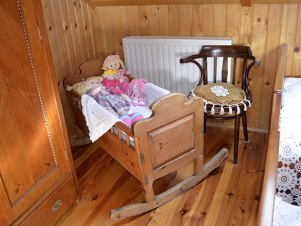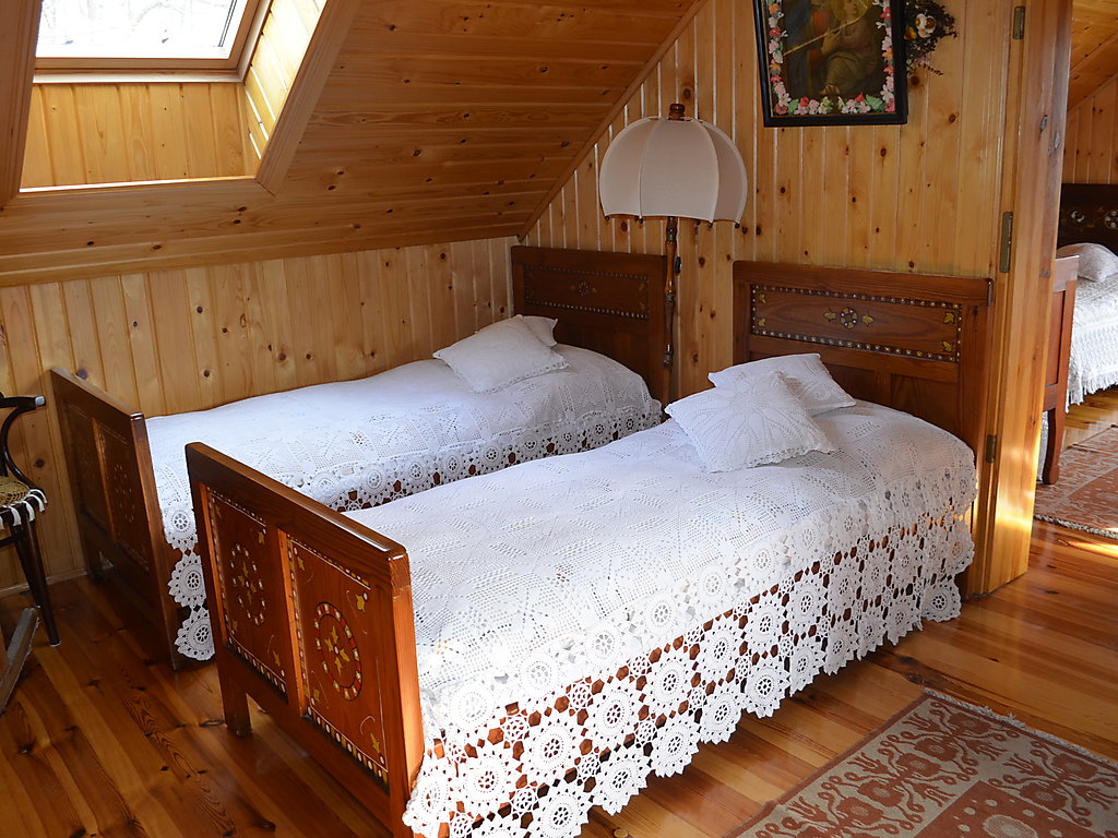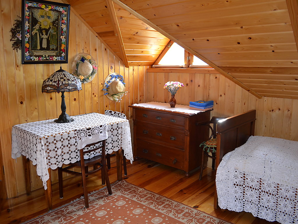 3-Zimmer-Haus 100 m2 auf 2 Stockwerken. Teilweise abgeschrägt, schön und rustikal eingerichtet: Küche (4 Kochplatten, Backofen, Mikrowelle, elektrische Kaffeemaschine). Ausgang zur Terrasse. Bad/Dusche/Bidet/WC. Obergeschoss: abgeschrägtes Wohn-/Schlafzimmer mit 1 Doppeldiwanbett, TV und DVD. Abgeschrägtes, verbundenes Zimmer mit 3 Betten. 1 abgeschrägtes Zimmer mit 2 Betten. Ausgang zum Balkon. Sep. WC. Holzheizung. Terrasse überdacht. Gartengrill. Zur Verfügung: Waschmaschine (extra), Babybett bis 5 Jahre, Holz (gratis). Internet (Wireless LAN, gratis). Weitere Details: Der Ofen in der Küche wird mit Holz oder Kohle geheizt (zum Kochen und Brotbacken) und die Gäste müssen ihre Unterkunft selbst heizen. Das Haus ist im rustikalen Stil mit alten Möbeln ausgestattet.