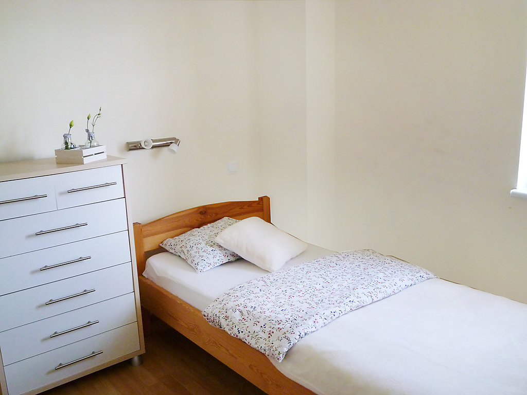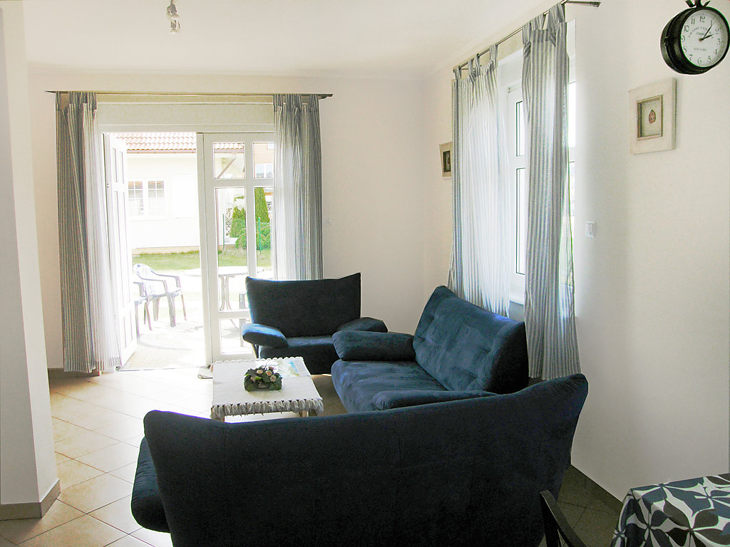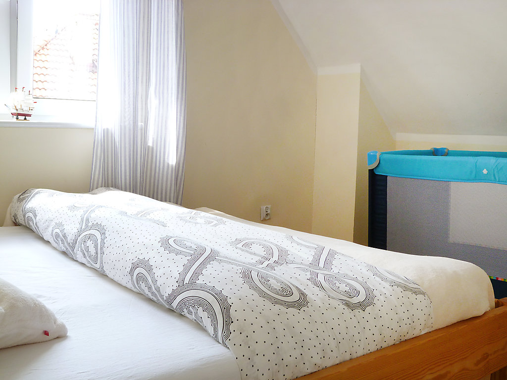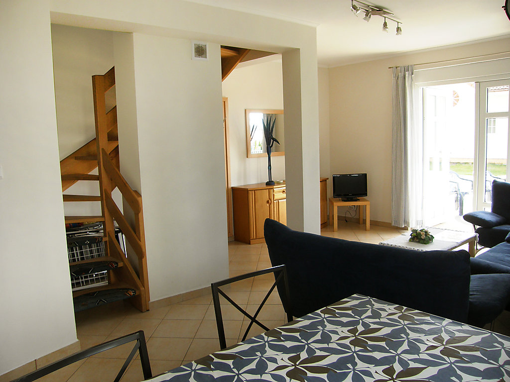 3-Zimmer-Reihenhaus 50 m2. Offenes Wohn-/Esszimmer 18 m2 mit 1 Diwanbett (50 cm, Länge 200 cm), Flachbildschirm. Ausgang zum Garten. Offene Küche (2 Kochplatten). Dusche/WC. Boiler (60 Liter). Dachgeschoss: 1 abgeschrägtes Zimmer 12 m2 mit 2 Betten (90 cm, Länge 200 cm). 1 Zimmer 12 m2 mit 1 Bett (90 cm, Länge 200 cm), 1 franz. Bett (180 cm, Länge 200 cm). Gartensitzplatz 4 m2. Liegestühle (5). Zur Verfügung: Babybett bis 2 Jahre. Parkplatz. Bitte beachten: 1 Haustier/Hund erlaubt. TV nur PL.