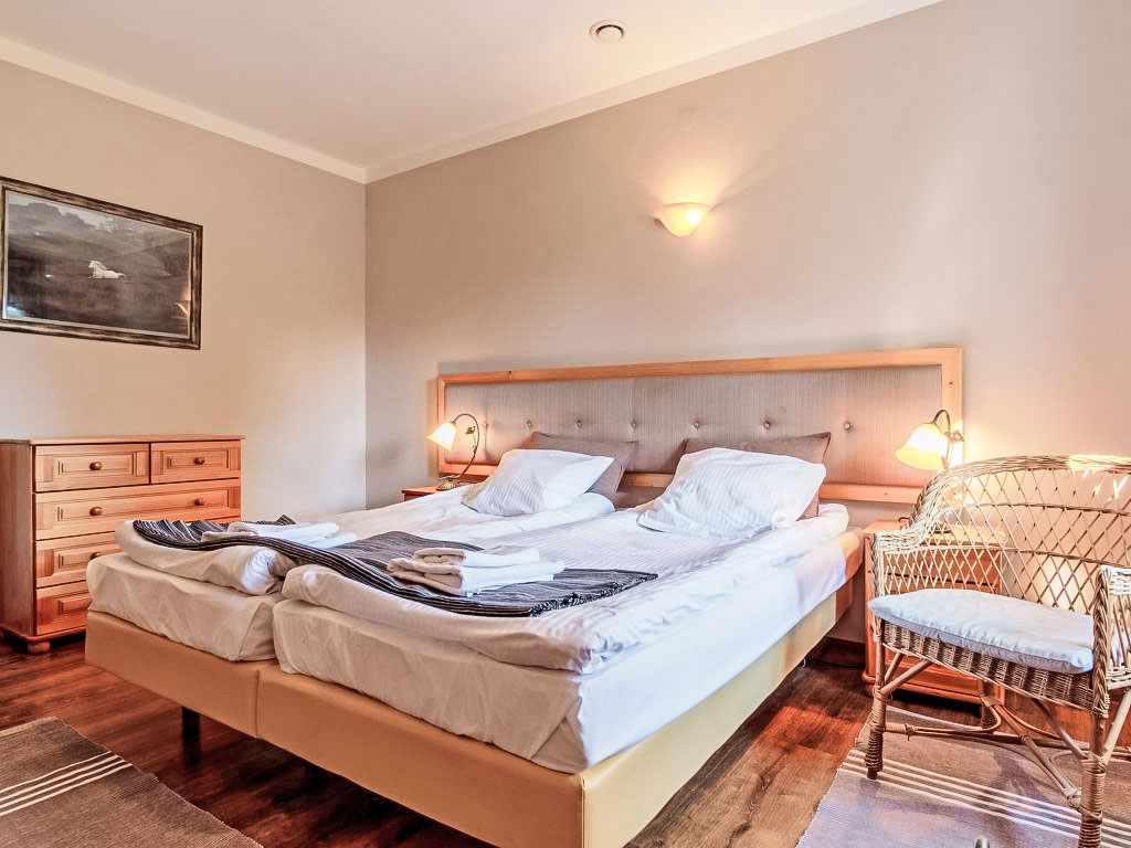 2-Zimmer-Haus 50 m2. Wohn-/Esszimmer 22 m2 mit 1 Doppeldiwanbett (150 cm, Länge 210 cm), Radio und CD. 1 Zimmer 15 m2 mit 2 Betten (90 cm, Länge 200 cm). Küche (4 Kochplatten, Geschirrspüler). Dusche/WC. E-Heizung, Holzheizung. Terrasse 4 m2. Terrassenmöbel. Zur Verfügung: Babybett bis 3 Jahre. 1 Haustier/Hund erlaubt.
