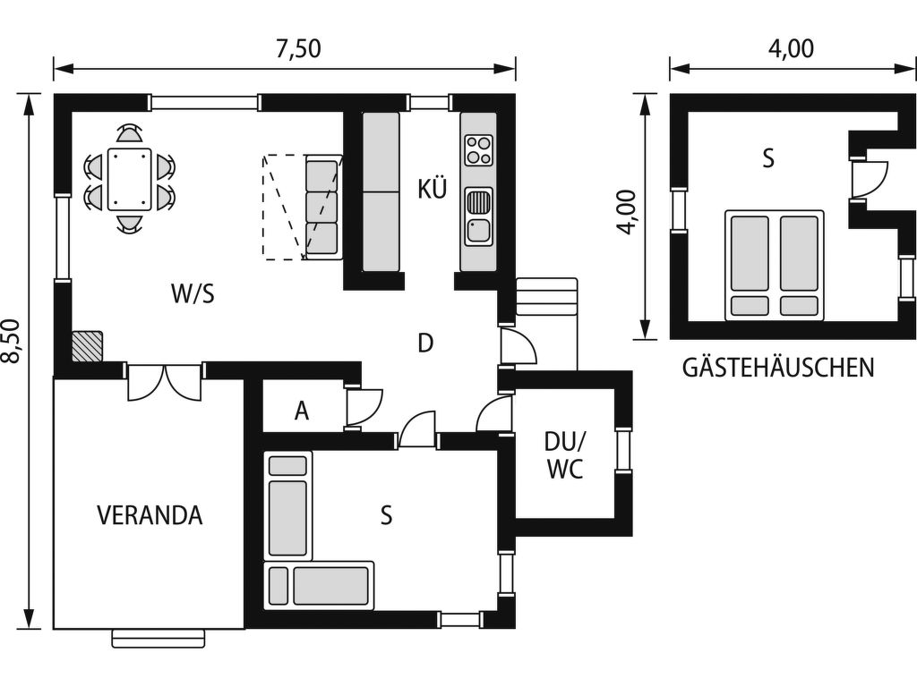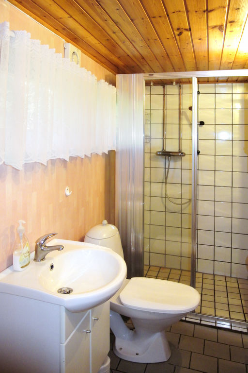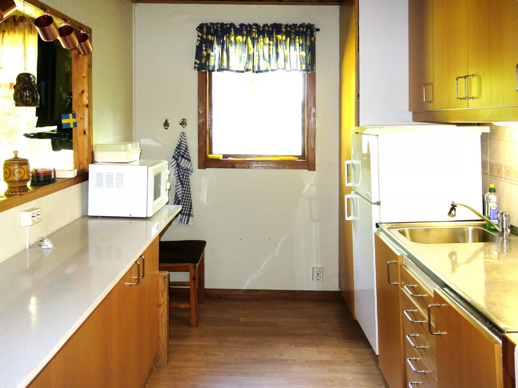 Wohnfläche 53 m². E-Herd 4 Platten, Backofen, Mikrowelle, Kühlschrank, Gefriertruhe (ca. 180 l), Kaffeemaschine, Waschmaschine. Sat-TV (deutsche Programme). Dusche/WC. Elektroheizung, Kaminofen. Das Badezimmer liegt eine Stufe tiefer als die übrigen Räume.