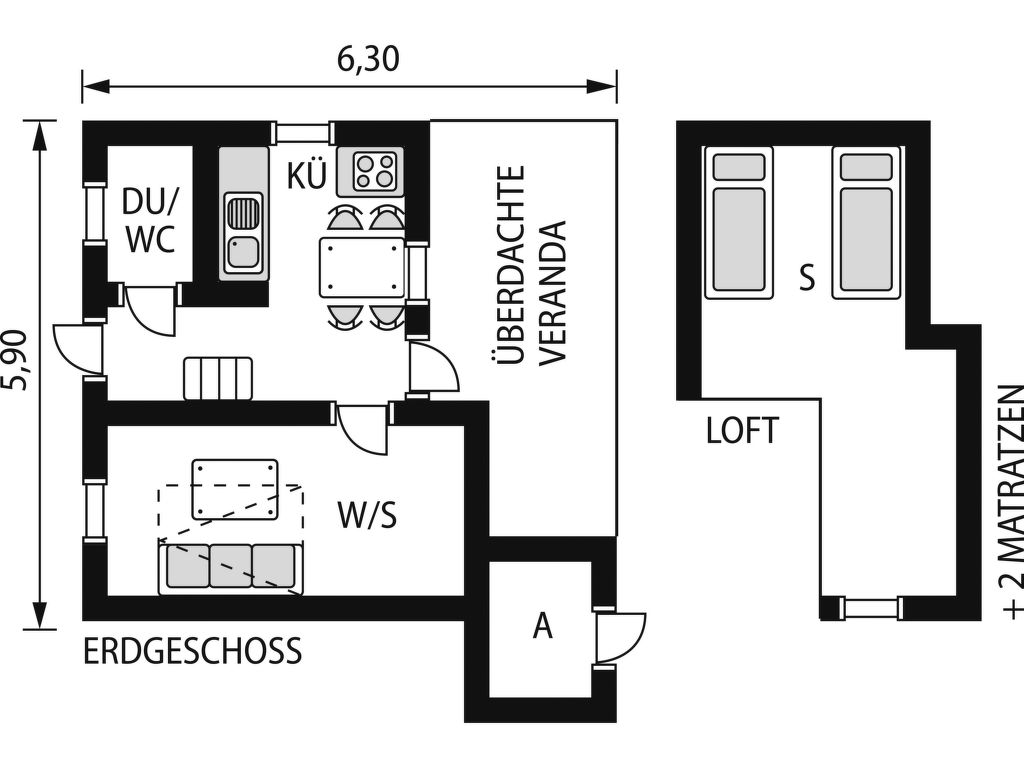 Wohnfläche 44 m². E-Herd 2 Platten, Minibackofen, Mikrowelle, kleiner Geschirrspüler, Kühlschrank, Gefrierschrank (ca. 60 l), Kaffeemaschine, Waschmaschine. Sat-TV (deutsche Programme), Internetzugang (WLAN, Bezahlung). Dusche/WC. Wärmepumpenheizung. Steile Treppe zum Loft, dort max. Höhe 1,60 m. Empfohlene Belegung: 2 Erwachsene und 1 Kind, maximale Belegung: 4 Personen. Ferienhaus VGT 105 ca. 50 m entfernt.