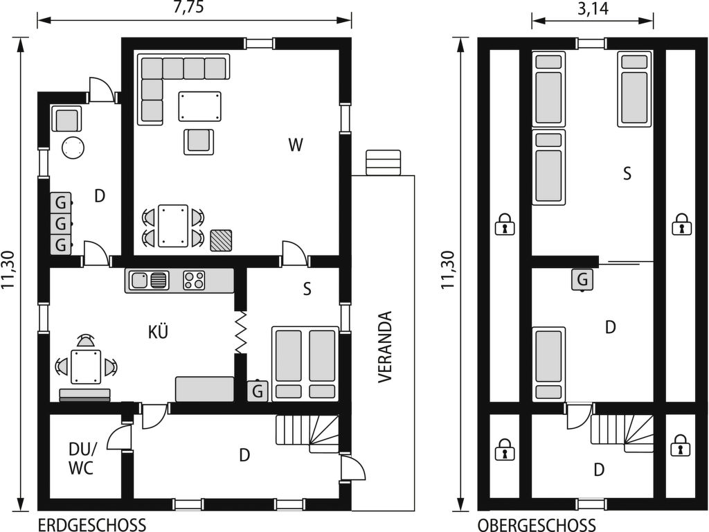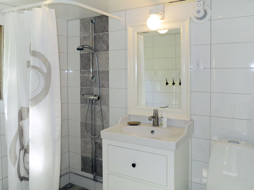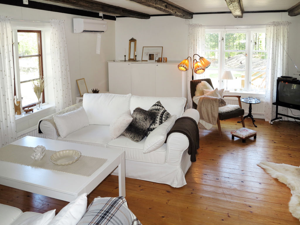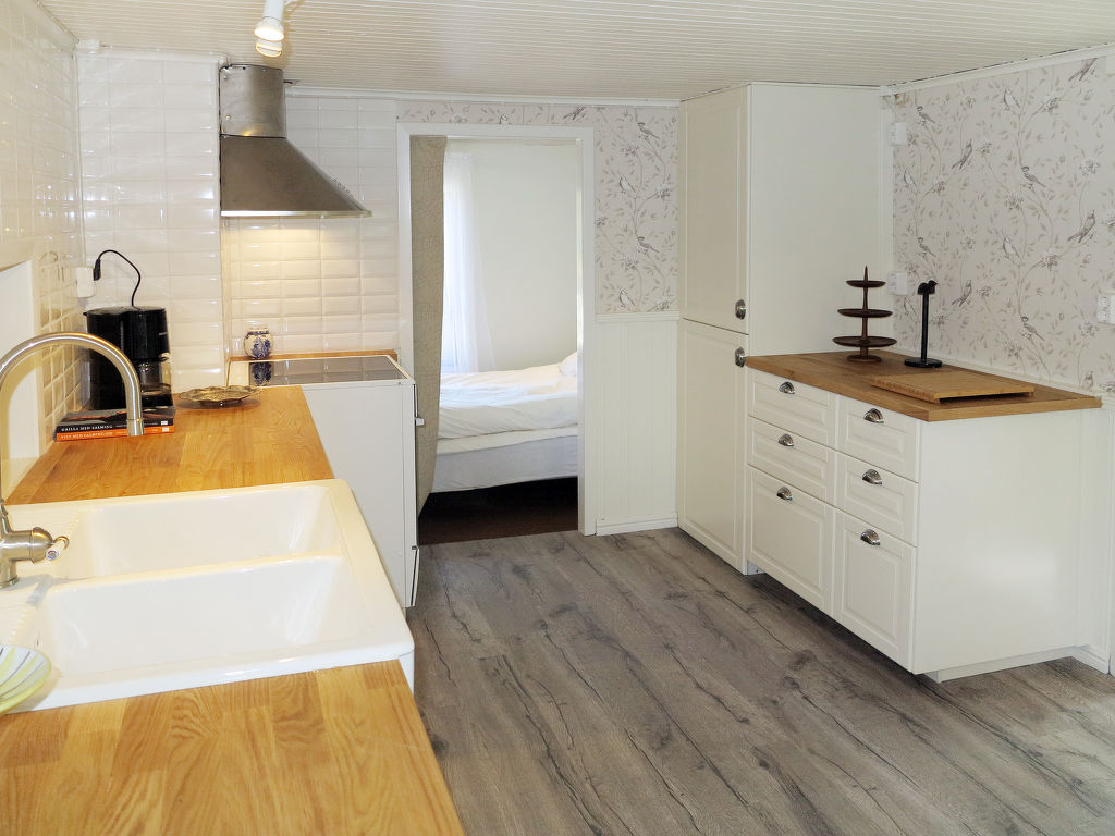 Wohnfläche 93 m². 4 Ceranfelder, Backofen, Mikrowelle, Geschirrspüler, Kühlschrank, Gefrierschrank (ca. 110 l), Kaffeemaschine, Wasserkocher, Toaster, Waschmaschine. Sat-TV (deutsche Programme), Internetzugang (WLAN, Bezahlung). Dusche/WC. Elektroheizung, im Bad Fußbodenheizung. Kamin mit Einsatz. Im Erdgeschoss eine Tür 1,75 m, die übrigen Türen 1,90 m hoch. Raumspartreppe mit hohen Stufen ins Obergeschoss, hier Dachschräge und eingeschränkte Stehhöhe.
