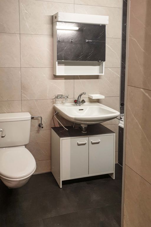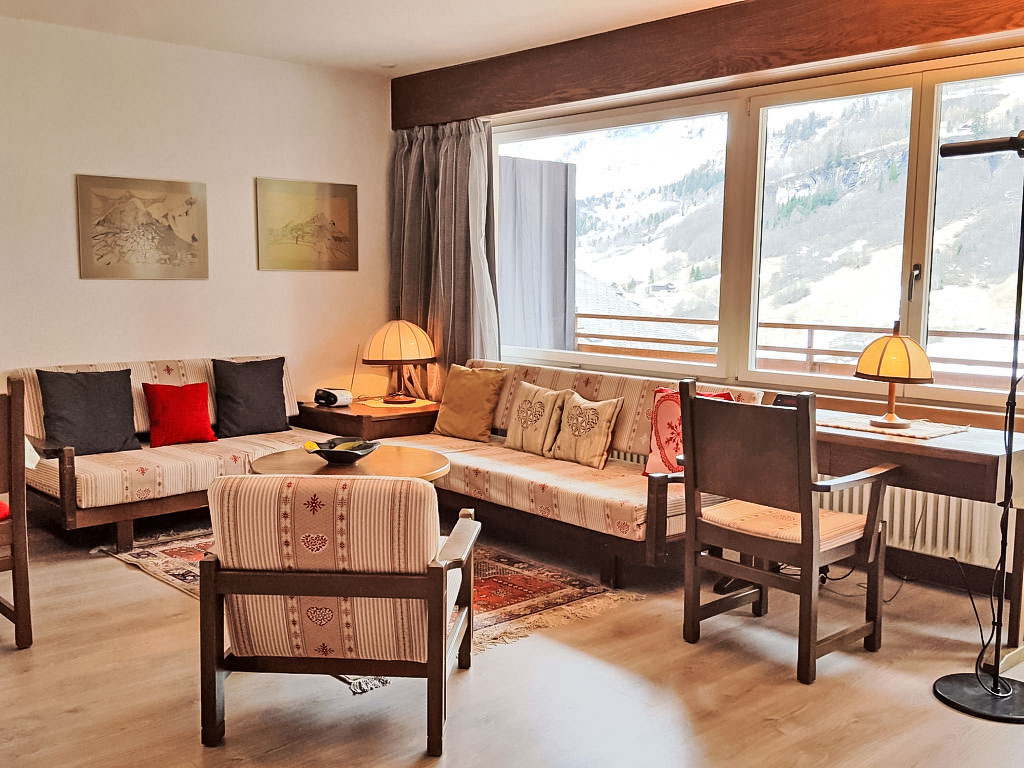 1-Zimmer-Wohnung 54 m2 im 1. Stock. Zweckmässig eingerichtet: Wohn-/Esszimmer mit 2 Wandschrankbetten und Kabel-TV (Flachbildschirm), Radio. Ausgang zum Balkon. Schlafnische mit Vorhang mit 2 Betten. Küche (4 Glaskeramikherd Platten, Mikrowelle, elektrische Kaffeemaschine, Kapseln für die Kaffeemaschine (Nespresso) extra). Bad/WC. Balkon. Terrassenmöbel. Sicht auf die Berge, das Tal und die Landschaft. Zur Verfügung: Internet (Wireless LAN, gratis). Bitte beachten: Nichtraucher-Unterkunft.