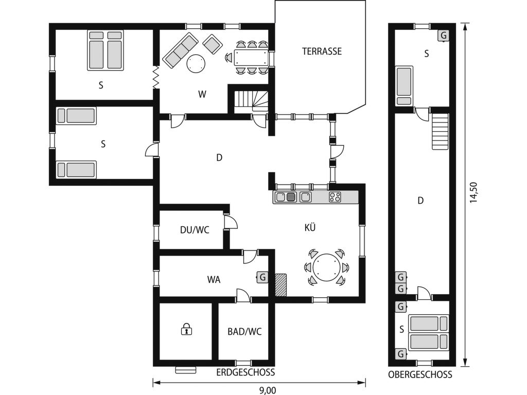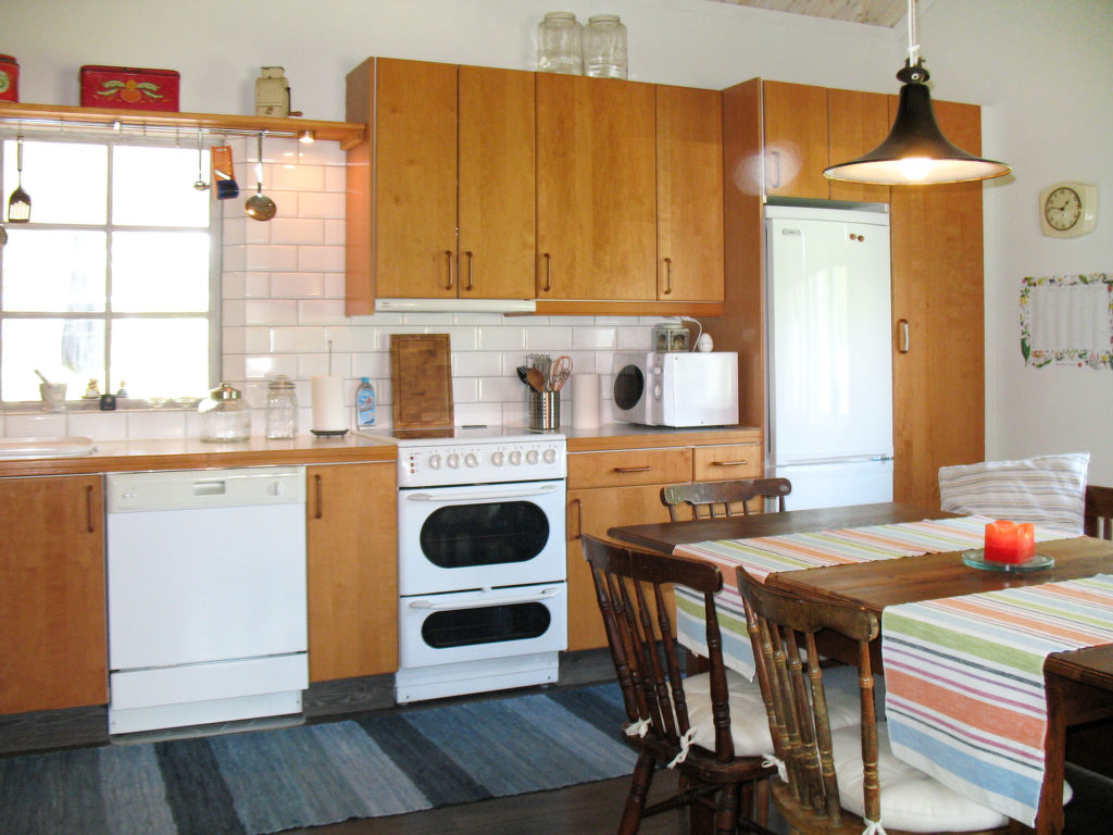 Wohnfläche 150 m². 4 Ceranfelder, Backofen, Mikrowelle, Geschirrspüler, Kühlschrank, Gefrierschrank (ca. 100 l), Kaffeemaschine, Wasserkocher, Toaster, Waschmaschine. Sat-TV (deutsche Programme), DVD. Dusche/WC. Bad/WC. Elektroheizung, in Küche, Diele und Sanitärbereich Fußbodenheizung. Kaminofen. Doppelbett 1,60 m breit. Im Obergeschoss maximale Höhe 2,0 m und Dachschräge.