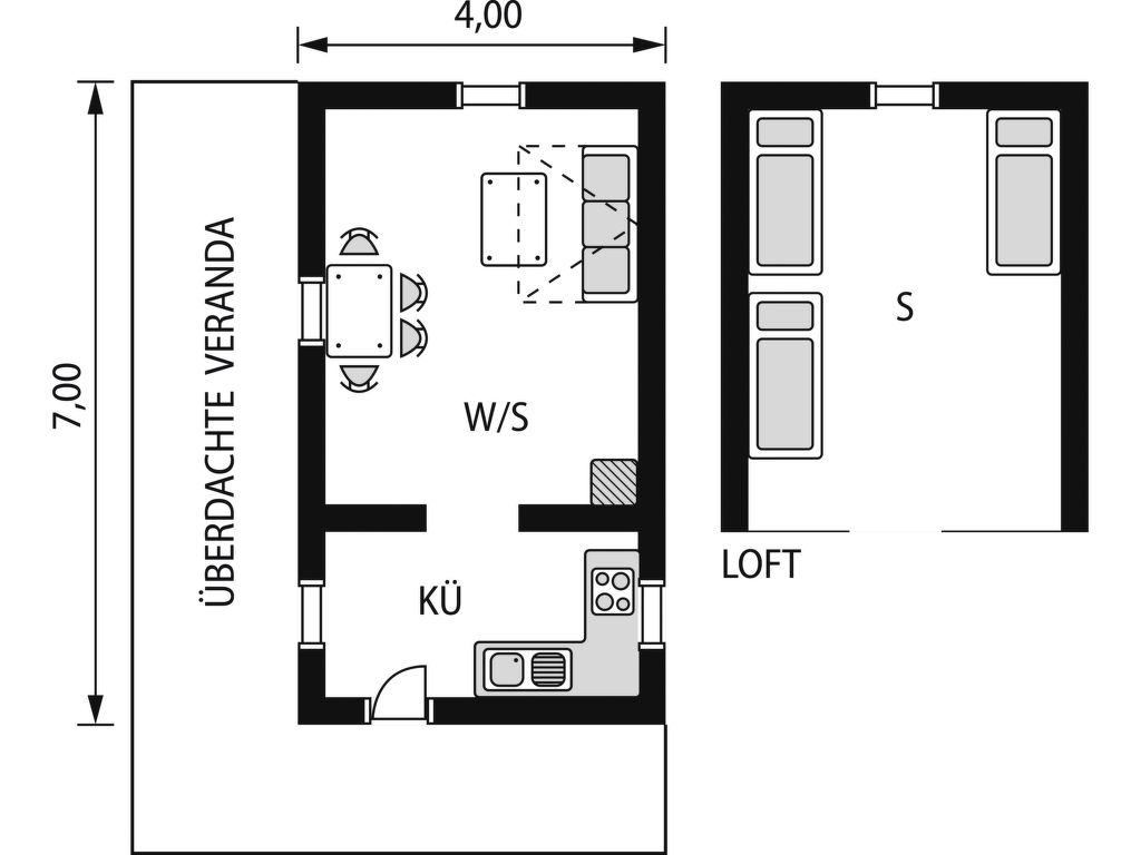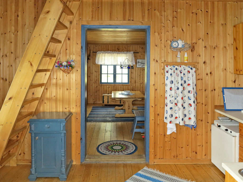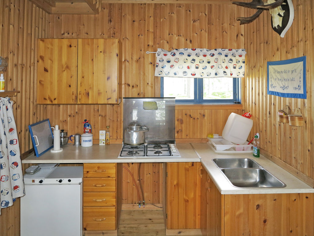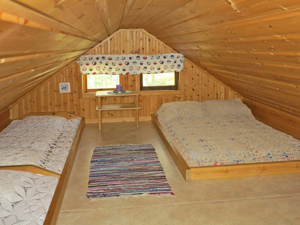 Wohnfläche 28 m². Gasherd 4 Flammen, Gaskühlschrank. Kein Fließwasser, Trinkwasser ist im Laden zu kaufen, Nutzwasser aus dem See. Kein Strom. Gasheizung, Kamin. Kerzen. Streutoilette ca. 30 m. Keine Dusche. Leiter zum Loft, hier keine Stehhöhe. Flexibilität bei der Bettenaufteilung: Es stehen mehr Schlafmöglichkeiten zur Verfügung als die maximal zugelassene Personenzahl, diese darf dennoch nicht überschritten werden.