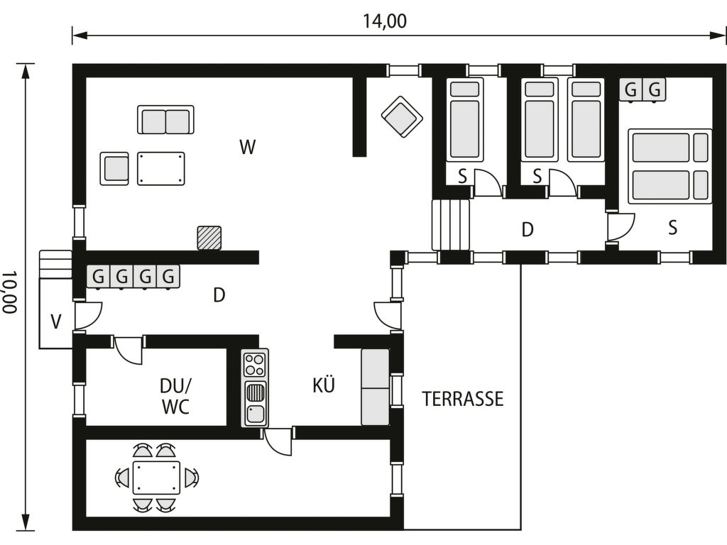 Wohnfläche 100 m². E-Herd 4 Platten, Backofen, Mikrowelle, Kühlschrank, Gefrierschrank (ca. 60 l), Kaffeemaschine, Wasserkocher, Toaster. Sat-TV (deutsche Programme). Dusche/WC. Wärmepumpenheizung (Klimaanlage mit Kühl-/Heizfunktion), Kaminofen. Sanitärhütte mit Waschmaschine und Trockner zur Mitbenutzung ca. 300 m. Hinweis: die Schlafzimmer liegen 5 Treppenstufen höher als der übrige Teil des Hauses.