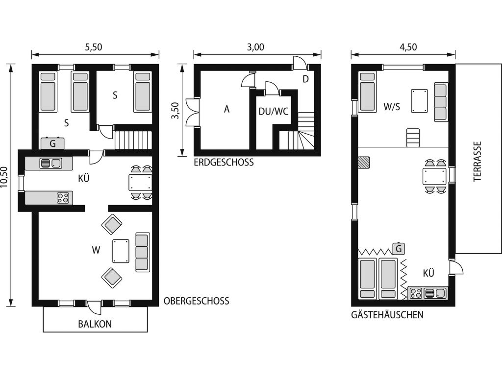 Wohnfläche 105 m². Wohnung: E-Herd 4 Platten, Backofen, Kühlschrank, Kaffeemaschine. TV. Dusche/WC (im Erdgeschoss). Elektroheizung. Steile Treppe ins Obergeschoss.Gästehaus: 2 Platten, Kaffeemaschine, Wasserkocher, Toaster. Kein Fließwasser. TV. Elektroheizung, Kamin mit Einsatz. Hinweis: Rauchen ist im Gästehaus gestattet, in der Dachgeschosswohnung nicht erlaubt.