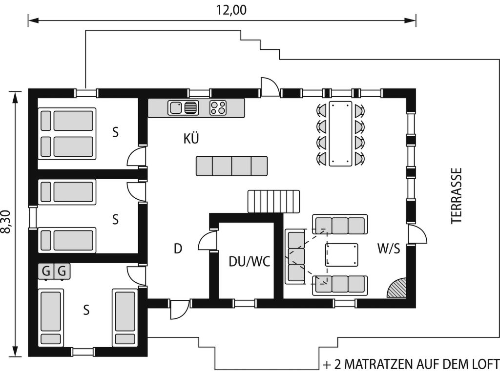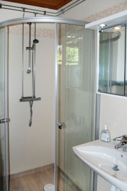 Wohnfläche 84 m². 4 Ceranfelder, Backofen, Mikrowelle, Geschirrspüler, Kühlschrank, Gefrierschrank, Kaffeemaschine, Wasserkocher, Waschmaschine. Sat-TV (deutsche Programme), CD, Internetzugang (WLAN, Bezahlung). Dusche/WC. Elektroheizung, Kamin (Holz steht zur Verfügung). Doppelbett 1,45 m breit. Flexibilität bei der Bettenaufteilung: Es stehen mehr Schlafmöglichkeiten zur Verfügung als die maximal zugelassene Personenzahl, diese darf dennoch nicht überschritten werden.