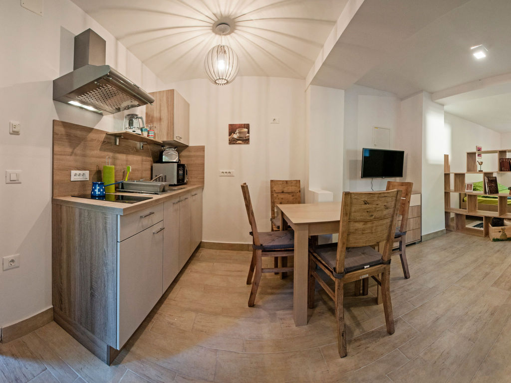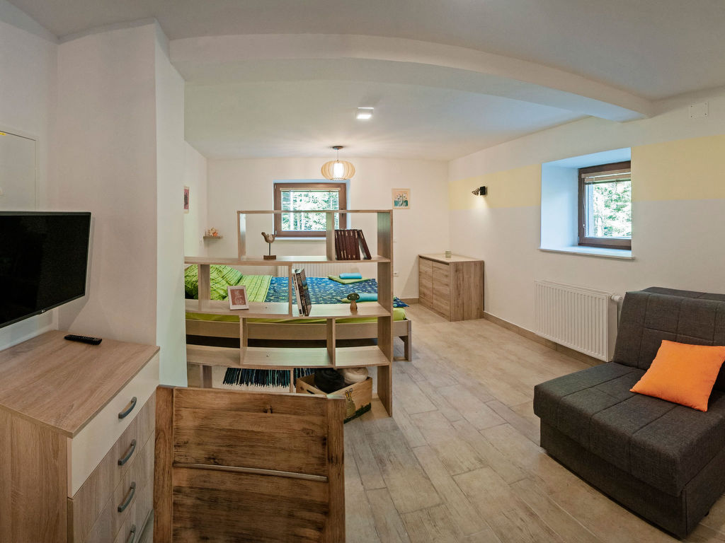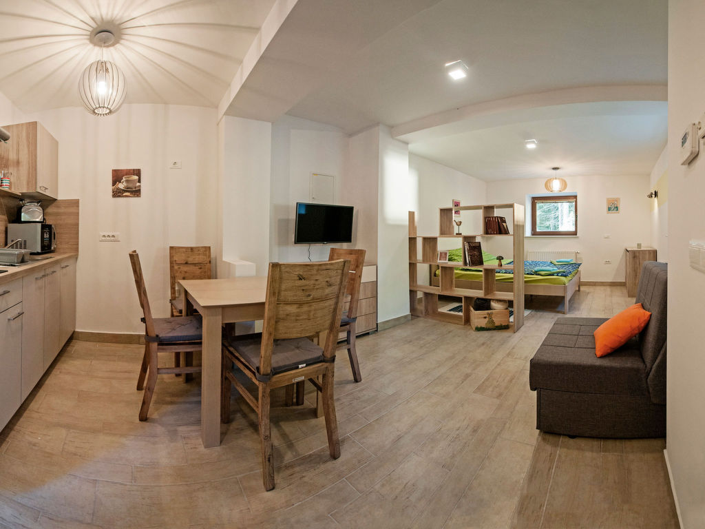 "Apartma Zajec", 1-Zimmer-Wohnung 34 m2, unteres Geschoss. Gemütlich eingerichtet: Wohn-/Schlafzimmer mit 1 Doppelbett und Kabel-TV (Flachbildschirm). Wohnküche (2 Glaskeramikherd Platten, Mikrowelle) mit Esstisch. Dusche/WC. G-Heizung. Zur Verfügung: Waschmaschine. Internet (Wireless LAN).