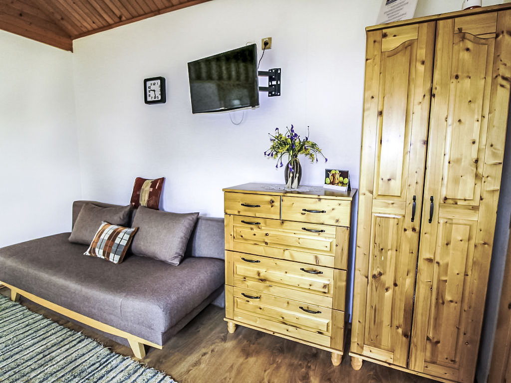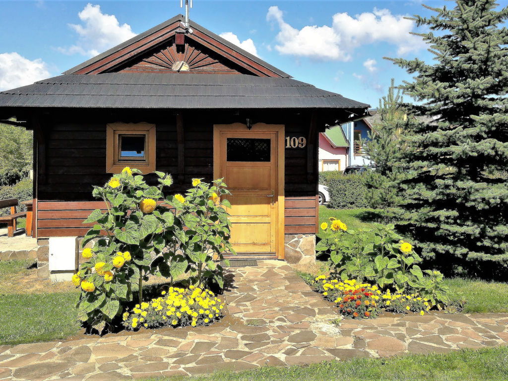 "Chalet 109", 2-Zimmer-Chalet. Geräumig und hell, sehr zweckmässig und komfortabel eingerichtet: Eingang. Offenes grosses Wohn-/Schlafzimmer mit 1 Doppeldiwanbett, Esstisch, Küchenblock, Sat-TV, Radio und Stereoanlage. Ausgang zur Terrasse. 1 abgeschrägtes Doppelzimmer mit 1 Bett. Kochnische (2 Kochplatten, Wasserkocher, Mikrowelle, Tiefkühler, elektrische Kaffeemaschine). Dusche/WC. Zur Verfügung: Internet (Wireless LAN, gratis).