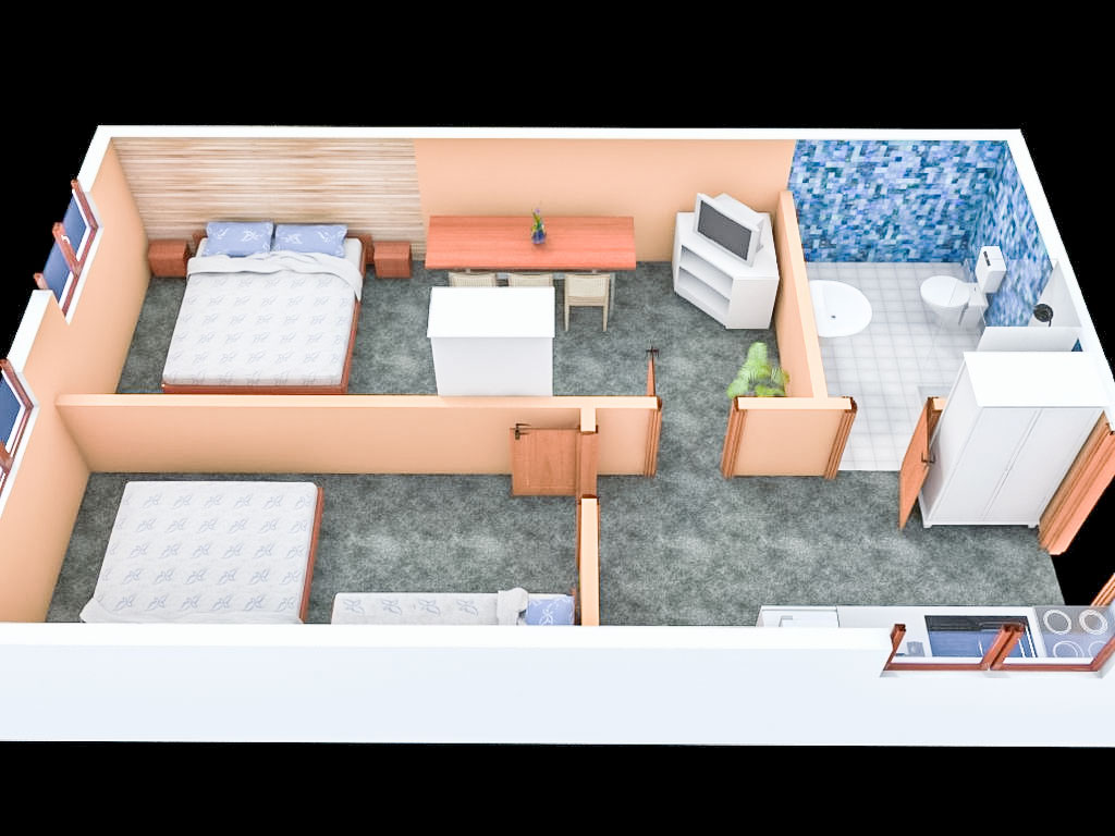 2-Zimmer-Wohnung 46 m2. 1 Zimmer mit 1 Bett, 1 Doppelbett, Sat-TV, Radio und CD. 1 Zimmer mit 1 Doppelbett. Kochnische im Eingang (2 Kochplatten, Geschirrspüler, Wasserkocher, Mikrowelle, Tiefkühler, elektrische Kaffeemaschine) mit Esstisch. Dusche/WC. Bodenheizung, Boiler. Zur Verfügung: Internet (Wireless LAN, gratis).