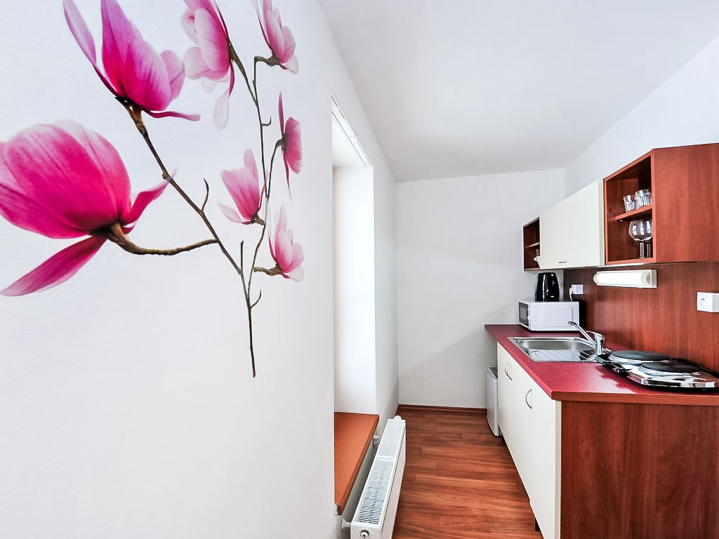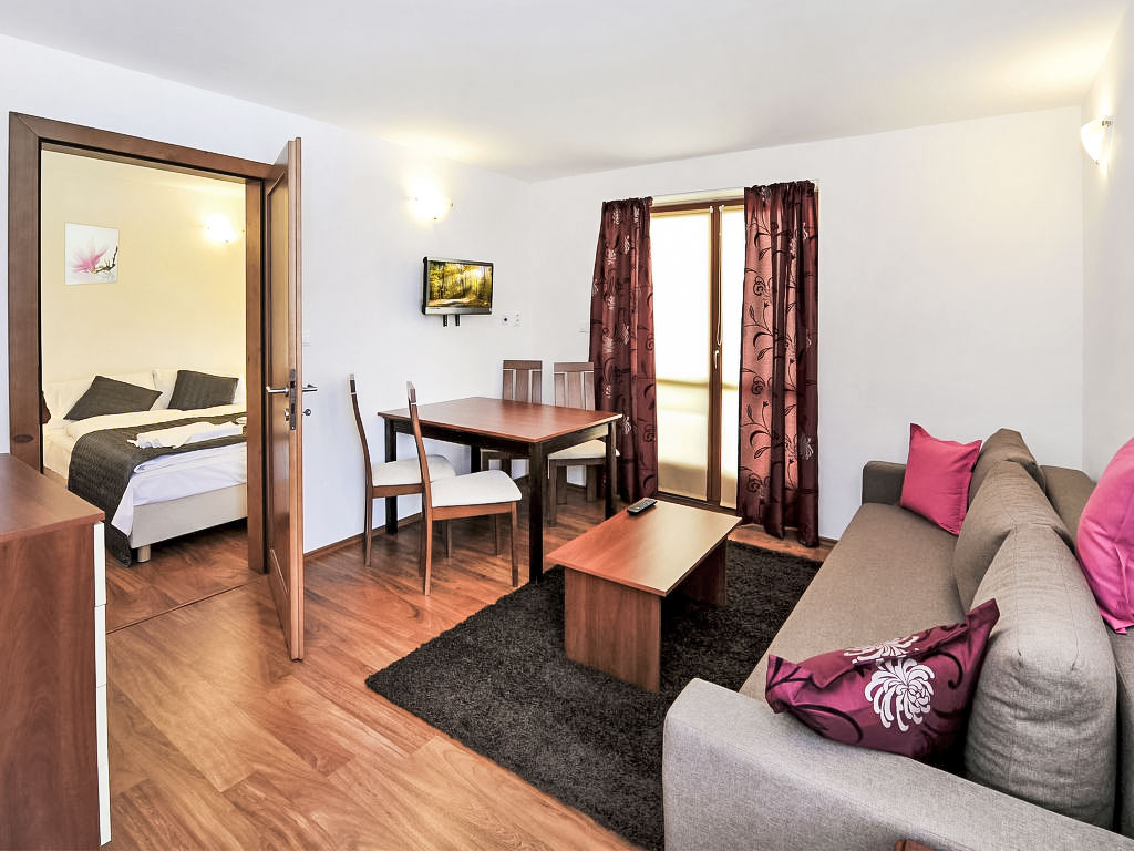 "Magnólia", 2-Zimmer-Wohnung 50 m2. Modern eingerichtet: Wohn-/Schlafzimmer mit 1 Doppeldiwanbett, Esstisch, Sat-TV und Radio. 1 Zimmer mit 1 Bett und 1 Doppelbett. Kochnische (2 Kochplatten, Mikrowelle). Dusche/WC. Zur Verfügung: Babybett (extra). Internet (Wireless LAN, gratis). Bitte beachten: Nichtraucher-Haus.