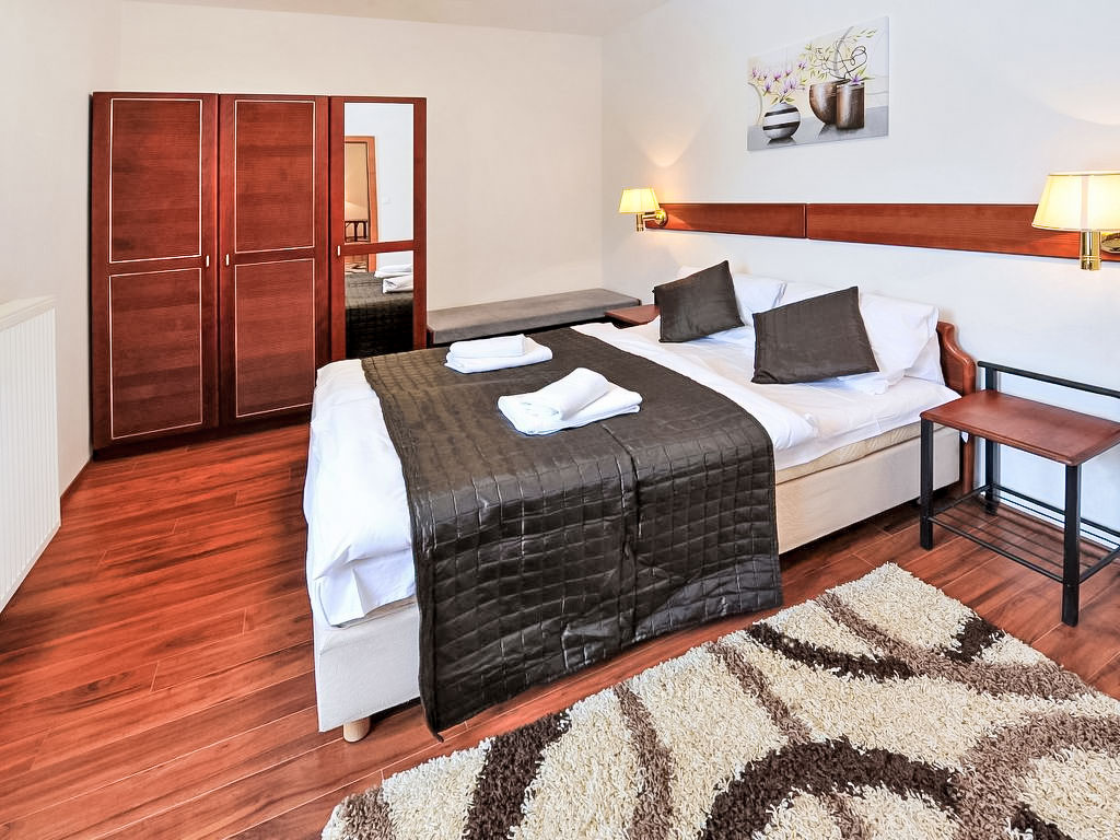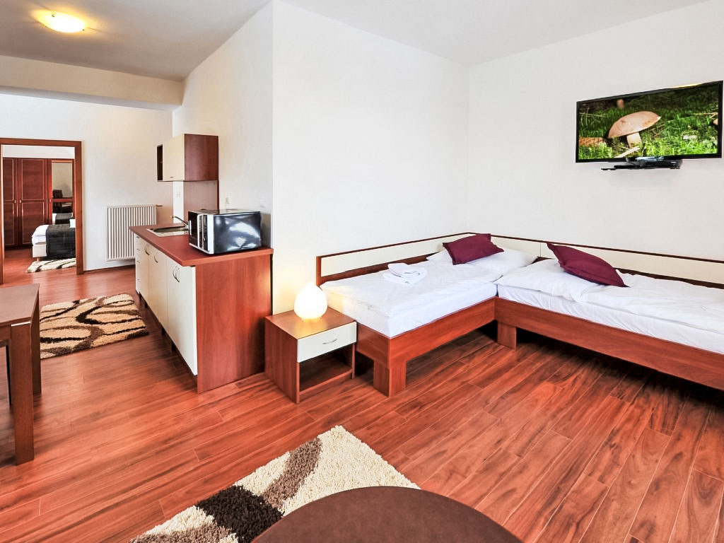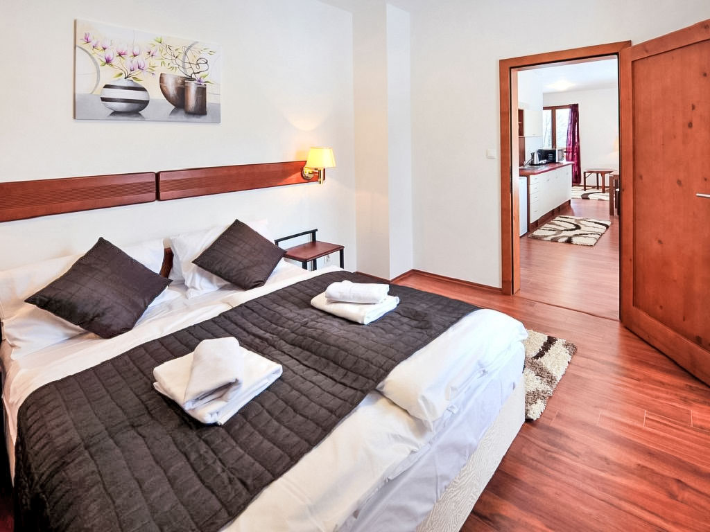 "Magnólia", 2-Zimmer-Wohnung 65 m2. Modern eingerichtet: Wohn-/Schlafzimmer mit 1 Doppeldiwanbett, 1 Doppelbett, Esstisch, Sat-TV und Radio. 1 Zimmer mit 1 Doppelbett. Kochnische (2 Kochplatten, Mikrowelle). Dusche/WC. Zur Verfügung: Babybett (extra). Internet (Wireless LAN, gratis). Bitte beachten: Nichtraucher-Haus.