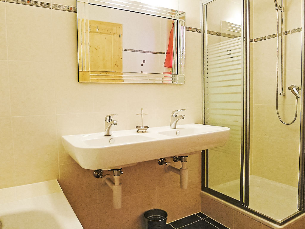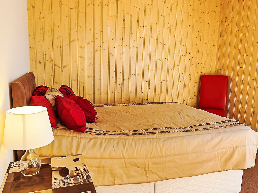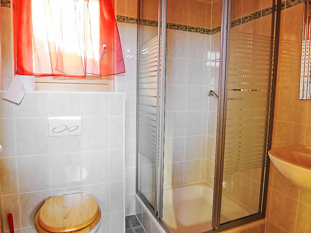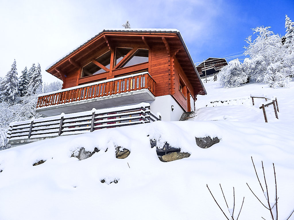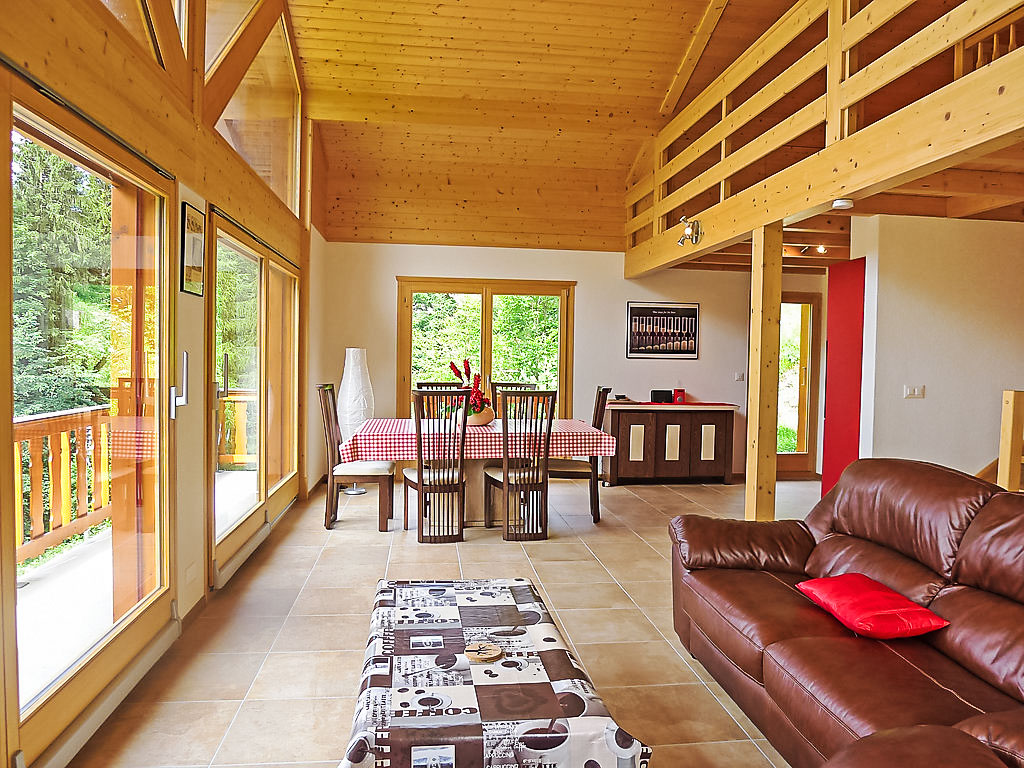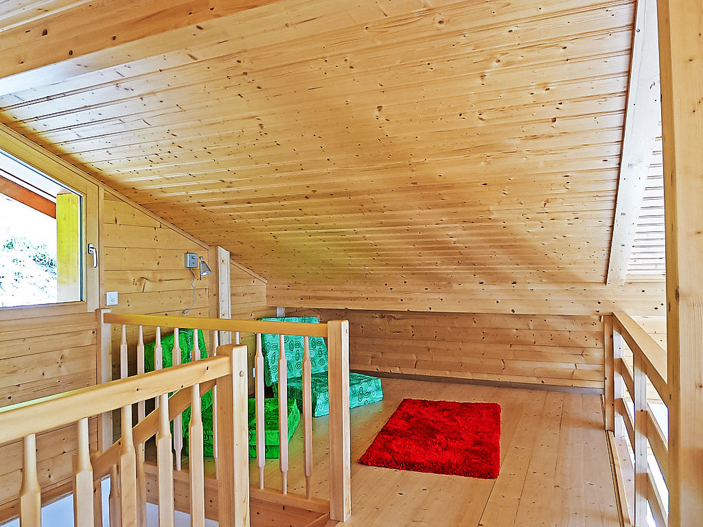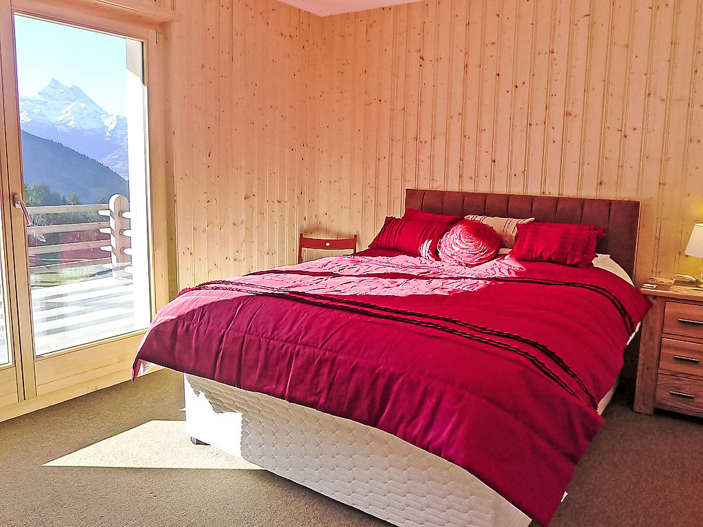 "Chalet Double Rouge", 4-Zimmer-Chalet 125 m2 auf 2 Stockwerken, Südlage. Schön und modern eingerichtet: Wohn-/Esszimmer mit Esstisch. Ausgang zum Balkon, Richtung Süden. Offene Küche (Backofen, Geschirrspüler, 4 Glaskeramikherd Platten). Ausgang zum Garten. Dusche/WC. Unteres Geschoss: 1 kleines Zimmer mit 1 franz. Bett (140 cm, Länge 200 cm). 1 Zimmer mit 1 franz. Bett (140 cm, Länge 200 cm). Ausgang zur Terrasse, Richtung Süden. 1 kleines Zimmer mit 1 franz. Bett (140 cm, Länge 200 cm). Ausgang zur Terrasse, Richtung Süden. Bad/WC, Doppelwaschbecken. Obergeschoss: abgeschrägt, offen 1 Kinderzimmer, Deckenhöhe 210 - 140 cm, ohne Schrank mit 1 Schlafmöglichkeit (75 cm, Länge 180 cm). Grosser Balkon, Südlage, grosse Terrasse 30 m2, Südlage. Terrassenmöbel. Sehr schöne Panoramasicht auf die Berge. Zur Verfügung: Waschmaschine.