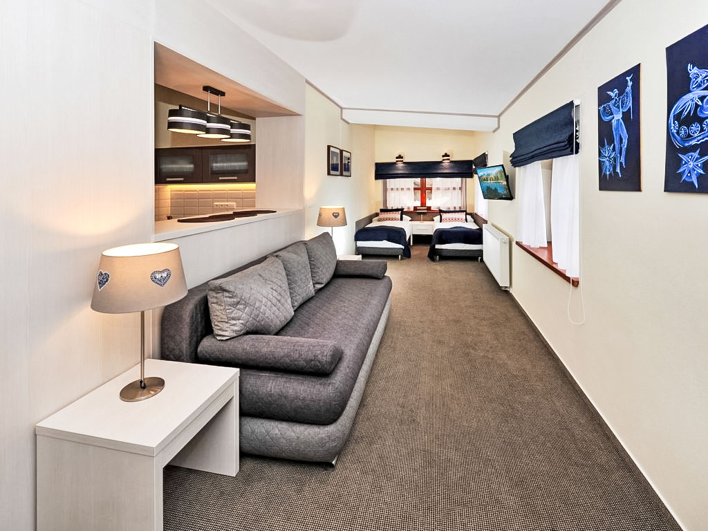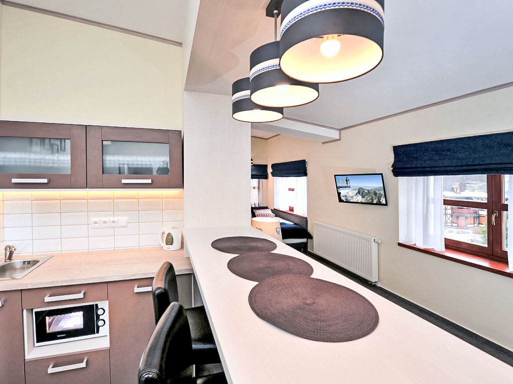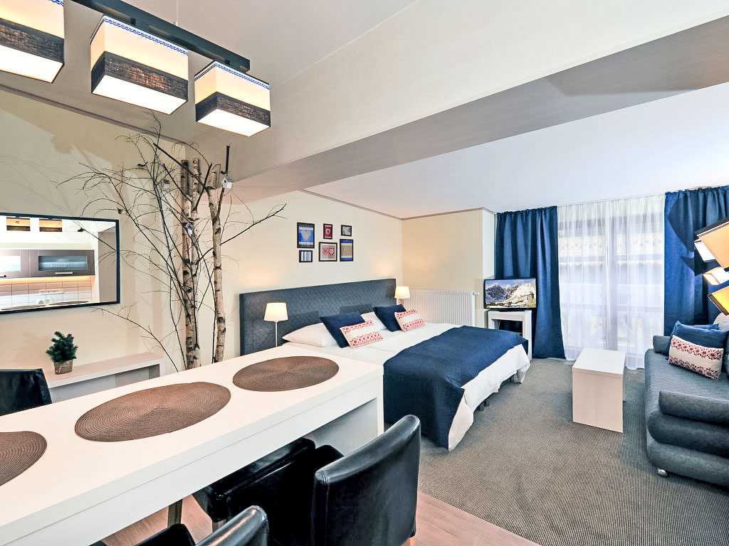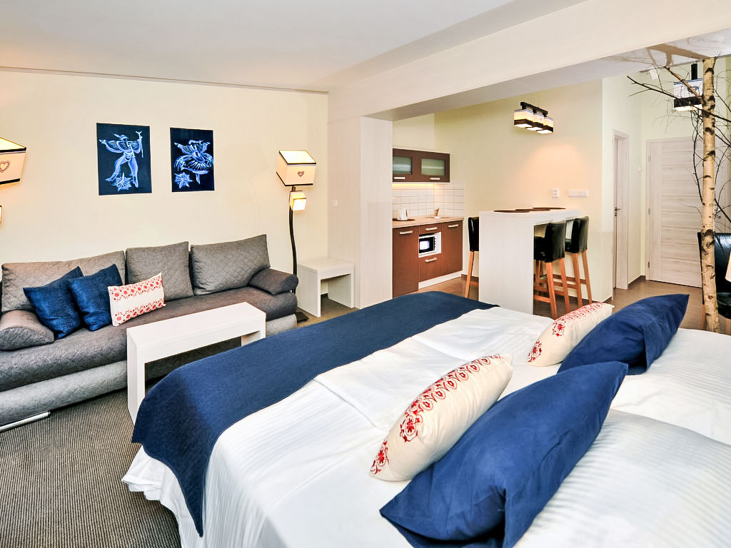 "Kamzík", 1-Zimmer-Studio 25 m2. Wohn-/Schlafzimmer mit 1 Doppeldiwanbett, 1 Doppelbett und Sat-TV. Kochnische (2 Kochplatten, Mikrowelle). Dusche/WC. Zur Verfügung: Kinderhochstuhl, Babybett. Internet (Wireless LAN, gratis). Bitte beachten: geeignet für Familien. Nichtraucher-Unterkunft.