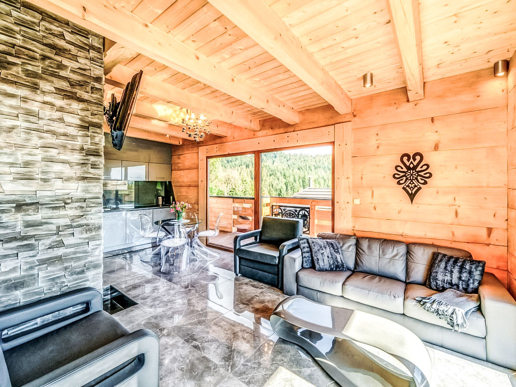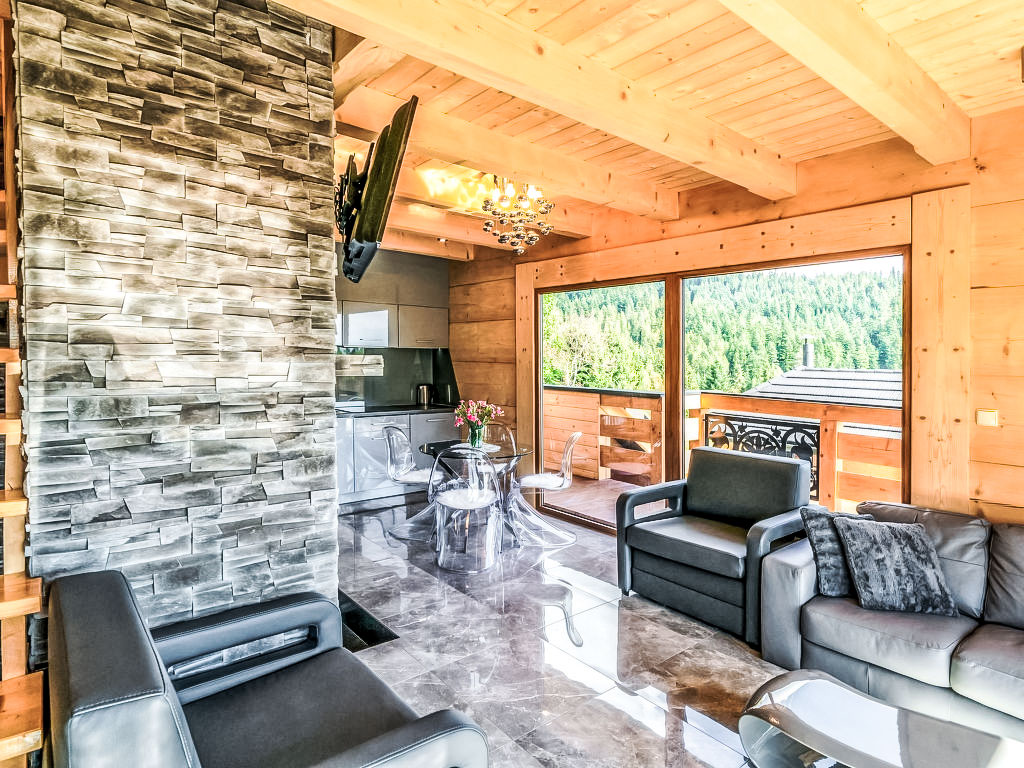 4-Zimmer-Chalet 110 m2 auf 3 Stockwerken. Offener Salon mit 1 Diwanbett, Esstisch und Kabel-TV. Offene Küche (Geschirrspüler, 1 Induktionskochplatten, Mikrowelle, Tiefkühler, elektrische Kaffeemaschine). Sep. WC. Obergeschoss: 1 Zimmer mit 1 Doppelbett (160 cm, Länge 200 cm), TV und E-Heizung. 1 Zimmer mit 1 Bett (120 cm, Länge 200 cm), 1 Doppelbett (160 cm, Länge 200 cm), TV und E-Heizung. Dusche/WC. Holzheizung, Fussbodenheizung. Balkon 2 m2, Terrasse 17 m2. Balkonmöbel. Panoramasicht auf die Berge. Zur Verfügung: Internet (Wireless LAN). Maximal 2 kleine Haustiere/Hunde erlaubt.