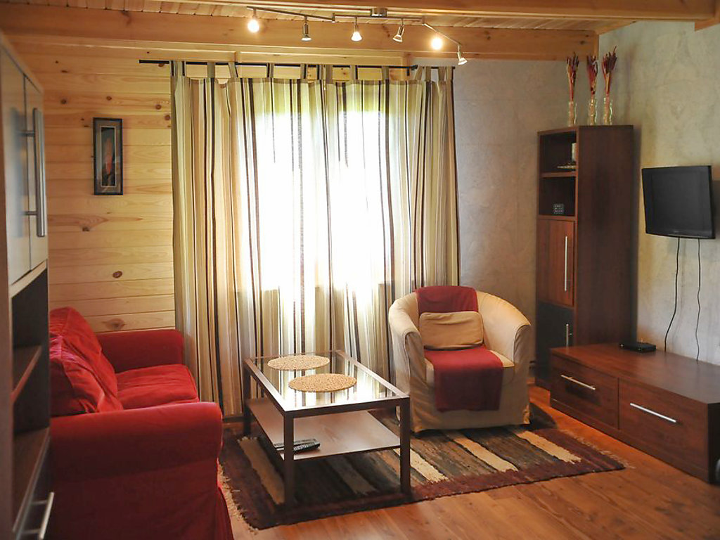 3-Zimmer-Haus 40 m2 auf 2 Stockwerken. Teilweise abgeschrägt, schön und gemütlich eingerichtet: Wohn-/Schlafzimmer 18 m2 mit 1 Doppeldiwanbett, Schwedenofen und Sat-TV (Flachbildschirm). Ausgang zur Terrasse. Kochnische 5 m2 (4 Kochplatten). Dusche/WC. Dachgeschoss: 1 abgeschrägtes Zimmer mit 1 Doppelbett. 1 abgeschrägtes Zimmer mit 2 Betten. Grosse Terrasse. Terrassenmöbel. Sehr schöne Sicht auf die Berge, die Landschaft und den Fluss. Parkplatz beim Haus.