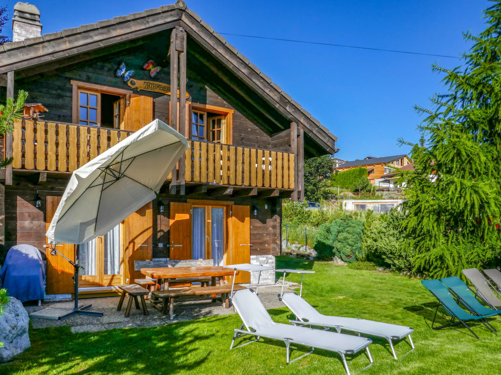 "Mirabeau", 4-Zimmer-Chalet 83 m2 auf 2 Stockwerken, Ostlage. Teilweise abgeschrägt, komfortabel und schön eingerichtet: Eingang. Wohn-/Esszimmer mit offenem Kamin, Kabel-TV, Stereoanlage und DVD. Ausgang zum Garten, zur Terrasse. Offene Küche (Backofen, Geschirrspüler, 4 Glaskeramikherd Platten, elektrische Kaffeemaschine, Kapseln für die Kaffeemaschine (Nespresso) extra, Racletteofen, Fondue Set (Käse)). Ausgang zur Veranda. Sep. WC. Obergeschoss: 1 Zimmer mit 1 franz. Bett (160 cm, Länge 200 cm). Ausgang zum Balkon, Richtung Osten. 1 kleines Kinderzimmer mit 1 x 2 Etagenbetten (80 cm, Länge 200 cm). 1 Zimmer mit 1 Doppelbett (2 x 90 cm, Länge 200 cm). Ausgang zum Balkon, Richtung Osten. Dusche/WC. Balkon, Ostlage, Terrasse, Ostlage. Terrassenmöbel, Gartengrill (mobil), Liegestühle (4), Wintergarten. Sehr schöne Sicht auf die Berge und das Tal. Zur Verfügung: Waschmaschine, Wäschetrockner, Kinderhochstuhl, Babybett, Haartrockner. Internet (Wireless LAN, gratis). Parkplatz. Bitte beachten: Nichtraucher-Unterkunft. 1 Haustier/Hund erlaubt. Unbeheizte Veranda. Warmwasser begrenzt.