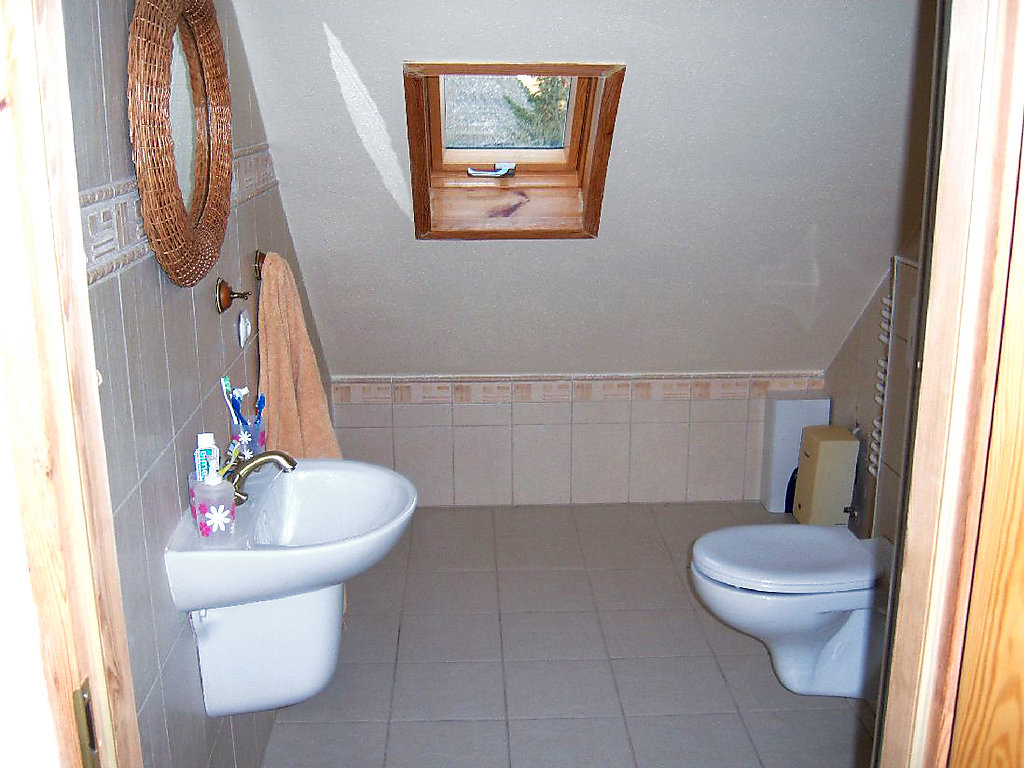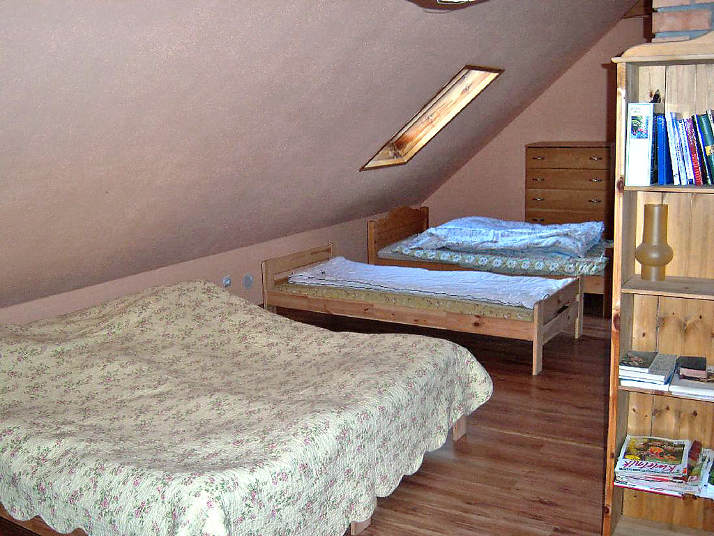 3-Zimmer-Haus 120 m2 auf 2 Stockwerken. Teilweise abgeschrägt, rustikal und gemütlich eingerichtet: offenes Wohn-/Schlafzimmer mit 1 Doppeldiwanbett, offenem Kamin und Radio. Ausgang zur Terrasse, zum Gartensitzplatz. 1 Zimmer mit 1 Doppelbett. Offene Küche (Backofen, 4 Glaskeramikherd Platten) mit Esstisch, Holzofen. Dusche/WC. Dachgeschoss: 1 abgeschrägtes, offenes grosses Zimmer mit 4 Betten und Sat-TV. Dusche/WC. Holzheizung. Terrasse 12 m2. Terrassenmöbel, Liegestühle (8). Sicht auf den Garten. Zur Verfügung: Waschmaschine, Haartrockner, Holz (gratis).