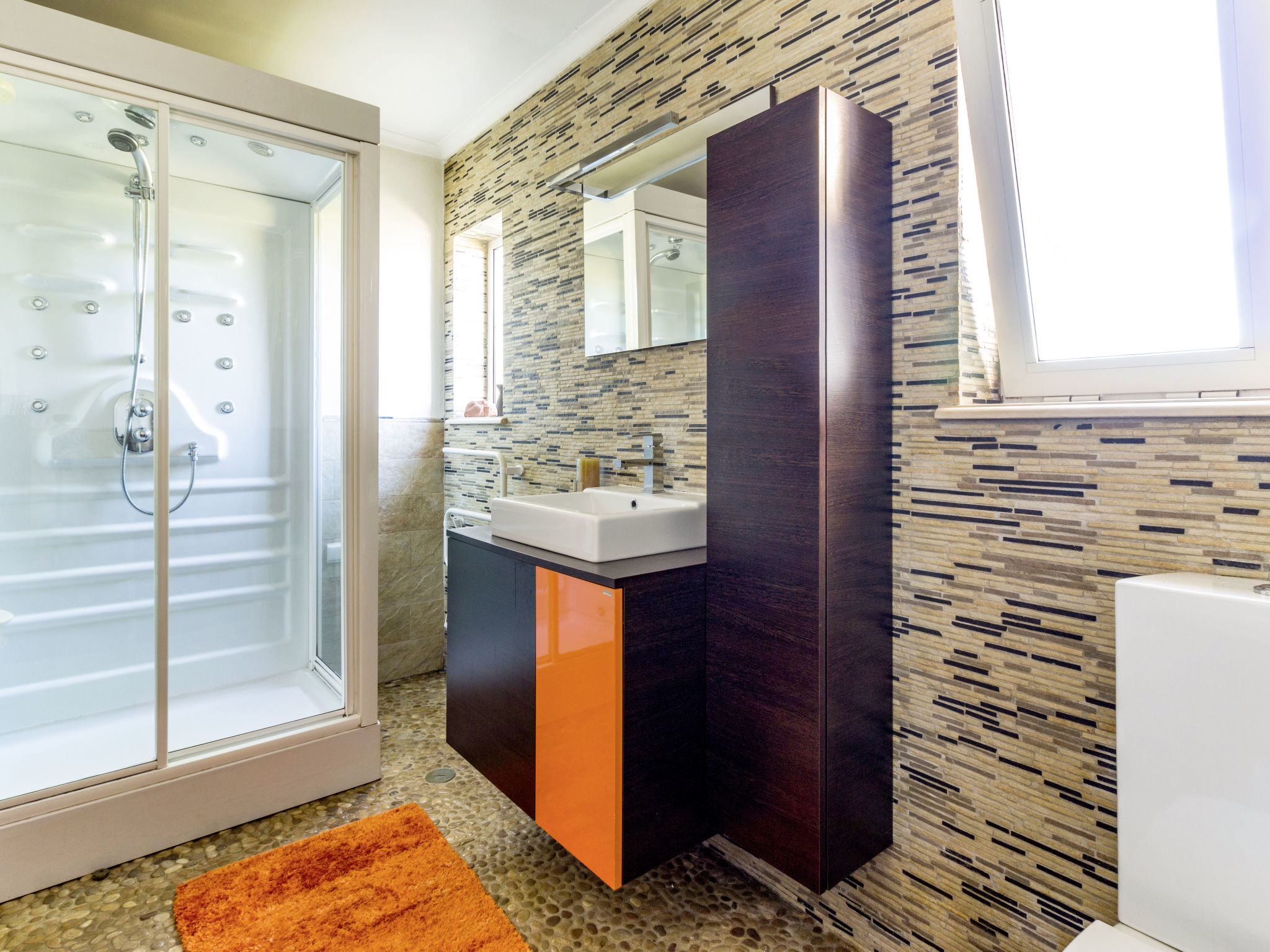 "Monte Meco (ILE100)", 6-Zimmer-Haus 260 m2 auf 2 Stockwerken. Geschmackvoll eingerichtet: Wohn-/Esszimmer, auf 2 Ebenen mit offenem Kamin, Esstisch und Kabel-TV. Ausgang zur Terrasse. Wohnzimmer. 1 Zimmer mit begehbarer Kleiderschrank mit 1 franz. Bett (150 cm), Dusche/WC, Doppelwaschbecken und Sprudelbad. 1 Zimmer mit 2 Betten und Bad/WC. Küche (Backofen, Geschirrspüler, 4 Flammen, Toaster, Wasserkocher, Mikrowelle, Tiefkühler, elektrische Kaffeemaschine) mit Esstisch. Sep. WC. Obergeschoss: 1 Zimmer mit 1 franz. Bett und Dusche/WC. Ausgang zur Terrasse. 1 Zimmer mit 1 franz. Bett und Bad/WC. Galerie. E-Heizung, Klimaanlage. Heizung nicht in allen Räumen. Terrasse teilweise überdacht. Terrassenmöbel, Gartengrill, Liegestühle (8). Panoramasicht. Zur Verfügung: Waschmaschine, Wäschetrockner, Safe, Bügeleisen, Fliegengitter, Kinderhochstuhl, Babybett. Internet (Wireless LAN, gratis). Bitte beachten: Nichtraucher-Unterkunft. Maximal 2 Haustiere/Hunde erlaubt. 67380/AL