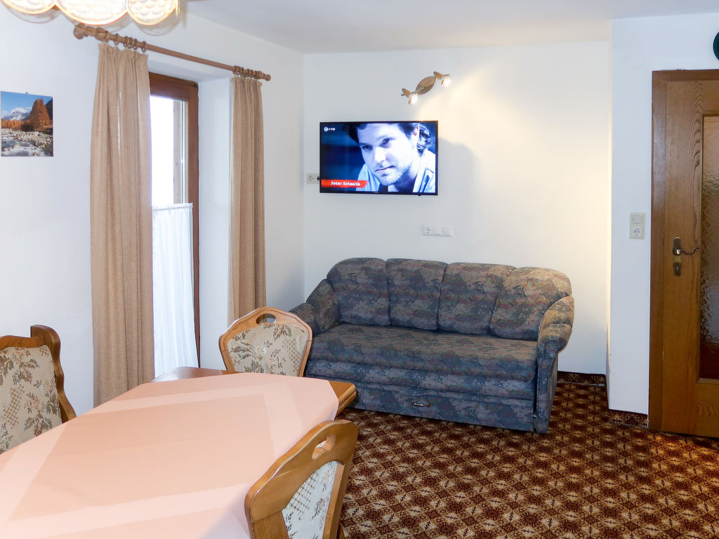 3-Zimmer-Wohnung, Dachgeschoss (Dachschräge), ca. 40 m². Vorraum, offen zu Wohn-/Schlafraum mit Doppelbettcouch, Essplatz (Eckbank), Kochnische (4 Ceranfelder, Backofen, Kühlschrank, Kaffeemaschine, Wasserkocher) und Balkonausgang. Doppelzimmer mit Balkonausgang und Zugang zu sehr kleinem Schlafzimmer mit Etagenbett. Dusche/WC. Empfohlene Belegung: 2 Erwachsene plus max. 3 Kinder.