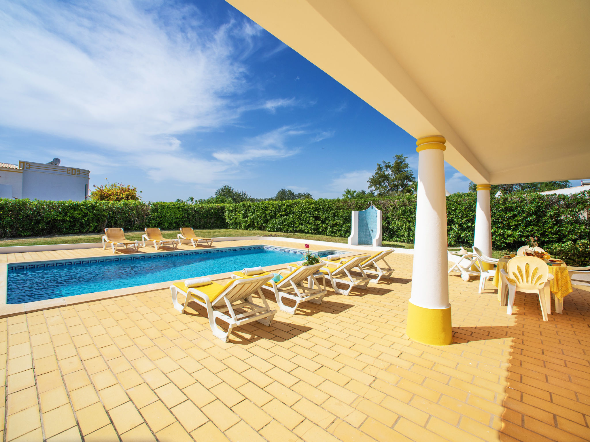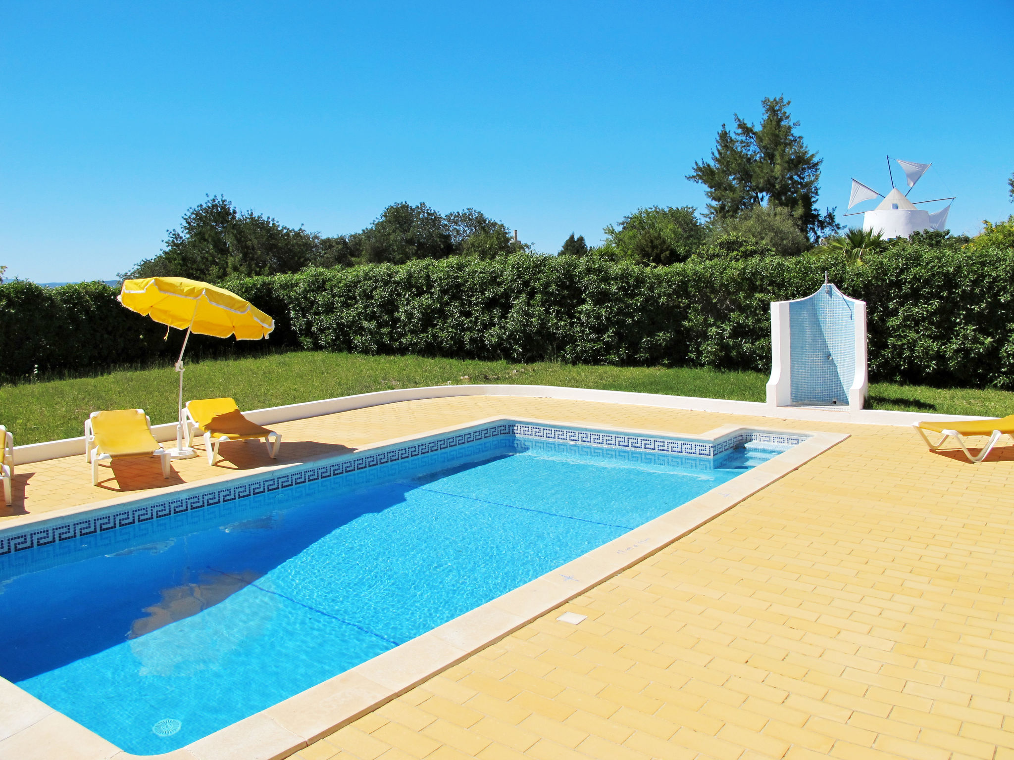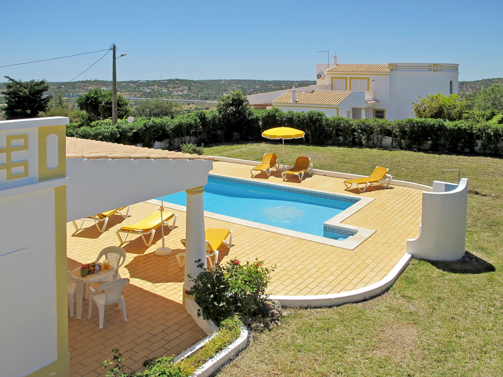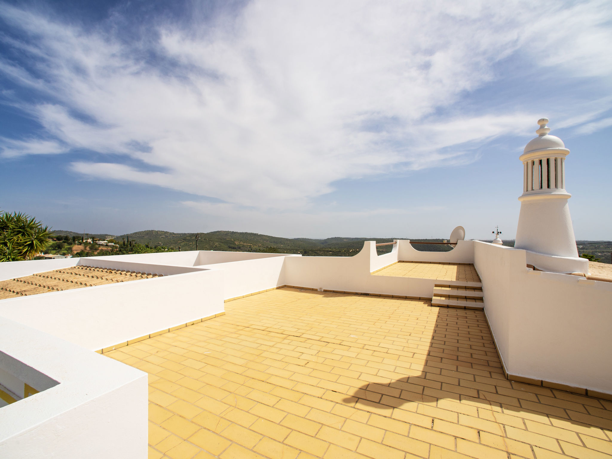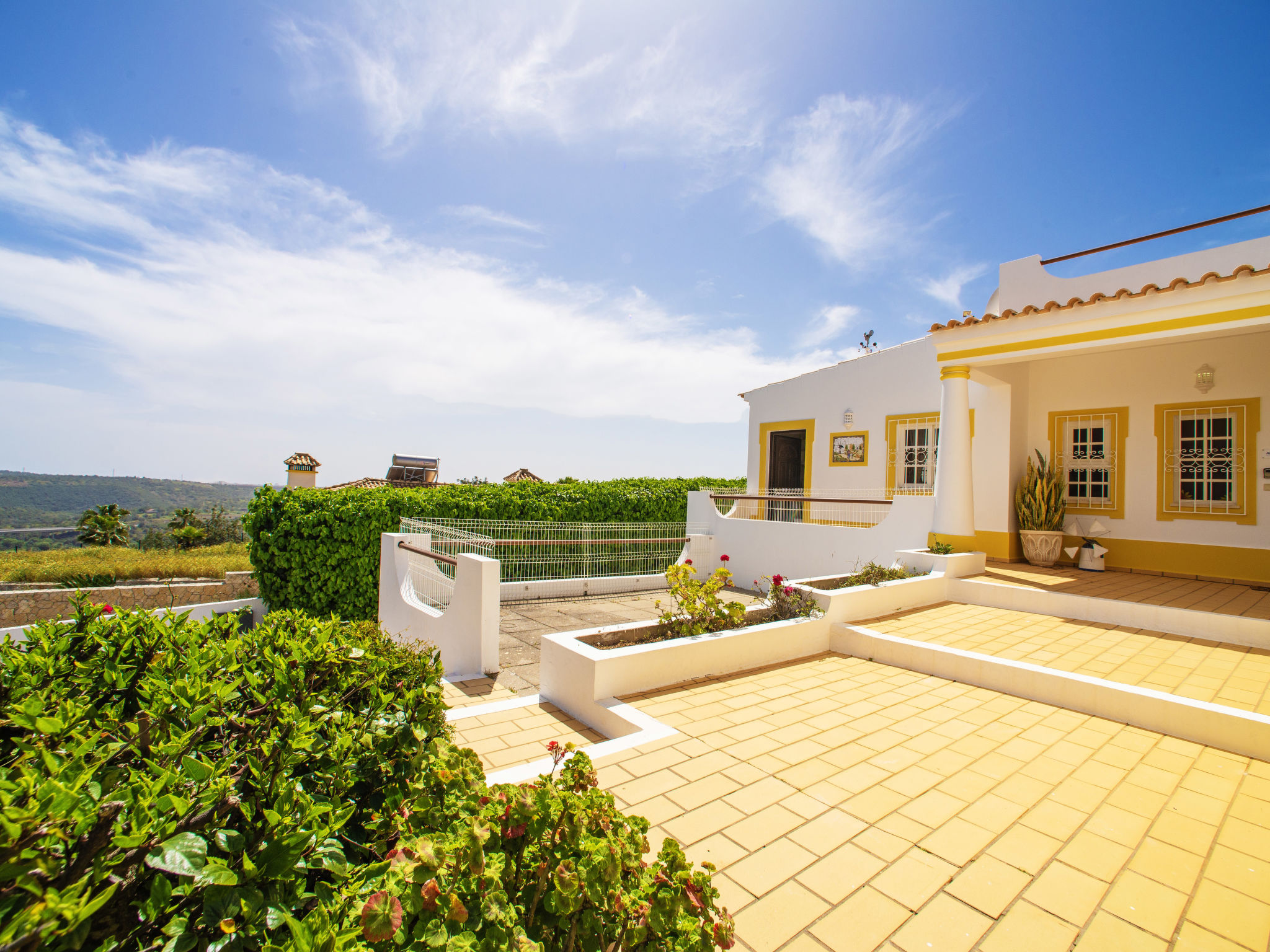 Das Ferienhaus mit Panoramablick liegt im Ortsteil Moinho do Leitão, 1,1 km vom Dorf Cerca Velha und 2,2 km von Paderne entfernt. Nächste Einkaufsmöglichkeit 1,5 km. Supermarkt 2,2 km. Restaurant 1,2 km. Zum Sandstrand in Albufeira 15 km. Freizeitpark Krazy World 14,5 km. Zufahrt ca. 250 m über schmale Straße. Parkmöglichkeiten auf dem Grundstück. Das Ferienhaus steht auf einem ca. 800 m² großen, abgeschlossenen, terrassierten Grundstück. Einfahrtstor. Pool (7,50 x 3,50 m, gesamte Saison geöffnet) mit umlaufender Poolterrasse, 6 Sonnenliegen, 2 Sonnenschirmen. Außendusche. Überdachte Terrasse mit Gartenmobiliar, gemauerter Grill. Dachterrasse. Freundliche, ansprechende Einrichtung in hellen Farben. Fliesenboden. Sat-TV (deutsche Programme). Internetzugang (WLAN, inklusive). Abstellraum mit Waschmaschine, Bügeleisen/-brett. Safe. Klimaanlage mit Kühl-/Heizfunktion in zwei Schlafzimmern. Elektroradiator im Wohnraum und im dritten Schlafzimmer. Heizung nicht in allen Räumen. Hinweis: Rauchen ist im Haus nicht gestattet.