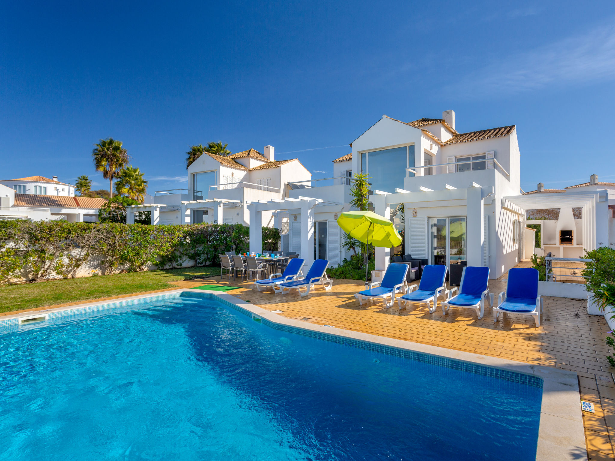 Sehr gemütliche, einfache, komfortable Villa "Villa Blue Ocean". Im Bezirk Galé, im Villenviertel, 500 m vom Meer. Zur Alleinbenutzung: wunderschöner Garten zum Entspannen, Schwimmbad eckig (5 x 10 m, 80 - 180 cm tief, 01.01.-31.12.). Aussendusche, Grill. Im Hause: Wireless LAN, Klimaanlage, Waschmaschine. Parkplatz beim Haus. Einkaufsgeschäft 270 m, Lebensmittelgeschäft, Supermarkt 850 m, Einkaufszentrum 7.5 km, Restaurant 220 m, Bar 950 m, Bäckerei, Café 900 m, Sandstrand "Praia da Galé" 500 m, Tauchzentrum 5.3 km. Golfplatz (18 Loch) 1.7 km, Surfschule 900 m, Tennis 7.9 km, Minigolf 9.1 km, Reitstall 2.9 km. Nahe gelegene Sehenswürdigkeiten: Albufeira 8 km, Zoomarine 6.9 km, Aqualand 8.1 km, Sand City Fiesa 12.7 km, Marina Albufeira 6.2 km, Club Sport Fishing Boating 5.3 km. Bekannte Seen in der Umgebung sind gut erreichbar: Lagoa dos Salgados 2.2 km. Wandergebiete: Monchique 46.3 km. Bitte beachten: Fahrzeug empfohlen. Geeignet für Familien. Jugendgruppen nur auf Anfrage. Be- und Entladen am Ferienhaus möglich.