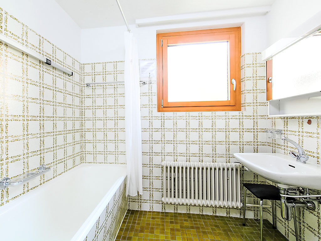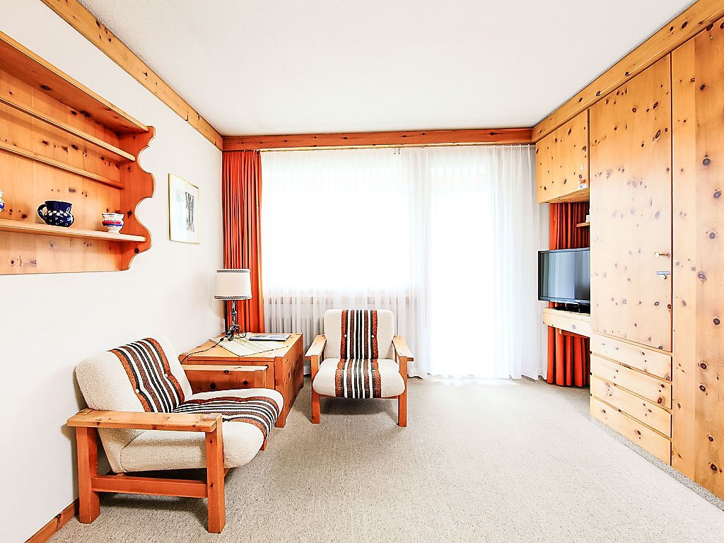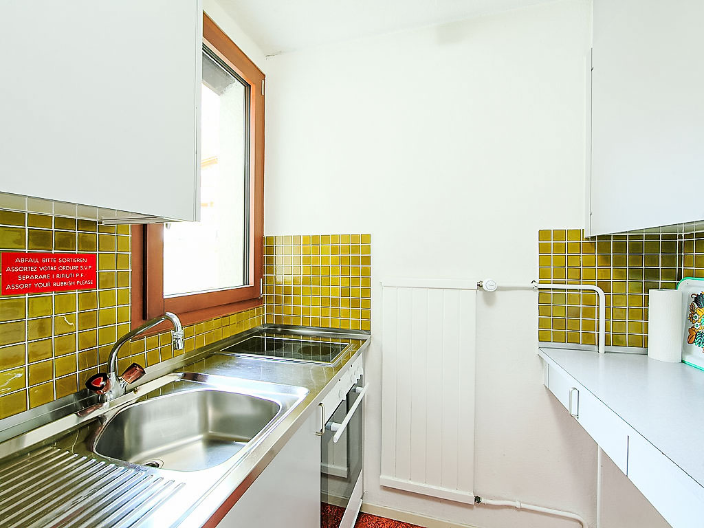 1-Zimmer-Wohnung 30 m2 im 6. Stock. Rustikal und gemütlich eingerichtet: Wohn-/Esszimmer mit 2 Wandschrankbetten und Kabel-TV (Flachbildschirm), Radio. Ausgang zum Balkon. Küche (2 Kochplatten, Backofen). Bad/WC. Balkon 7 m2, Ostlage. Schöne Sicht auf die Berge, die Landschaft und die Ortschaft. Zur Verfügung: Internet (Wireless LAN, gratis). Parkplatz.