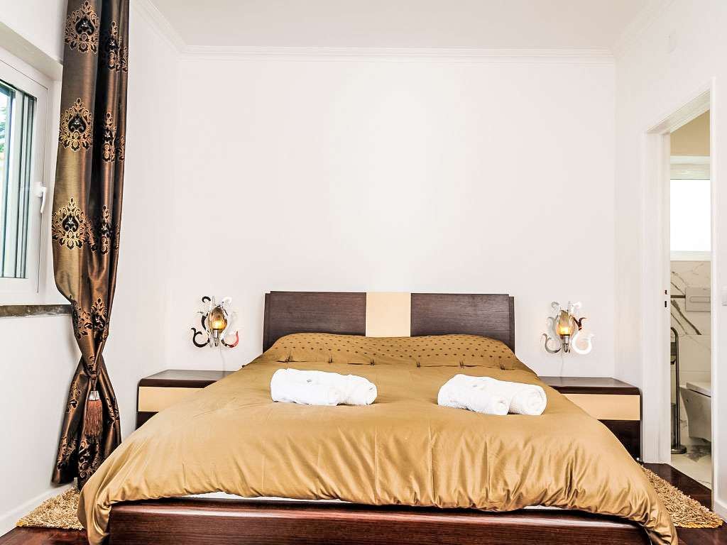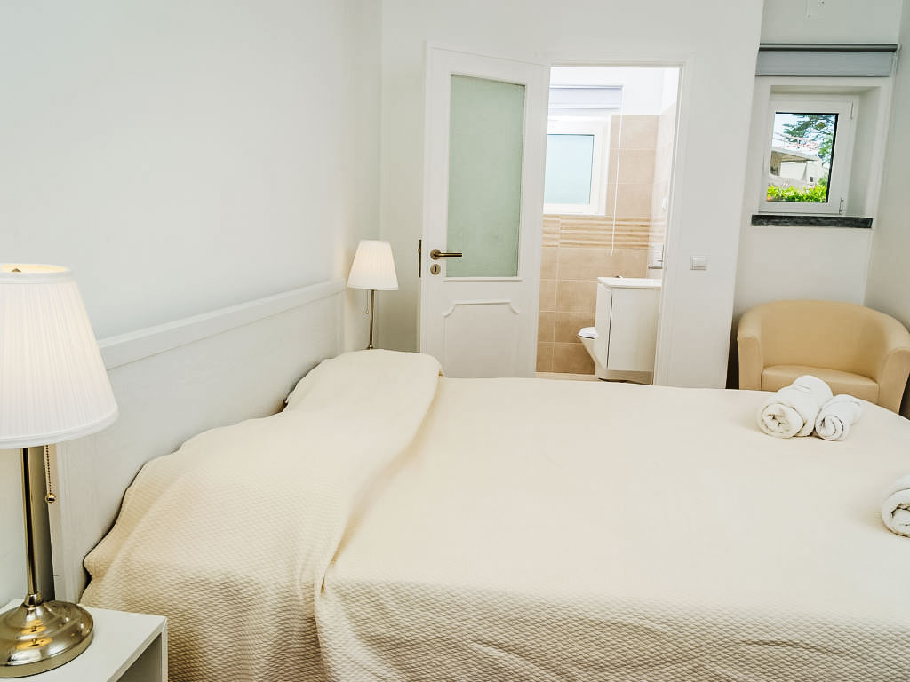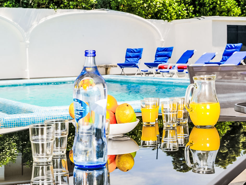 "Vila Violeta", 6-Zimmer-Villa 200 m2. Komfortabel und gemütlich eingerichtet: Wohn-/Esszimmer mit offenem Kamin und Kabel-TV (Flachbildschirm). Ausgang zum Gartensitzplatz, zum Schwimmbad. 1 Zimmer mit 1 franz. Bett und Dusche/WC. Küche (Backofen, Geschirrspüler, 4 Glaskeramikherd Platten, Mikrowelle, elektrische Kaffeemaschine) mit Esstisch. Sep. WC. Obergeschoss: 1 Zimmer mit 1 franz. Bett und Sprudelbad. 2 Zimmer, jedes Zimmer mit 1 franz. Bett und Dusche/WC. 1 Zimmer mit 1 Bett und 1 x 2 Etagenbetten. Terrasse. Terrassenmöbel, Gartengrill, Liegestühle (6). Sicht auf das Schwimmbad. Zur Verfügung: Waschmaschine, Babybett bis 3 Jahre, Haartrockner. Internet (Wireless LAN, gratis). 56675/AL