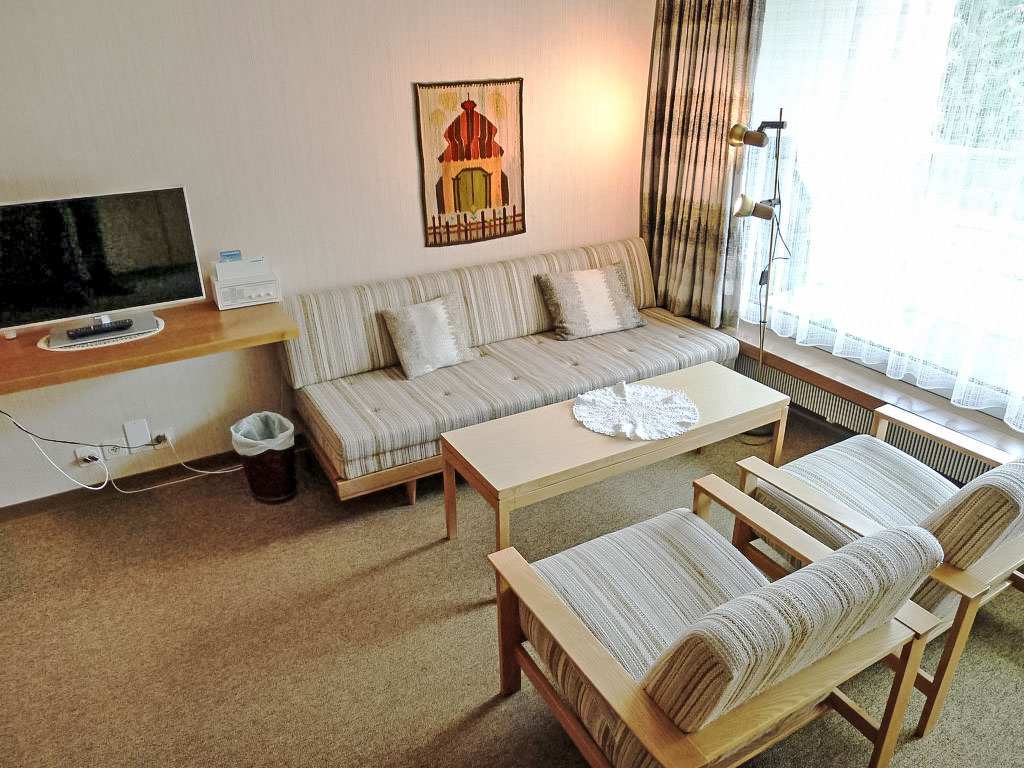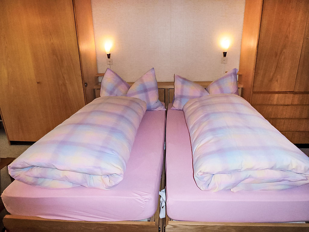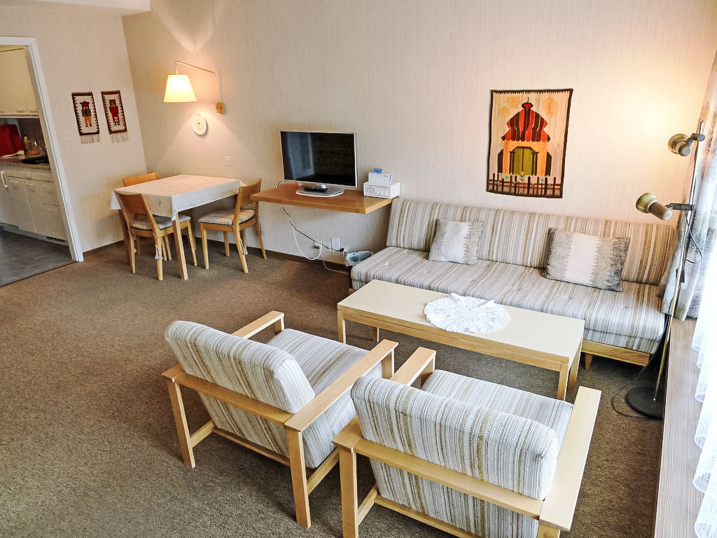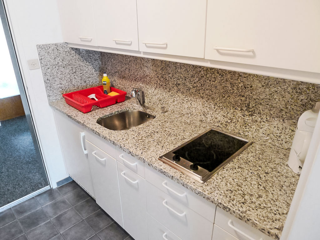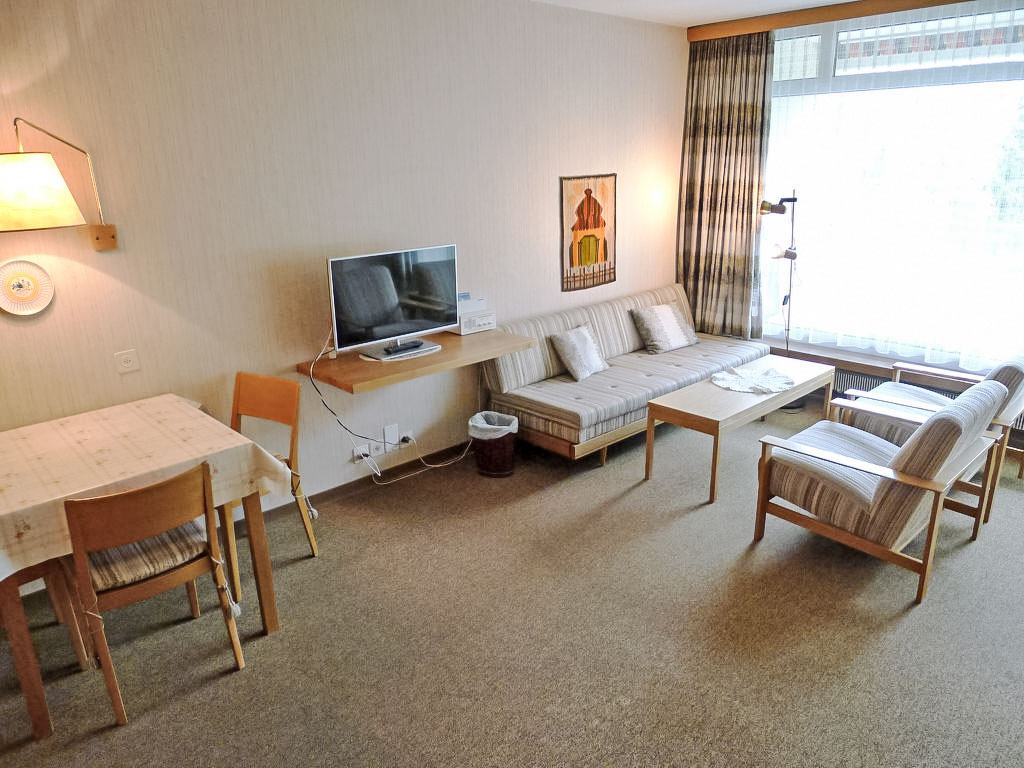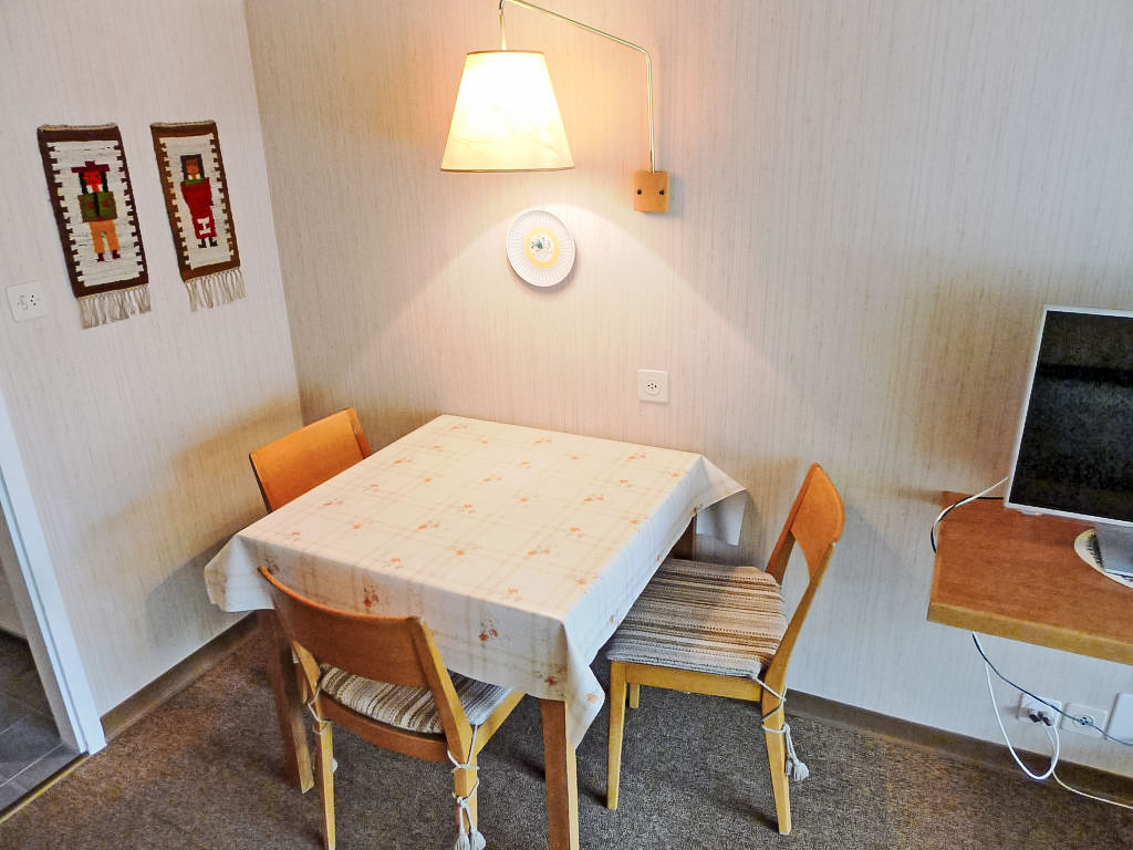 1-Zimmer-Wohnung 28 m2 im 4. Stock. Zweckmässig und gemütlich eingerichtet: Wohn-/Esszimmer mit 2 Wandschrankbetten und Kabel-TV (Flachbildschirm), Radio. Ausgang zum Balkon. Kochnische im Eingang (2 Glaskeramikherd Platten). Dusche/WC. Balkon 8 m2, Südlage. Schöne Sicht auf die Berge, die Landschaft und die Ortschaft. Parkplatz. Bitte beachten: Nichtraucher-Unterkunft.