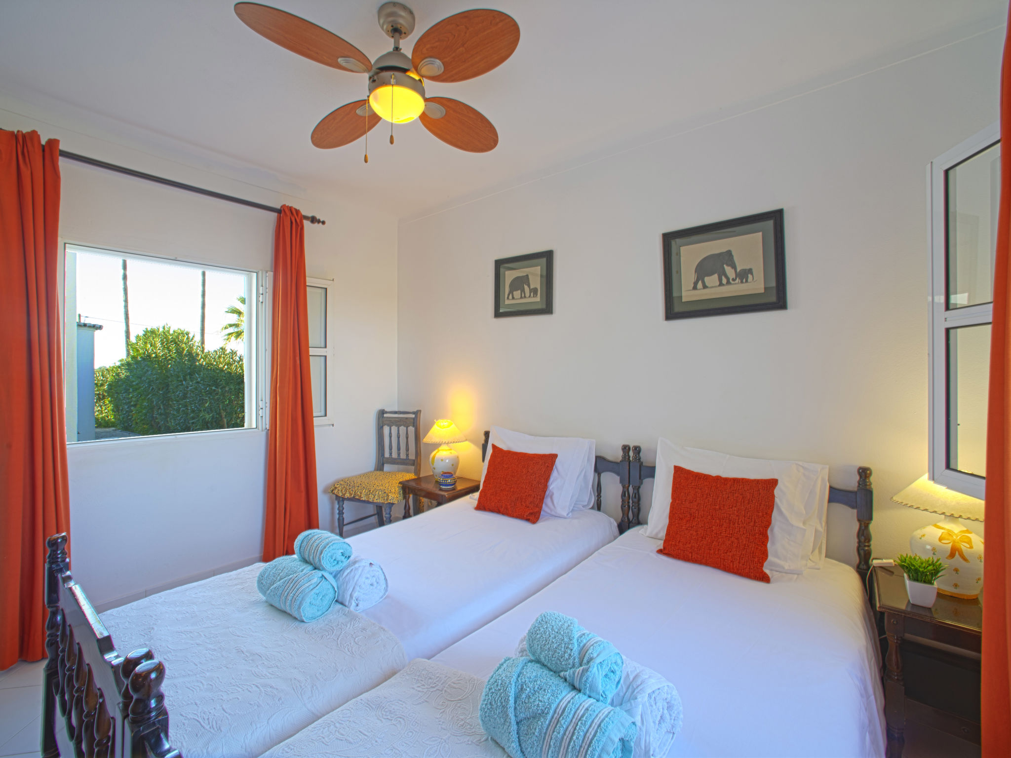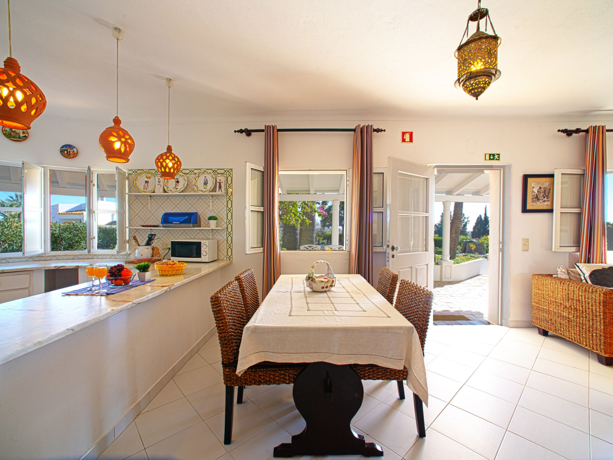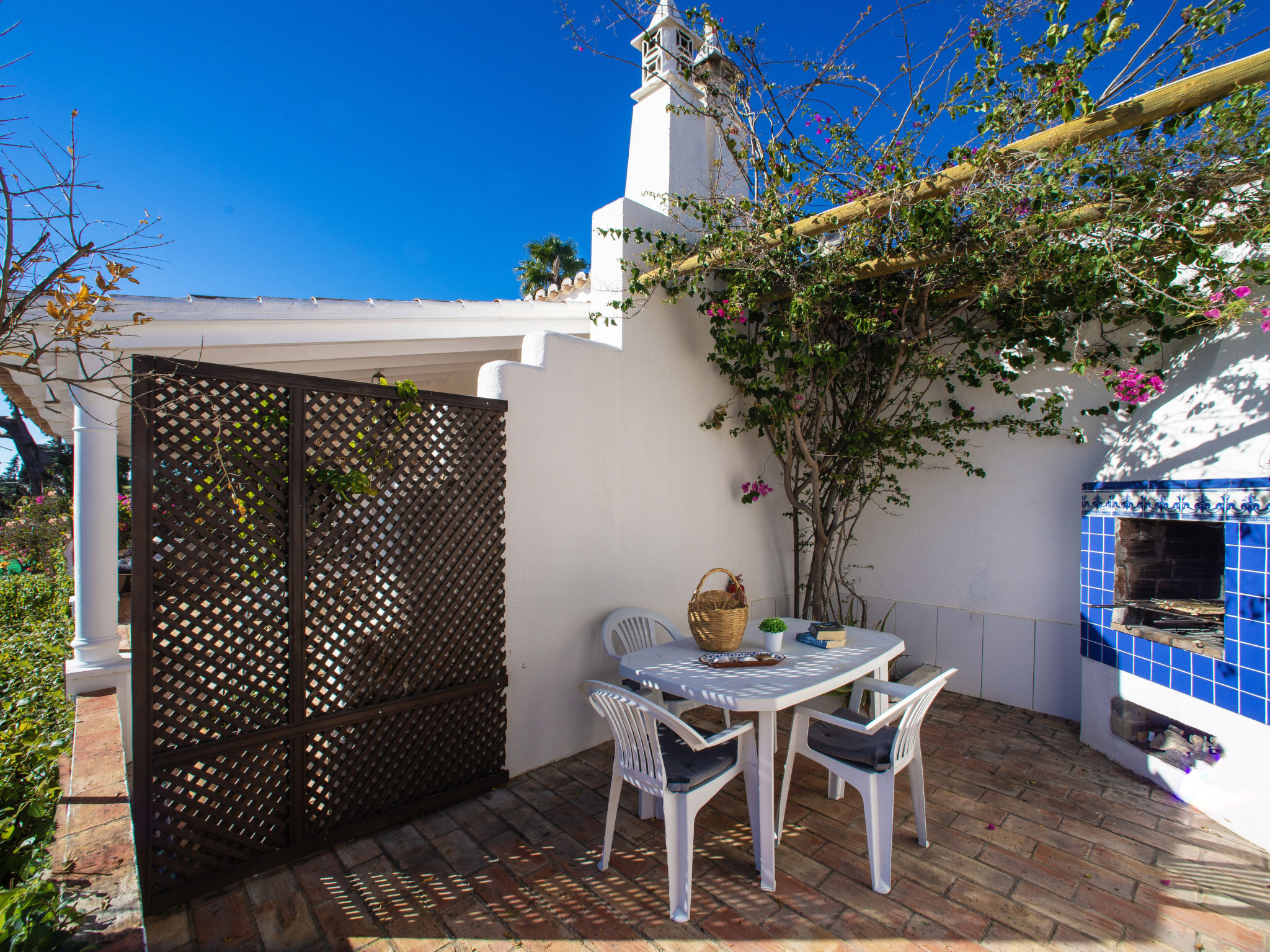 "Luz Romana A2 (TVA 101)", 4-Zimmer-Doppelhaushälfte 100 m2. Hell, schön eingerichtet: Wohn-/Esszimmer mit Esstisch, Sat-TV und E-Heizofen. 1 Zimmer mit 1 franz. Bett (Länge 200 cm). 2 Zimmer, jedes Zimmer mit 2 Betten (Länge 200 cm). Offene Küche (4 Kochplatten, Backofen, Geschirrspüler, Toaster, Mikrowelle, Tiefkühler, elektrische Kaffeemaschine). 2 Duschen/WC. Heizung nicht in allen Räumen. Terrasse überdacht. Terrassenmöbel, Gartengrill, Liegestühle (6). Sicht auf das Meer. Zur Verfügung: Safe. Internet (Wireless LAN, gratis). Bitte beachten: Nichtraucher-Unterkunft. 107259/AL