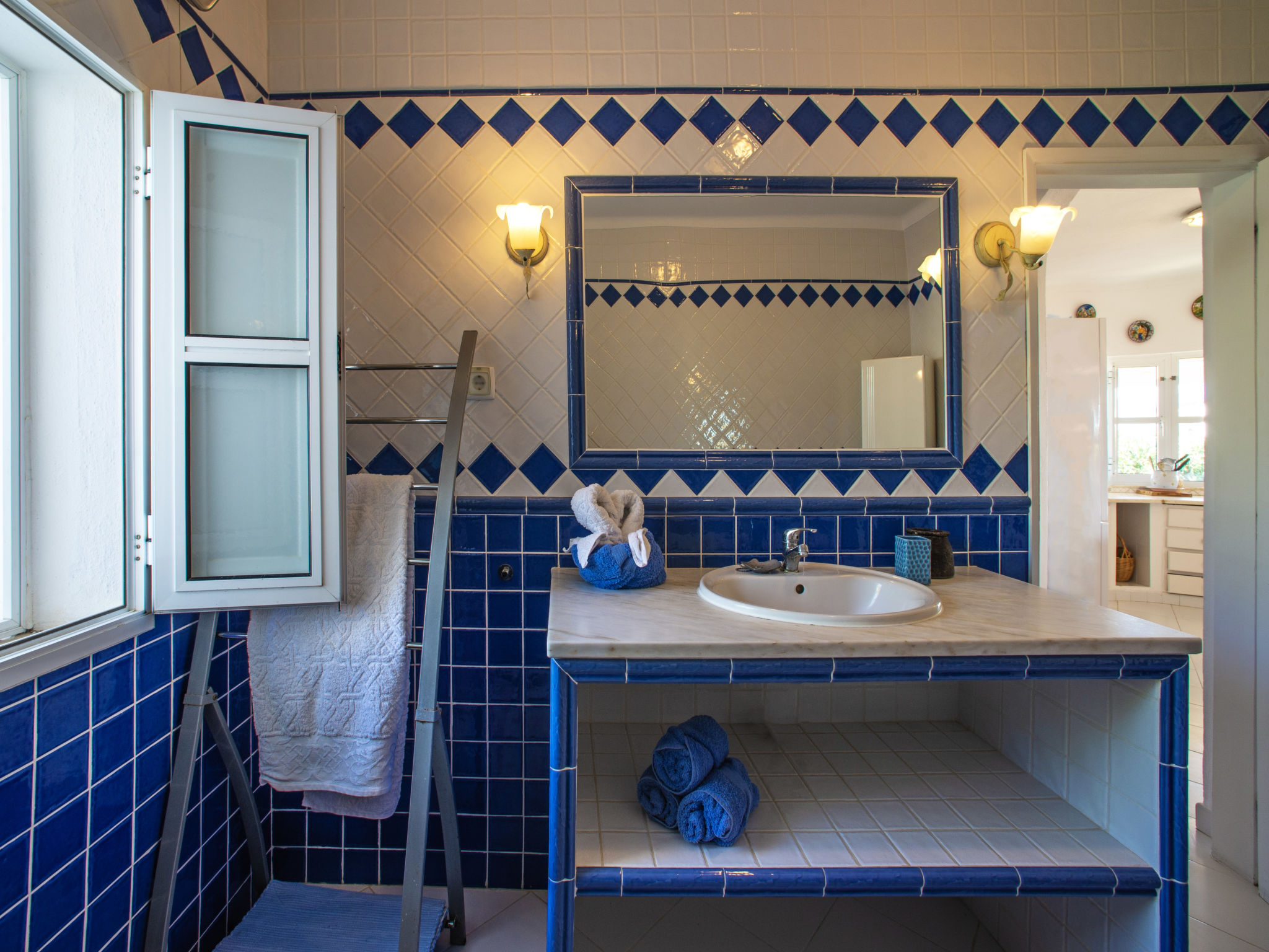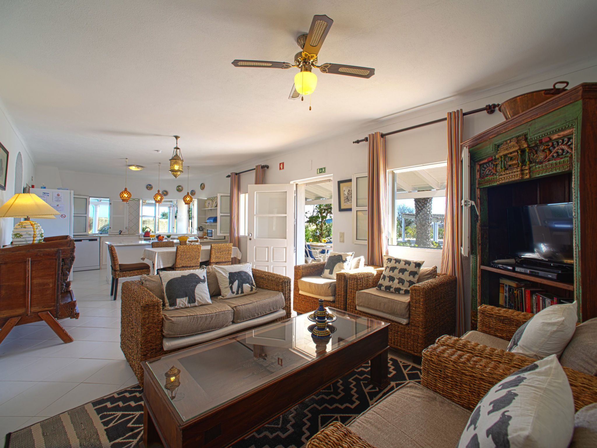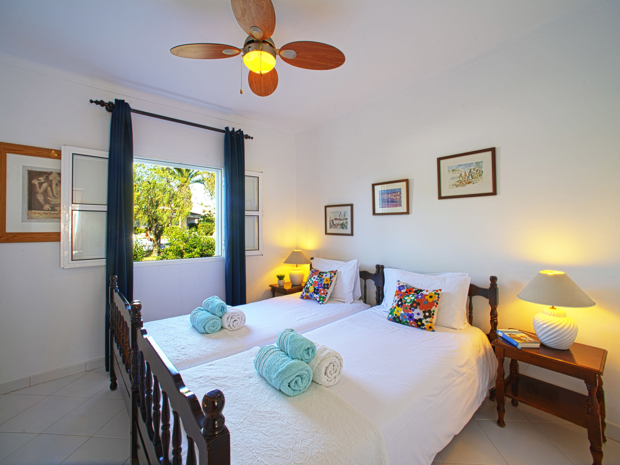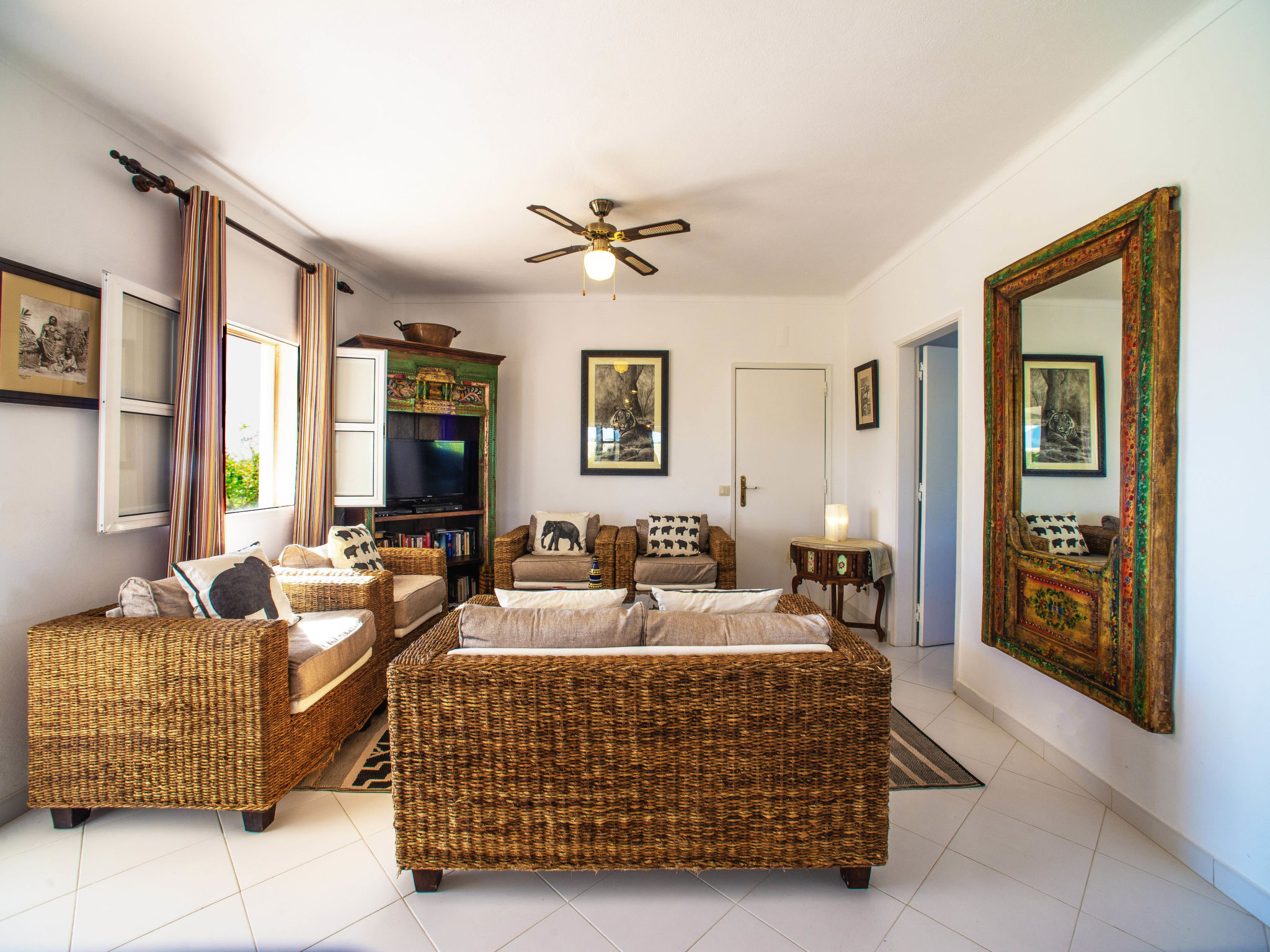 "Luz Romana A2 (TVA 101)", 4-Zimmer-Doppelhaushälfte 100 m2. Hell, schön eingerichtet: Wohn-/Esszimmer mit Esstisch, Sat-TV und E-Heizofen. 1 Zimmer mit 1 franz. Bett (Länge 200 cm). 2 Zimmer, jedes Zimmer mit 2 Betten (Länge 200 cm). Offene Küche (4 Kochplatten, Backofen, Geschirrspüler, Toaster, Mikrowelle, Tiefkühler, elektrische Kaffeemaschine). 2 Duschen/WC. Heizung nicht in allen Räumen. Terrasse überdacht. Terrassenmöbel, Gartengrill, Liegestühle (6). Sicht auf das Meer. Zur Verfügung: Safe. Internet (Wireless LAN, gratis). Bitte beachten: Nichtraucher-Unterkunft. 107259/AL