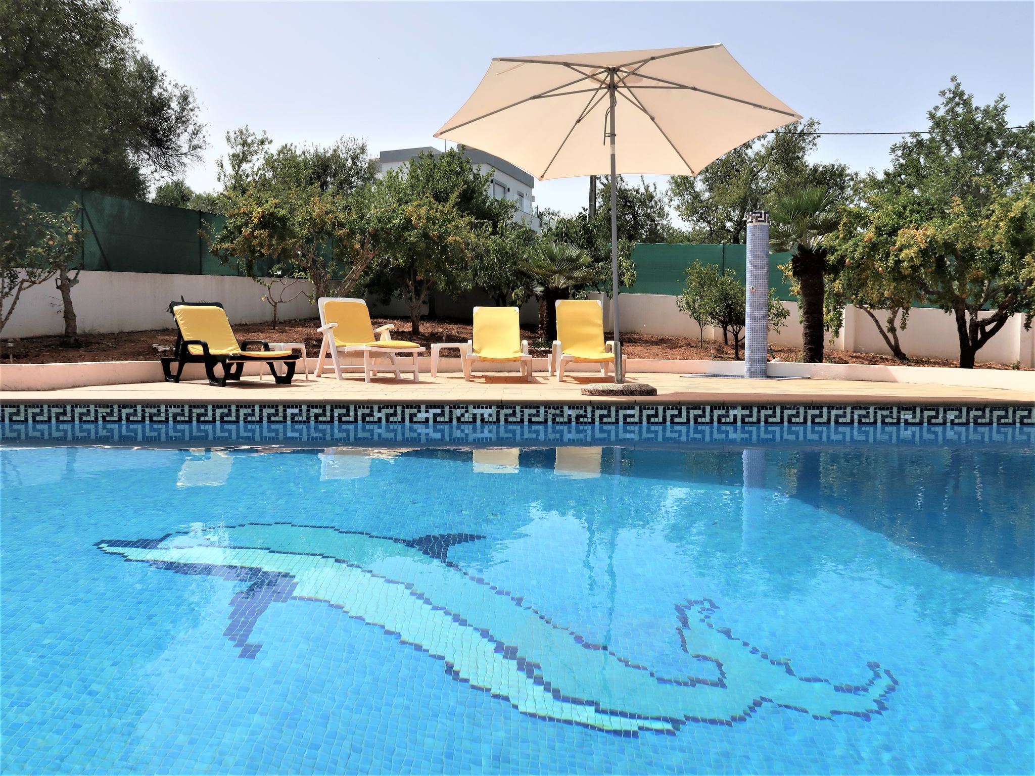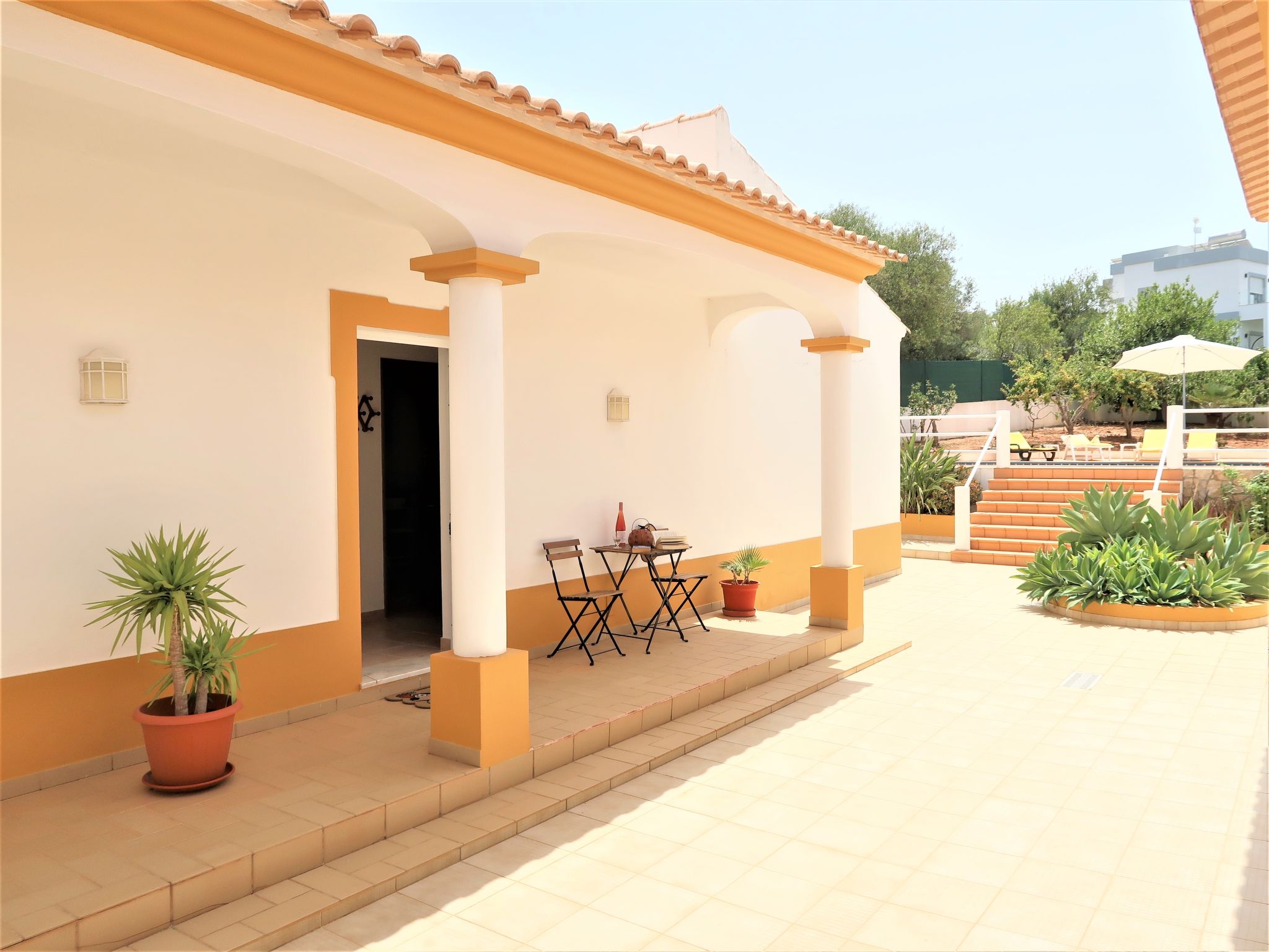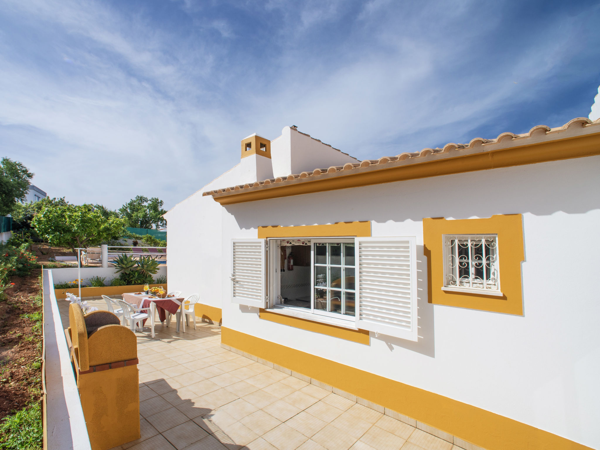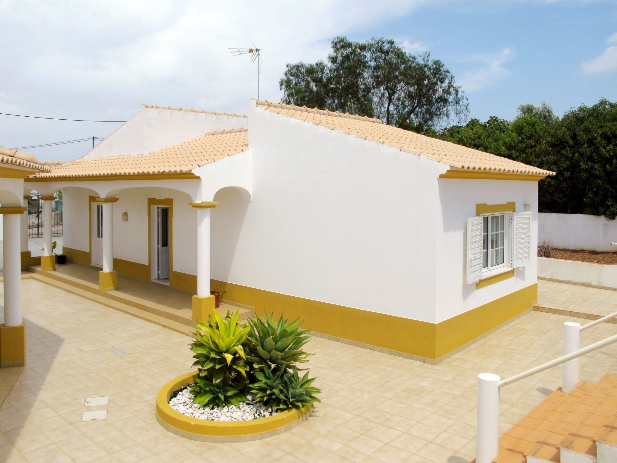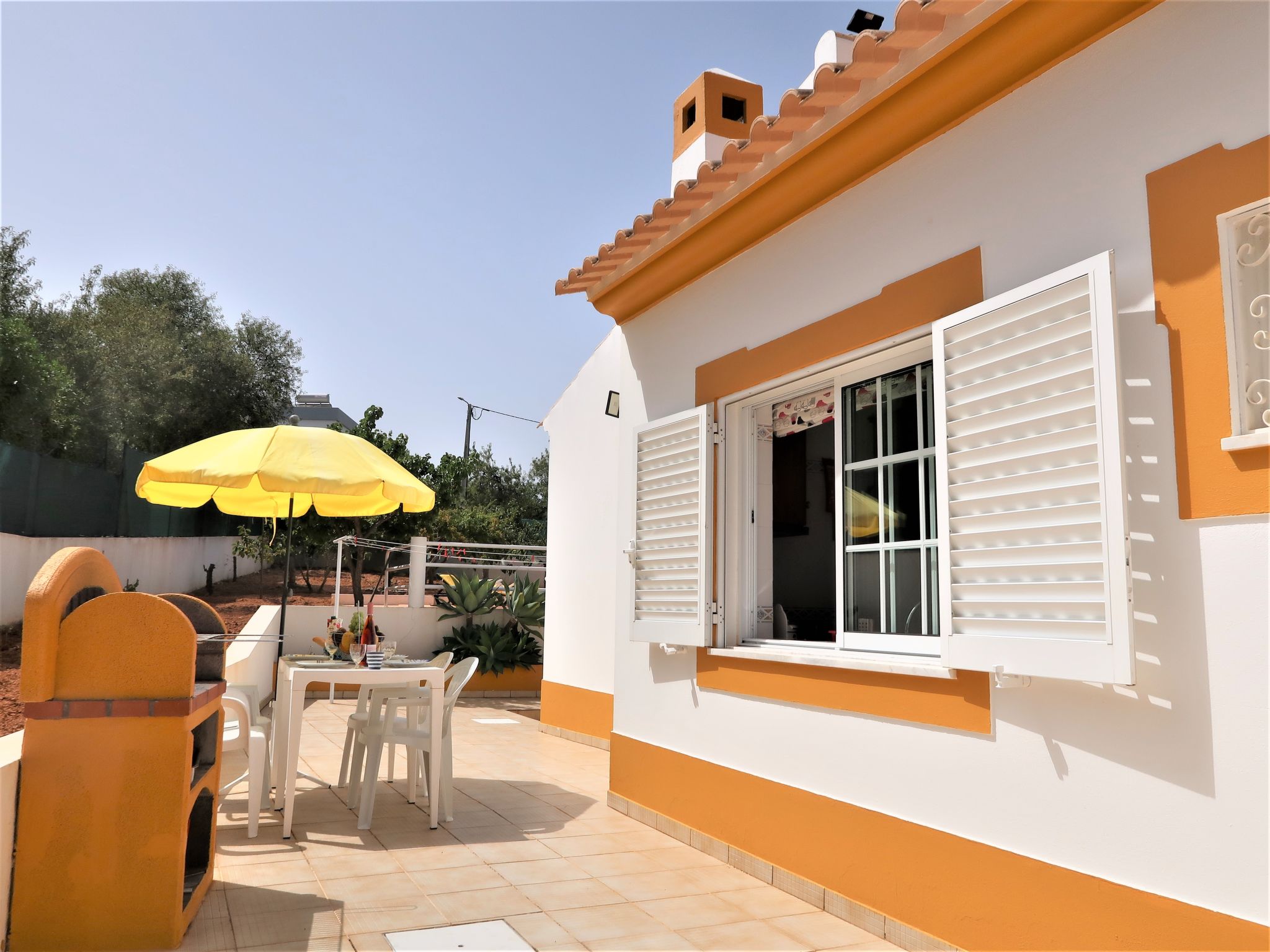 Das kleine sympathische Ferienhaus liegt ländlich im Weiler Monte Novo, 1,4 km von der Ortsmitte Paderne entfernt. Nächste Einkaufsmöglichkeit 1,4 km. Restaurant ca. 200 m. Einkaufszentrum bei Guia 14,5 km. Sandstrand Olhos d'Agua 14,5 km. Albufeira und der Sandstrand Praia dos Pescadores 17 km. Mehrere Golfplätze in Vilamoura 13-15 km. Freizeitpark Zoomarine 21 km. Das Ferienhaus liegt neben dem Haus des diskreten Besitzerehepaares auf einem gemeinsamen, ca. 1800 m² großen, abgeschlossenen, gepflasterten Grundstück mit Bäumen und einigen Büschen. Der Besitzer hält einen gutmütigen Hund in Haus und Zwinger. Einfahrtstor. Über ein paar Stufen zur Poolebene mit Pool (10 x 5 m, gesamte Saison geöffnet) zur alleinigen Nutzung, halbrunde Poolterrasse, 4 Sonnenliegen und Sonnenschirm. Außendusche. Grundstückspflege 1x pro Woche, Poolpflege 2x pro Woche durch den Besitzer. Zur Rückseite des Hauses eigene Terrasse mit Gartenmobiliar, gemauerter Grill. Parkmöglichkeit auf dem Grundstück. Auf dem Nachbargrundstück Hühner und Gänse. Freundlich-feriengerechte Einrichtung mit viel Holz. Fliesenboden. Sat-TV (deutsche Programme), Stereoanlage. Internetzugang (WLAN, inklusive). Waschmaschine. Elektroradiatoren. Heizung nicht in allen Räumen. Hinweis: Rauchen ist im Haus nicht gestattet.