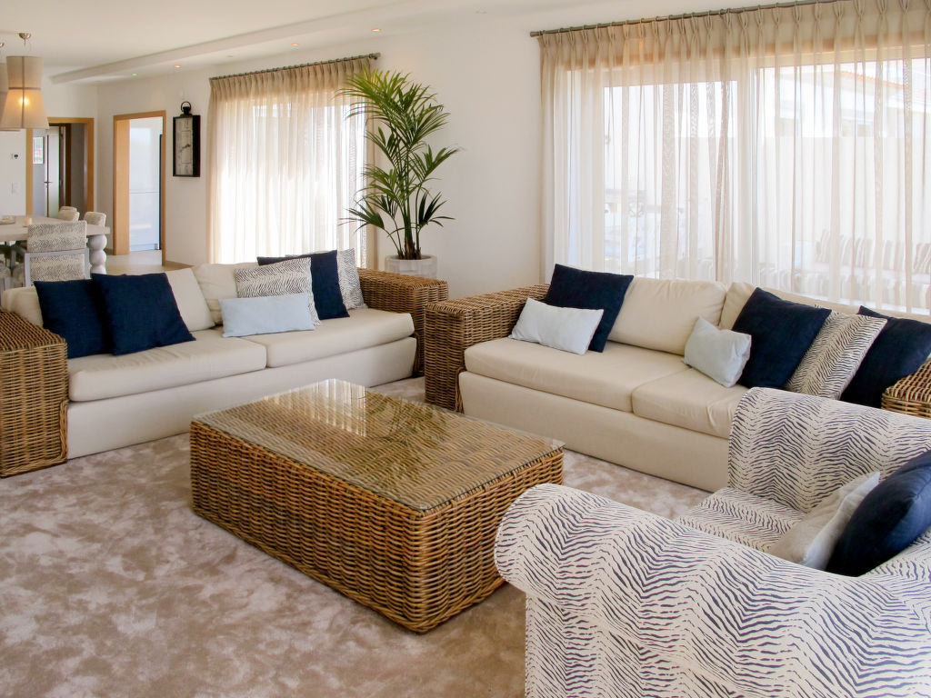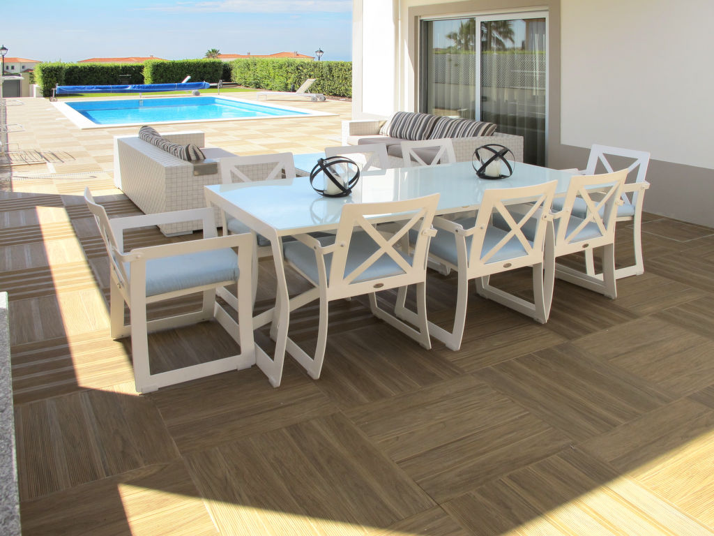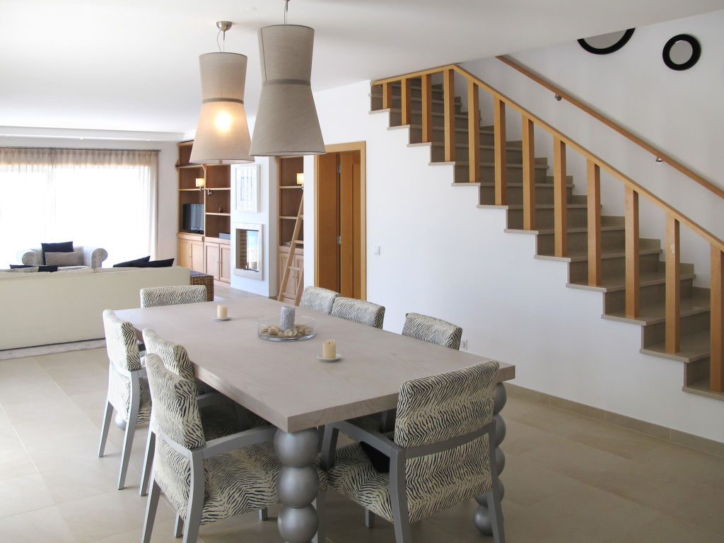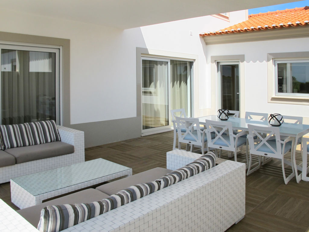 "Praia d'el Rey (OBI132)", 6-Zimmer-Haus 225 m2 auf 2 Stockwerken. Modern und geschmackvoll eingerichtet: Wohn-/Esszimmer mit offenem Kamin (nur Deko), Esstisch und Kabel-TV. Ausgang zur Terrasse. 1 Zimmer mit 1 franz. Bett (180 cm), Dusche/WC. 1 Zimmer mit 2 Betten und Dusche/WC. Ausgang zur Terrasse. Küche (Backofen, Geschirrspüler, 5 Flammen, Toaster, Wasserkocher, Mikrowelle, Tiefkühler, elektrische Kaffeemaschine). Sep. WC. Unteres Geschoss: Wohnzimmer. Sep. WC. Fussbodenheizung. Heizung nicht in allen Räumen. Obergeschoss: 1 Zimmer mit 1 franz. Bett (180 cm), Dusche/WC. Ausgang zur Terrasse. 1 Zimmer mit 1 franz. Bett (200 cm), Dusche/WC. Terrasse überdacht Terrasse, Rasen 450 m2. Terrassenmöbel, Gartengrill, Liegestühle (8). Sicht auf das Meer. Zur Verfügung: Waschmaschine, Wäschetrockner, Bügeleisen, Kinderhochstuhl, Babybett. Internet (Wireless LAN, gratis). Garage (2 Autos). 48883/AL