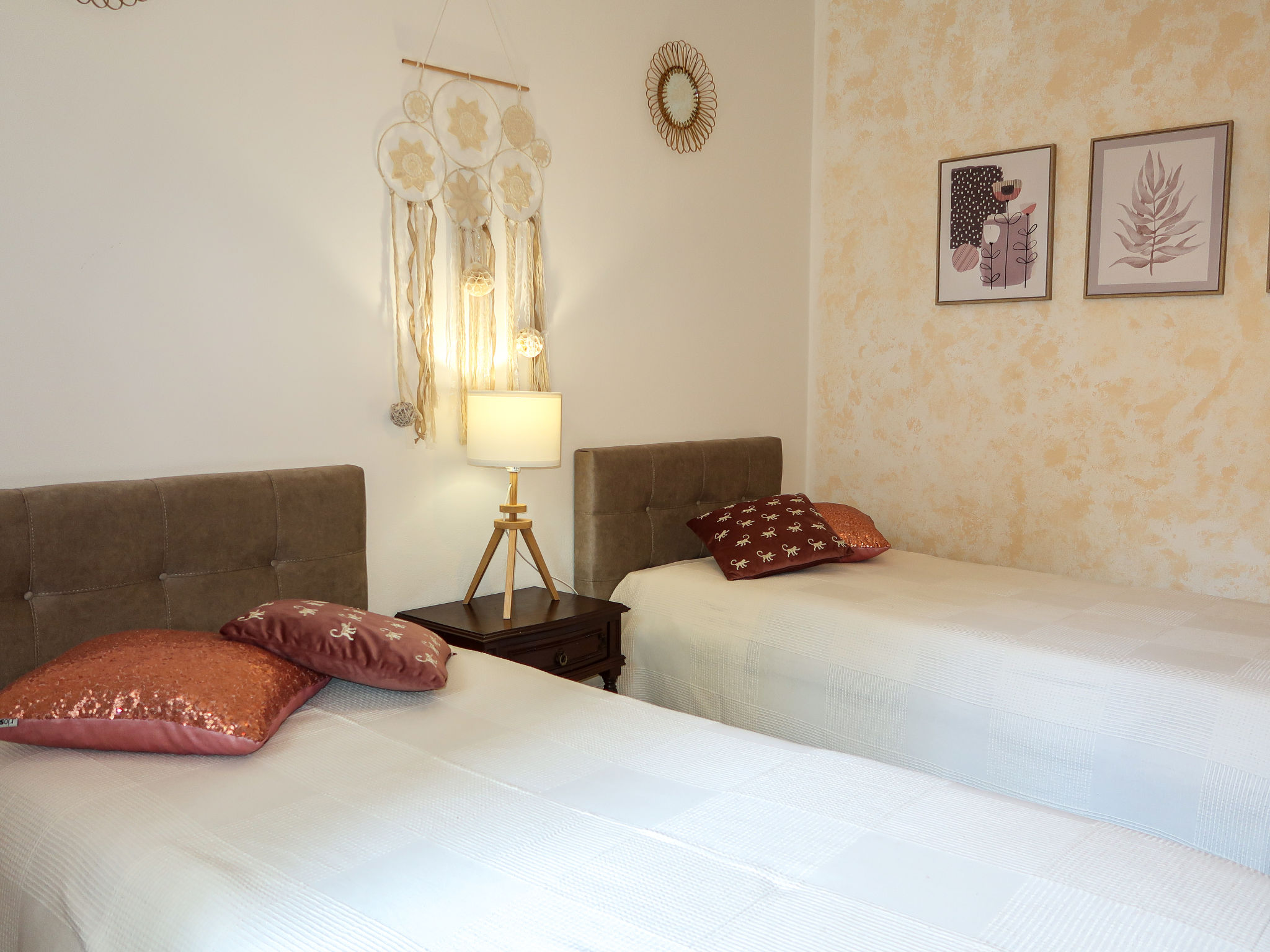 "Isaurinda 1", 4-Zimmer-Doppelhaushälfte 110 m2. Objekt geeignet für 6 Erwachsene + 1 Kind. Renoviert im Jahre 2004, geschmackvoll und gemütlich eingerichtet: Wohn-/Esszimmer mit offenem Kamin, Sat-TV, Stereoanlage und DVD. Ausgang zum Garten. 1 Zimmer mit 1 Bett (160 cm, Länge 195 cm), Dusche/Bidet/WC. Ausgang zum Garten. 1 Zimmer mit 1 Bett (140 cm, Länge 195 cm). 1 Zimmer mit 2 Betten (100 cm, Länge 190 cm). Küche (Backofen, Geschirrspüler, 4 Glaskeramikherd Platten, Toaster, Wasserkocher, Mikrowelle, Tiefkühler, elektrische Kaffeemaschine) mit Esstisch. Ausgang zum Garten. Bad/Bidet/WC. Terrasse teilweise überdacht, Laube. Terrassenmöbel, Gartengrill, Liegestühle (6), Sitzplatz. Zur Verfügung: Waschmaschine, Bügeleisen, Kinderhochstuhl, Babybett, Haartrockner. Internet (Wireless LAN, gratis). Bitte beachten: Nichtraucher-Haus. 55886/AL
