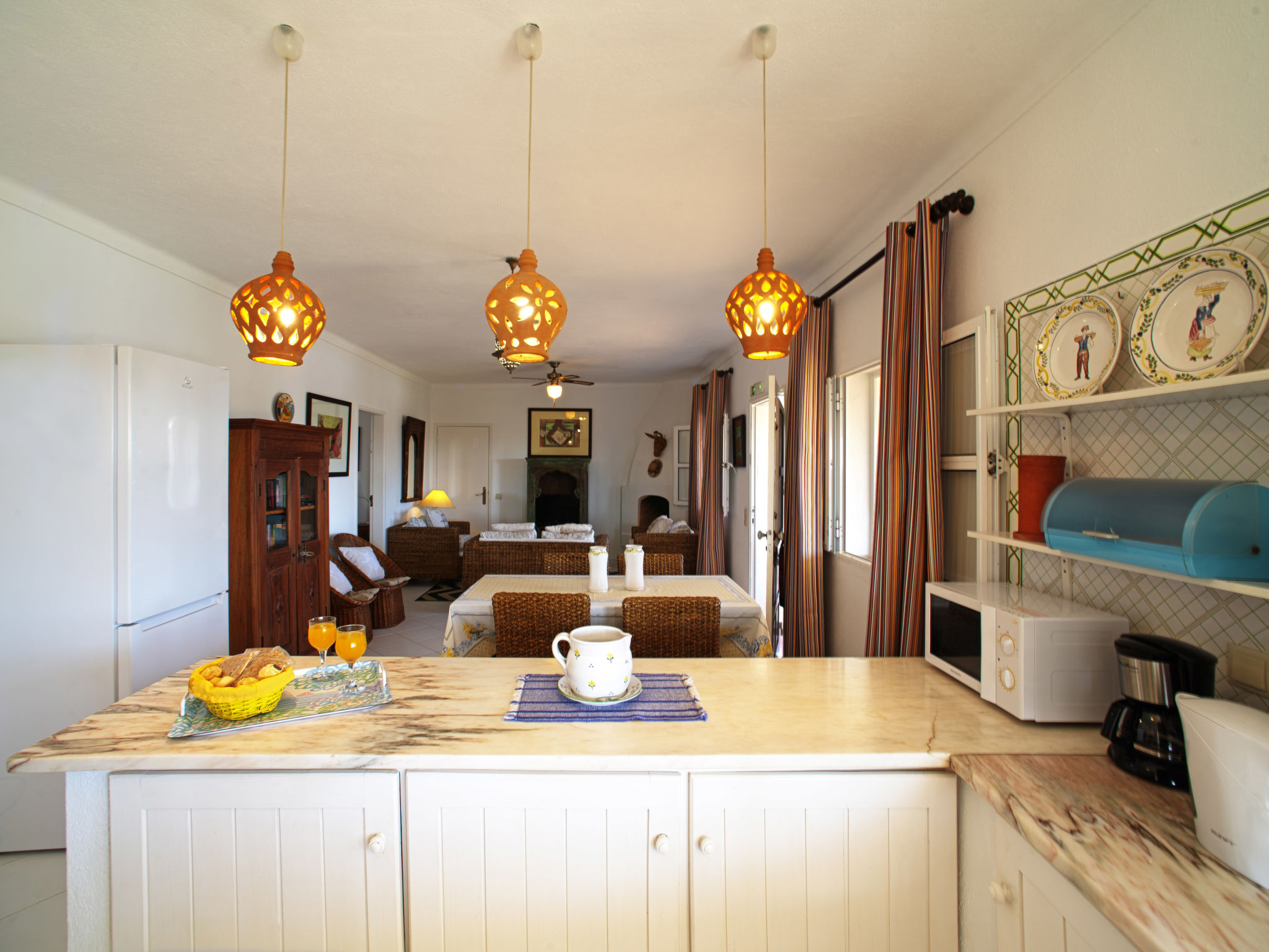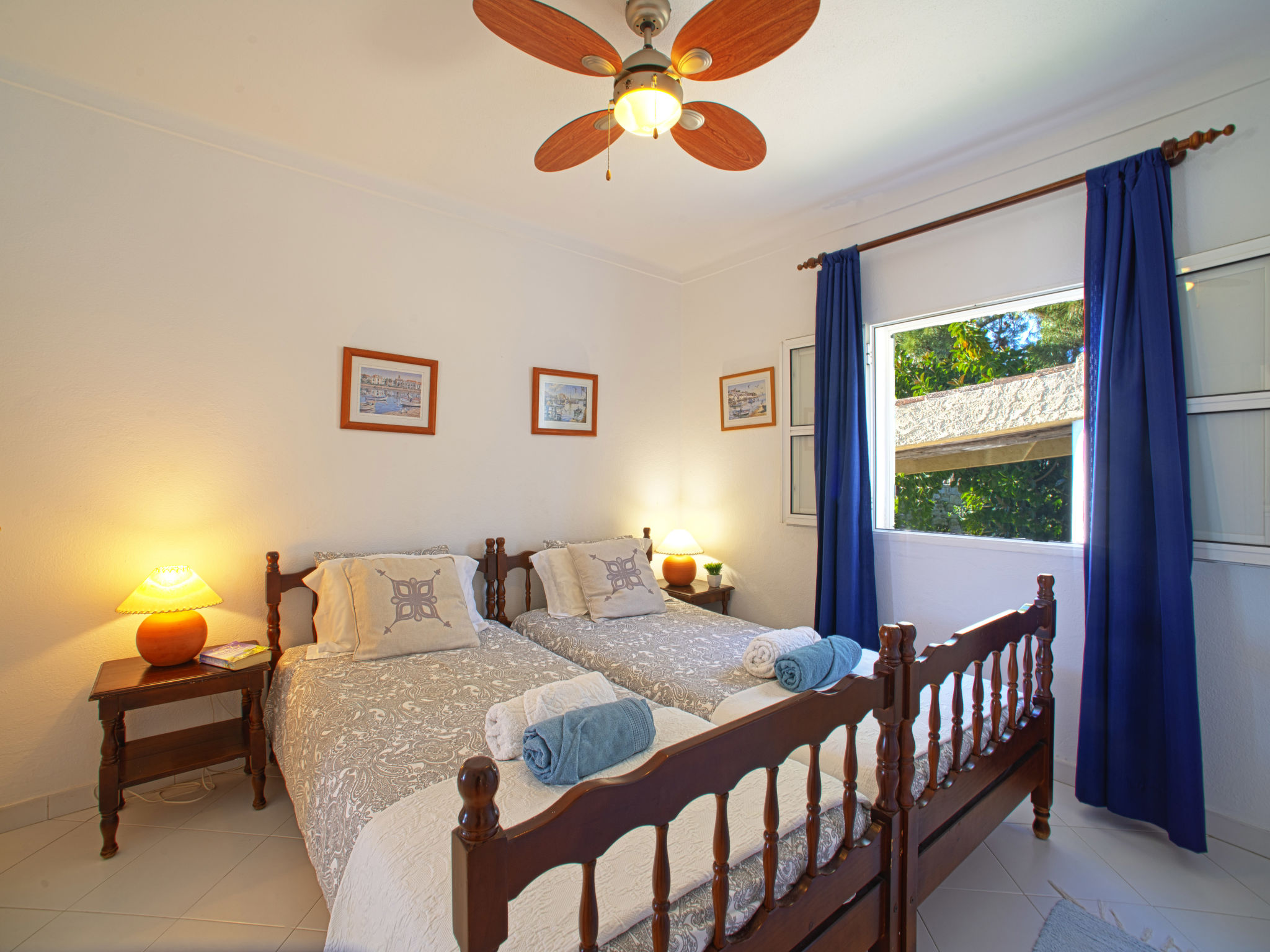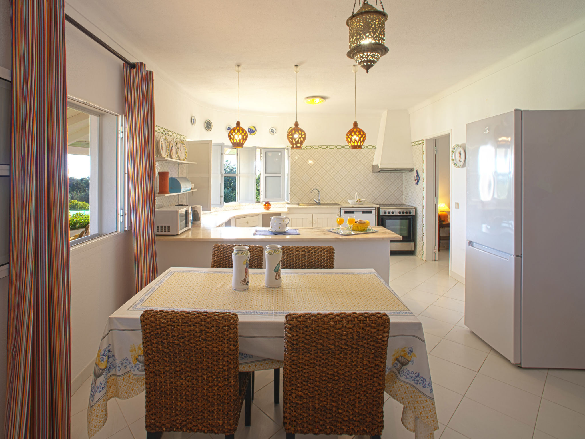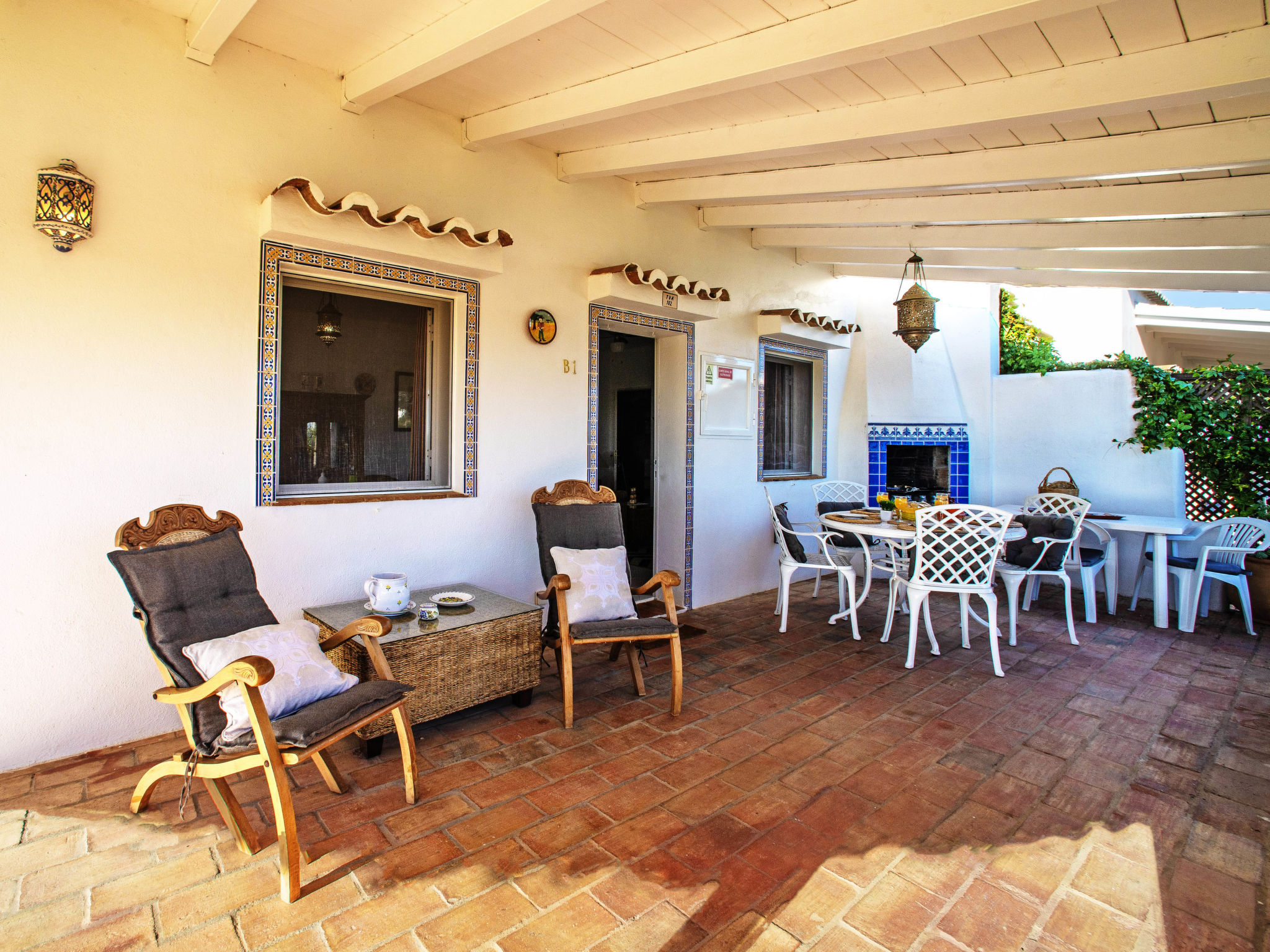 "Luz Romana B1 (TVA102)", 3-Zimmer-Doppelhaushälfte 80 m2. Hell, schön eingerichtet: Wohn-/Esszimmer 40 m2 mit Esstisch, Sat-TV und E-Heizofen. 1 Zimmer mit 1 Doppelbett (160 cm, Länge 200 cm). 1 Zimmer mit 2 Betten (Länge 200 cm). Offene Küche (4 Kochplatten, Backofen, Geschirrspüler, Toaster, Mikrowelle, Tiefkühler, elektrische Kaffeemaschine). Dusche/WC. Heizung nicht in allen Räumen. Terrasse überdacht. Terrassenmöbel, Gartengrill, Liegestühle (4). Zur Verfügung: Safe, Kinderhochstuhl, Babybett. Internet (Wireless LAN, gratis). Bitte beachten: Nichtraucher-Unterkunft. 24806/AL