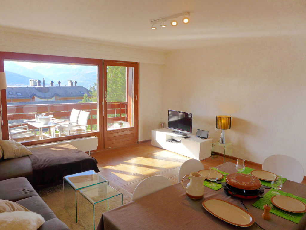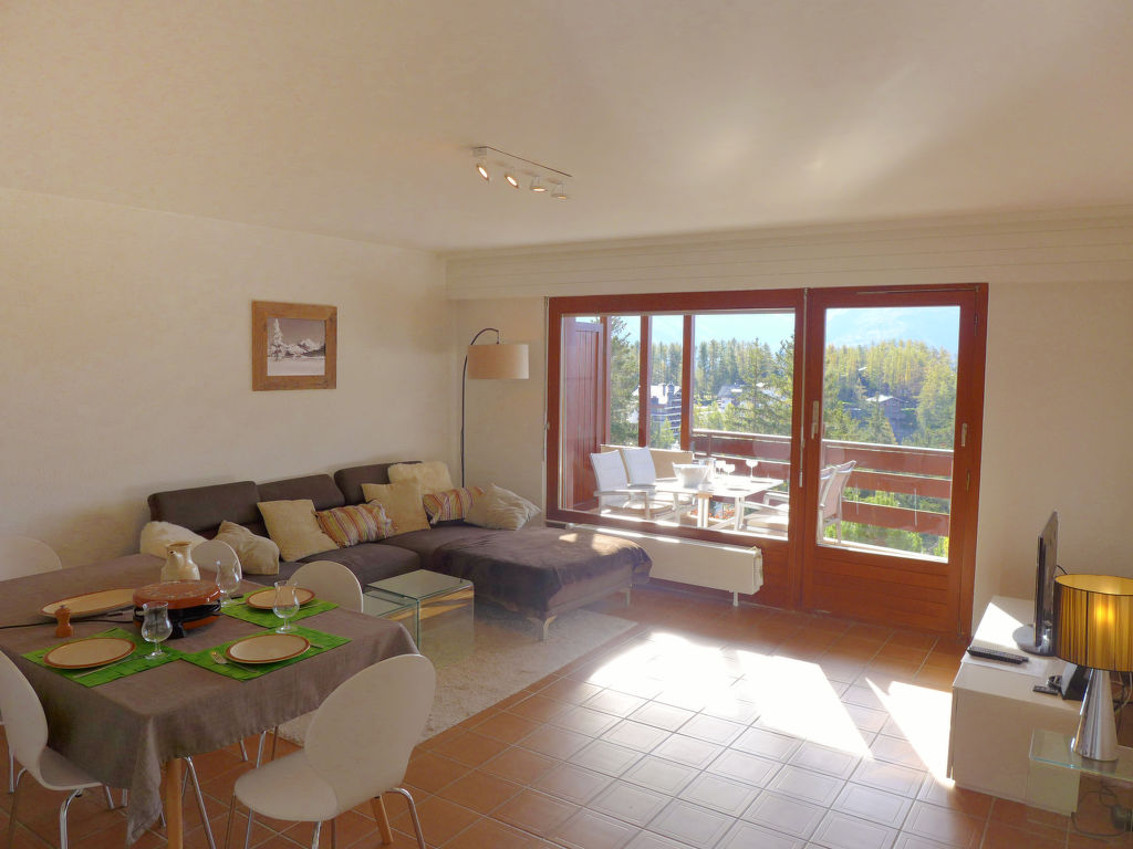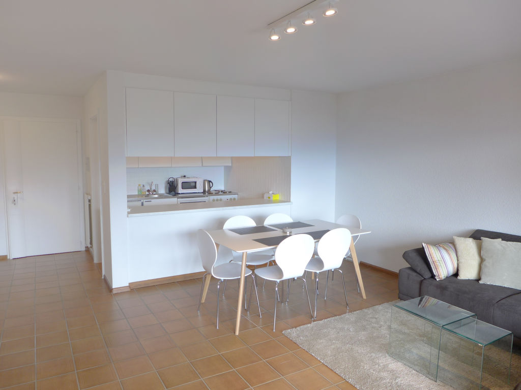 2-Zimmer-Wohnung 68 m2 im 1. Stock. Schön eingerichtet: Wohn-/Esszimmer mit Kabel-TV und DVD. Ausgang zum Balkon. 1 Zimmer mit 1 Bett (90 cm, Länge 200 cm), 1 Doppelbett (2 x 90 cm, Länge 200 cm). Ausgang zum Balkon. Offene Küche (3 Kochplatten, Backofen, Geschirrspüler, Toaster, Wasserkocher, Mikrowelle, elektrische Kaffeemaschine, Kapseln für die Kaffeemaschine (Nespresso) extra, Racletteofen). Bad/Bidet/WC. Grosser Balkon, Südlage. Balkonmöbel. Schöne Sicht auf die Berge und den Wald. Zur Verfügung: Bügeleisen, Haartrockner. Internet (Wireless LAN, gratis). Garage Nr. 6, Höhe 210 cm, Breite 240 cm. Bitte beachten: Nichtraucher-Unterkunft. 1 Haustier/Hund erlaubt. Es gibt auf dem Garagenplatz einen 10 cm Hoch Poller. Nicht geeignet für ein zu niedriges Auto.