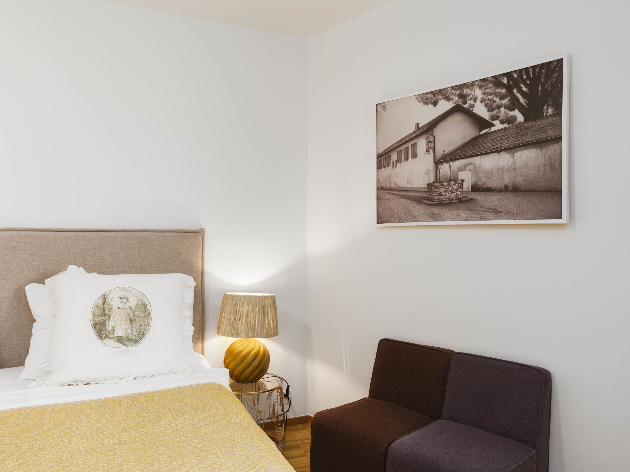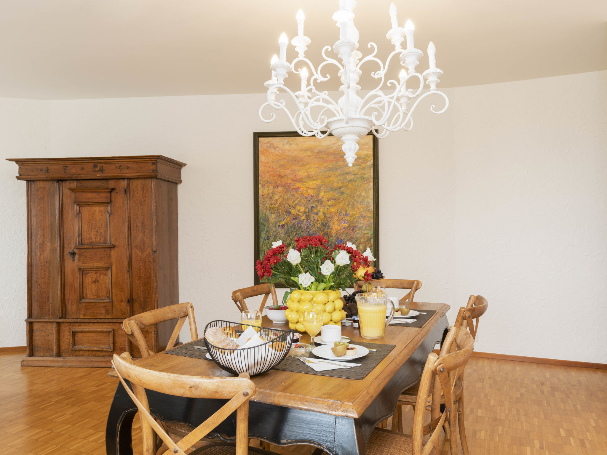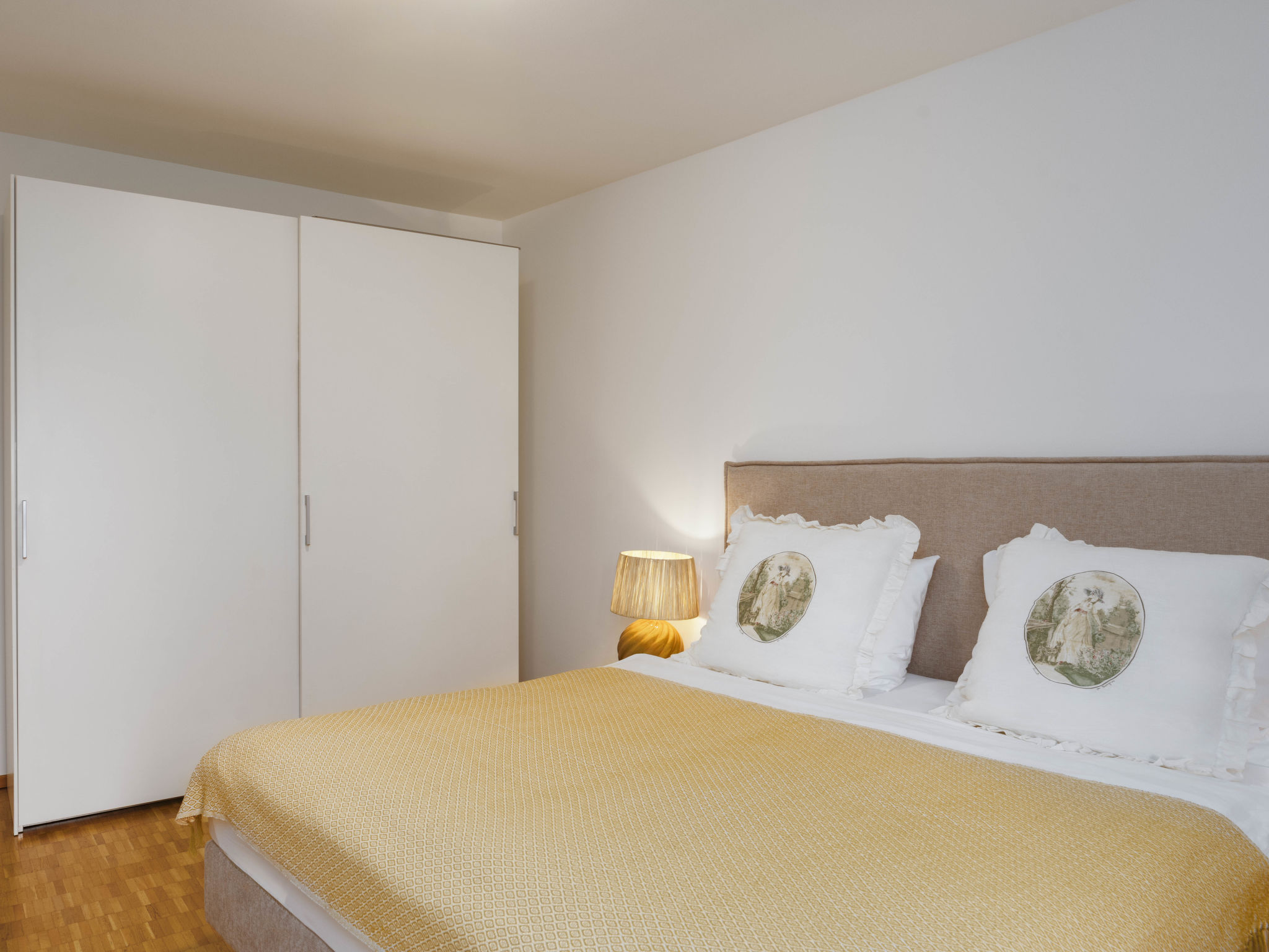 "Suite Modern", 2-Zimmer-Wohnung 70 m2 im 2. Stock, Südlage. Renoviert: Wohn-/Esszimmer mit 1 Doppeldiwanbett, TV und Radio. 1 Doppelzimmer. Offene Küche (Backofen, elektrische Kaffeemaschine, Kapseln für die Kaffeemaschine (Nespresso) extra). Bad/WC. 2 Balkone, Südlage. Herrliche Sicht auf den See, die Berge und die Ortschaft. Zur Verfügung: Internet (Wireless LAN, gratis). Bitte beachten: Nichtraucher-Haus. Maximal 1 Haustier/Hund erlaubt.