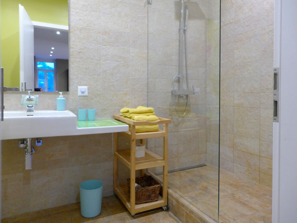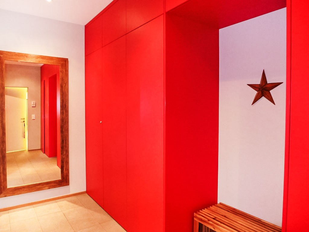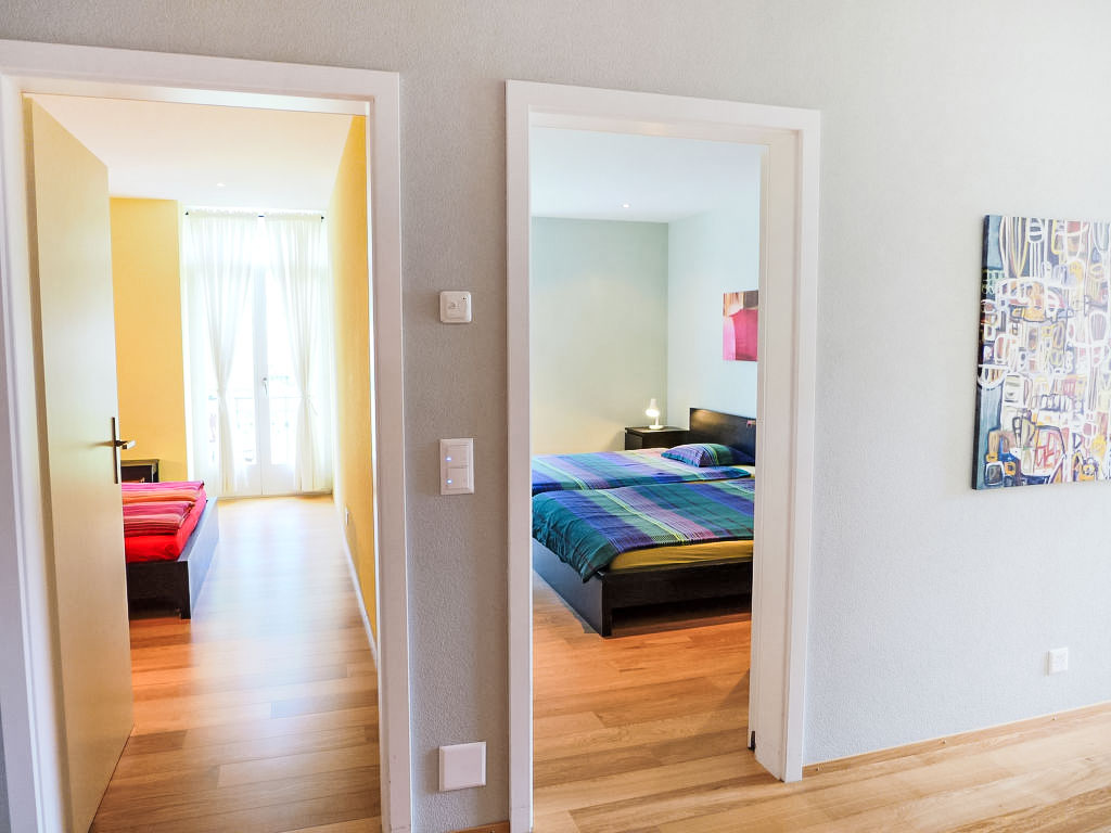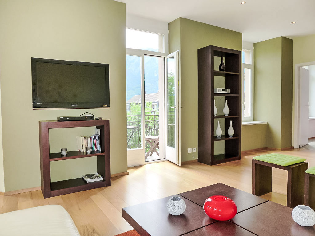 "Elegance", 3-Zimmer-Wohnung 100 m2 im 2. Stock. Geräumig und hell, sehr komfortabel und modern eingerichtet: offenes grosses Wohn-/Esszimmer 30 m2 mit Esstisch, Kabel-TV, Flachbildschirm, Radio, CD und DVD. Ausgang zum Balkon. 1 Zimmer 14 m2 mit 1 Doppelbett (160 cm, Länge 200 cm). Ausgang zum Balkon. 1 Zimmer 15 m2 mit 2 franz. Betten (140 cm, Länge 200 cm). Ausgang zum Balkon. Grosse Küche 10 m2 (Backofen, Geschirrspüler, 4 Glaskeramikherd Platten, Toaster, Wasserkocher, Mikrowelle, Tiefkühler, Grill, elektrische Kaffeemaschine, Fondue Set (Käse)). Bad/WC, Dusche/WC. Fussbodenheizung. 2 kleine Balkone. Sehr schöne Panoramasicht auf die Berge, die Landschaft und die Ortschaft. Zur Verfügung: Waschmaschine, Wäschetrockner, Haartrockner. Internet (Wireless LAN, gratis). Parkplatz (überdacht, 1 Auto). Bitte beachten: Nichtraucher-Unterkunft.