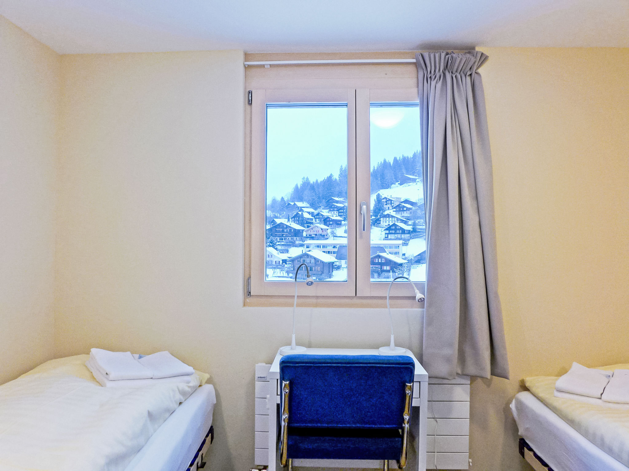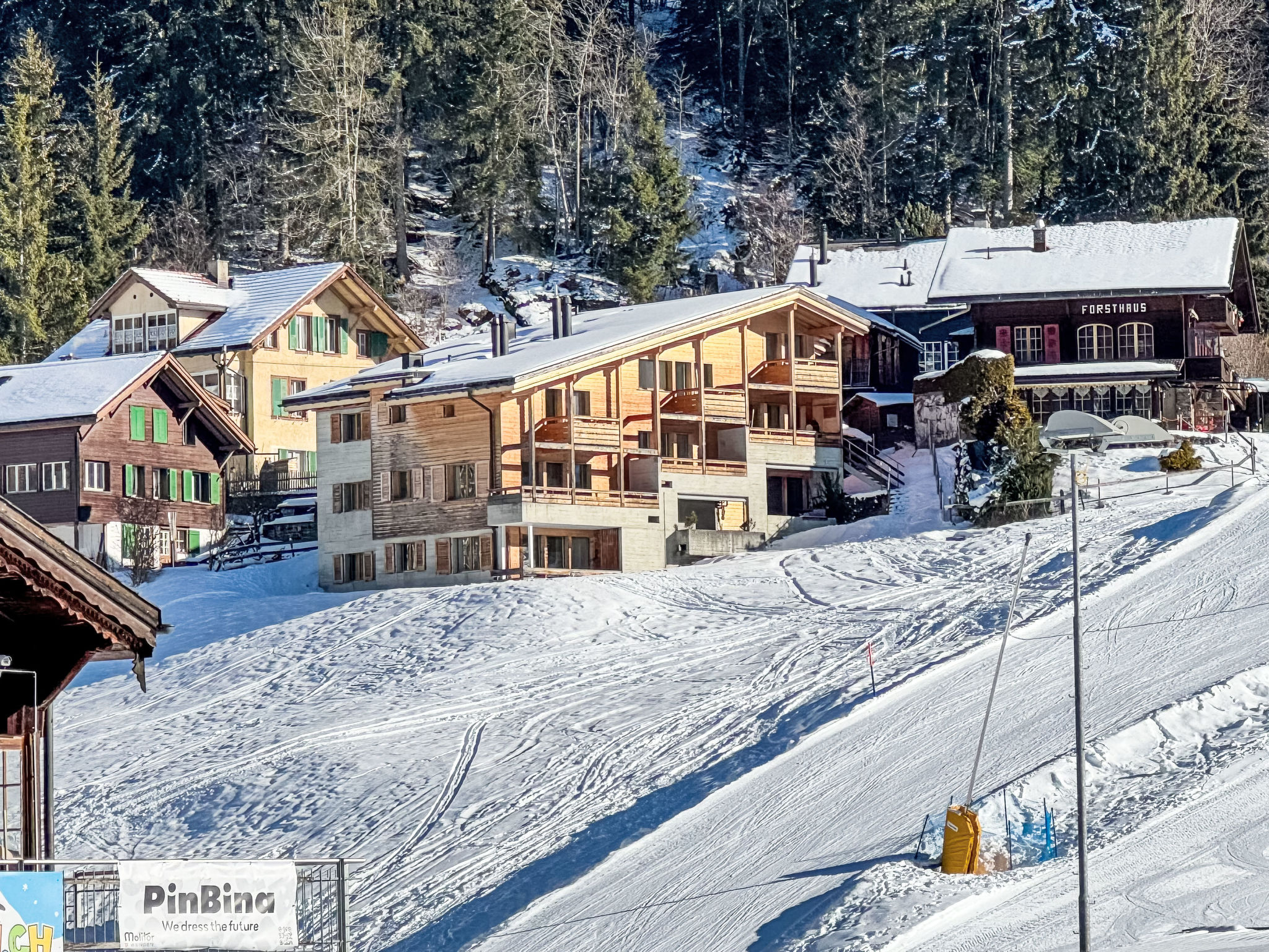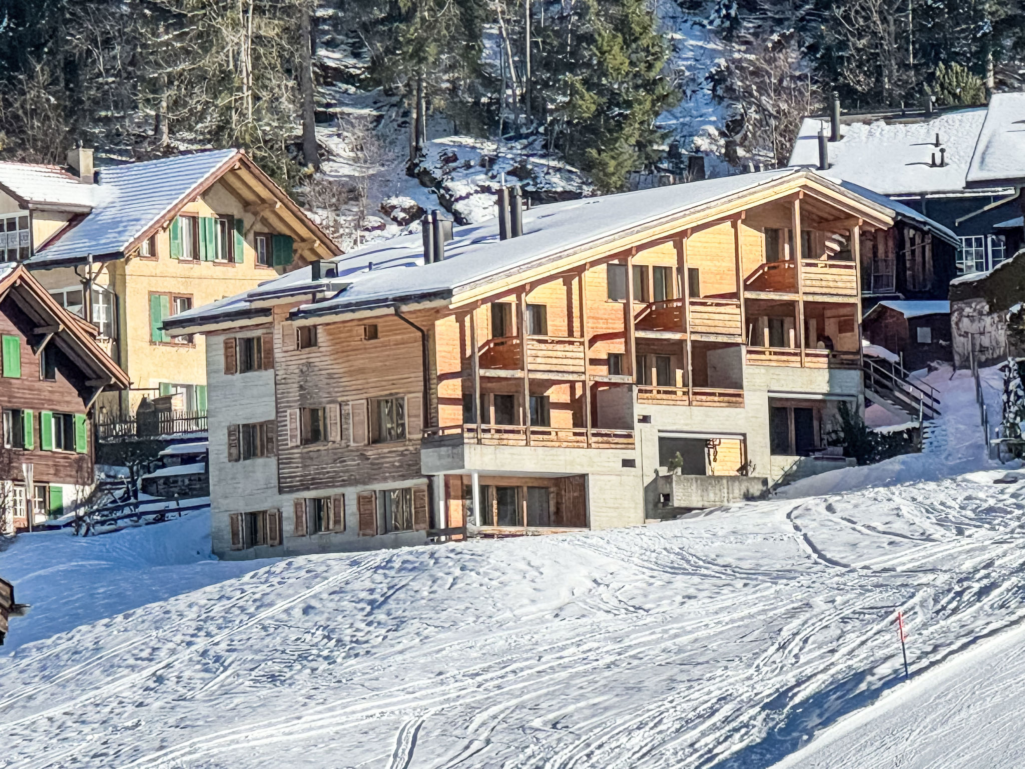 "Apt. 03", 5-Zimmer-Wohnung 96 m2 auf 2 Stockwerken. Objekt geeignet für 4 Erwachsene + 4 Kinder. Renoviert im Jahre 2016, modern und geschmackvoll eingerichtet: Wohn-/Esszimmer mit offenem Kamin, Kabel-TV, Radio, CD und DVD. 1 kleines Zimmer, ohne Schrank mit 2 Betten (90 cm, Länge 200 cm). Offene Küche (Geschirrspüler, 4 Induktionskochplatten, Toaster, Wasserkocher, elektrische Kaffeemaschine, Kapseln für die Kaffeemaschine (Nespresso) extra, Racletteofen, Kombinationsmikrowelle, Fondue Set (Käse)). Dusche/WC. Obergeschoss: 2 Zimmer, jedes Zimmer mit 1 Doppelbett (180 cm, Länge 200 cm). 1 kleines Zimmer, ohne Schrank mit 2 Betten (90 cm, Länge 200 cm). Bad/WC, sep. WC. Parkettböden. 2 Balkone, Westlage. Balkonmöbel. Sehr schöne Sicht auf die Berge, die Skipiste und die Ortschaft. Zur Verfügung: Bügeleisen, Haartrockner, Holz (extra). Internet (Wireless LAN, gratis). Bitte beachten: geeignet für Familien. Nichtraucher-Unterkunft.