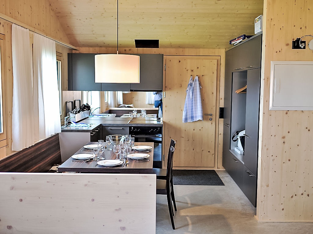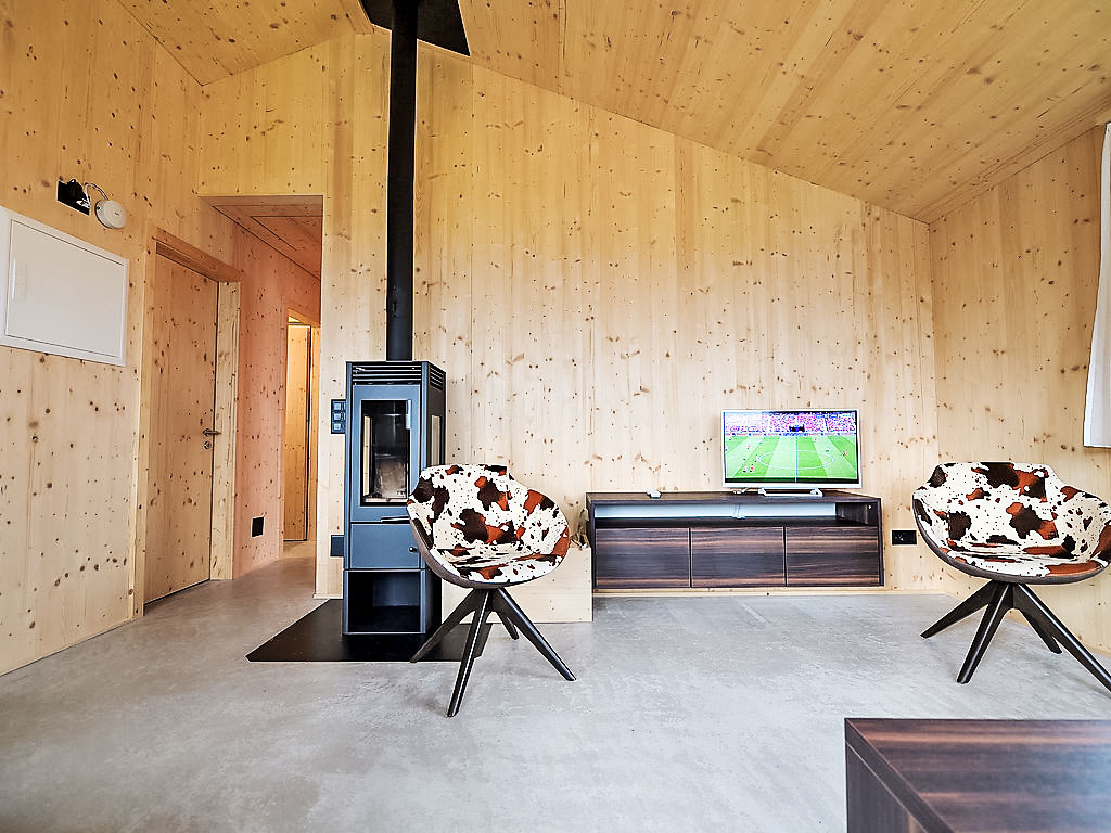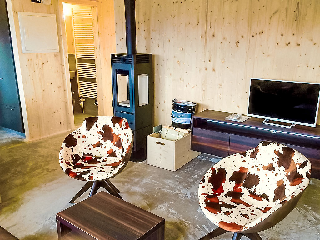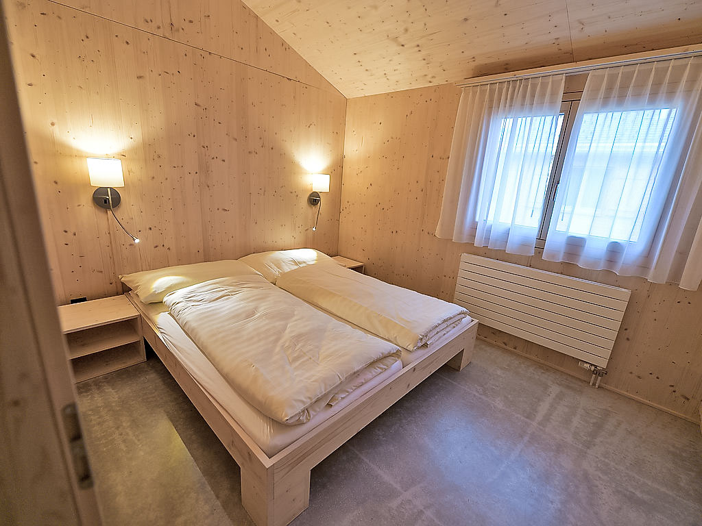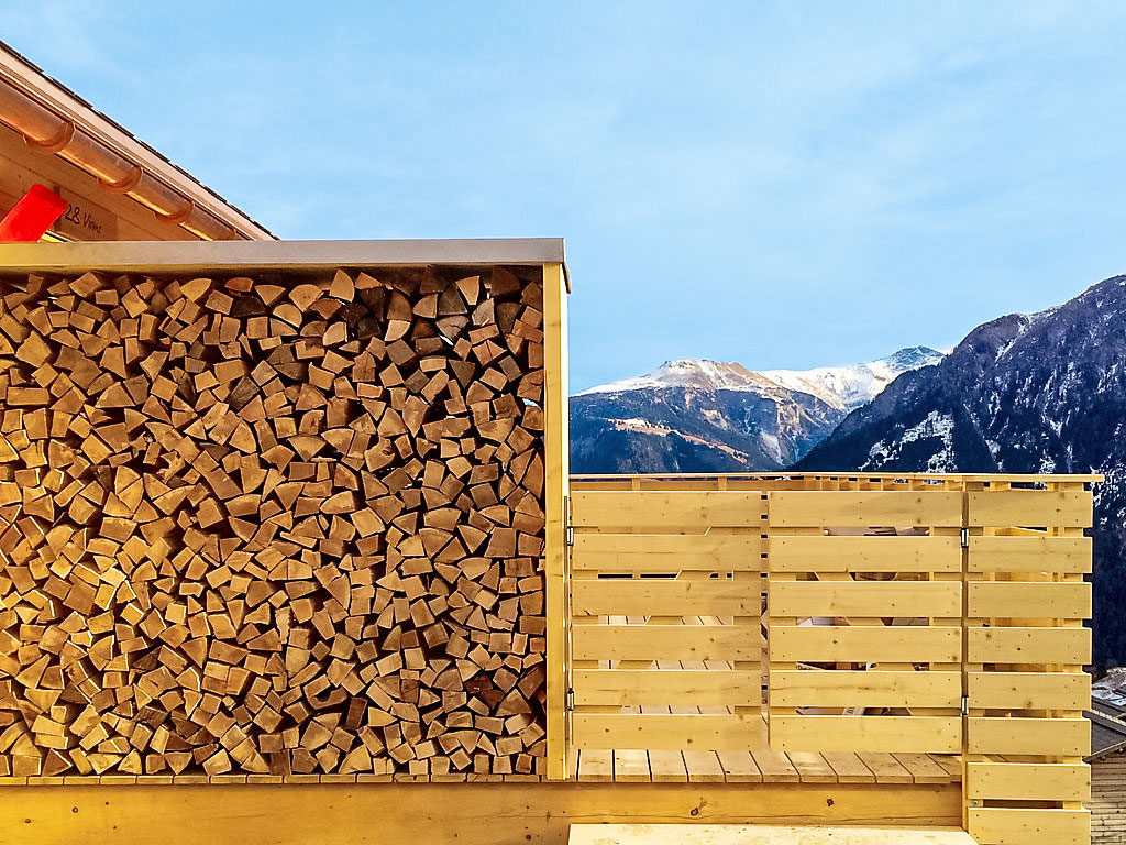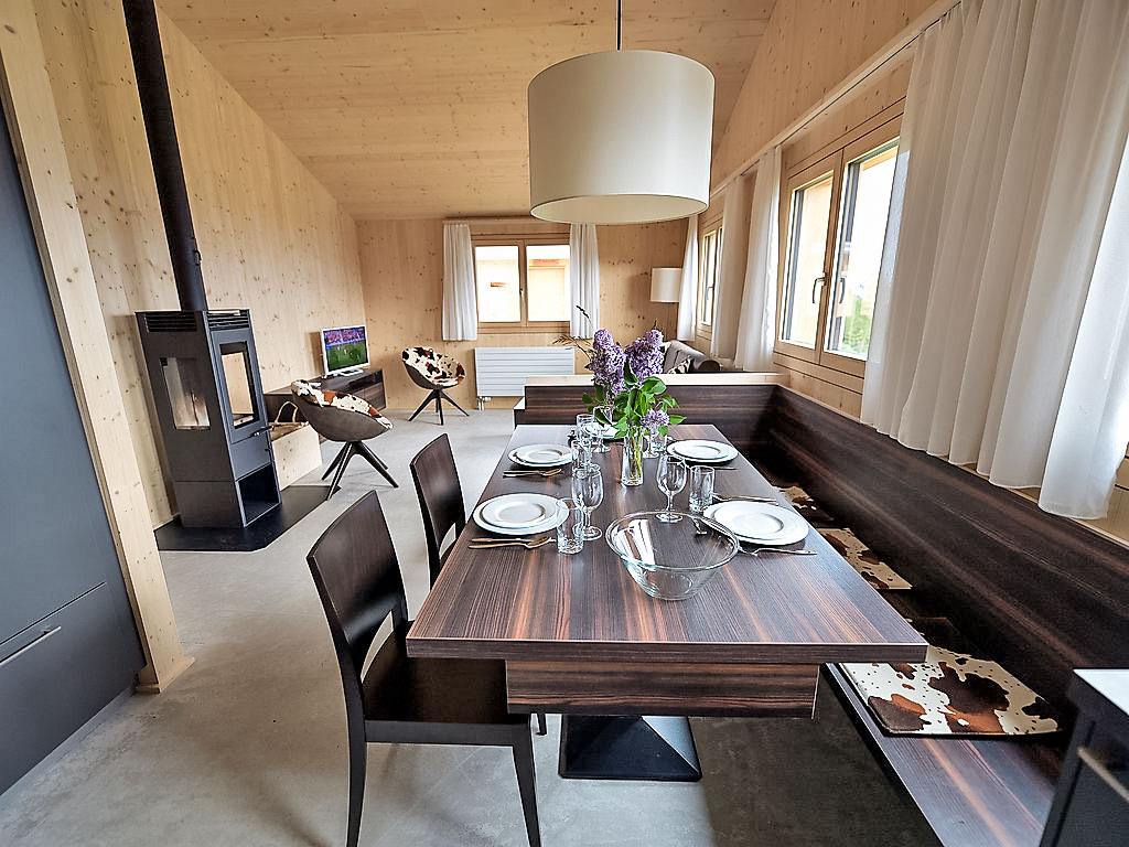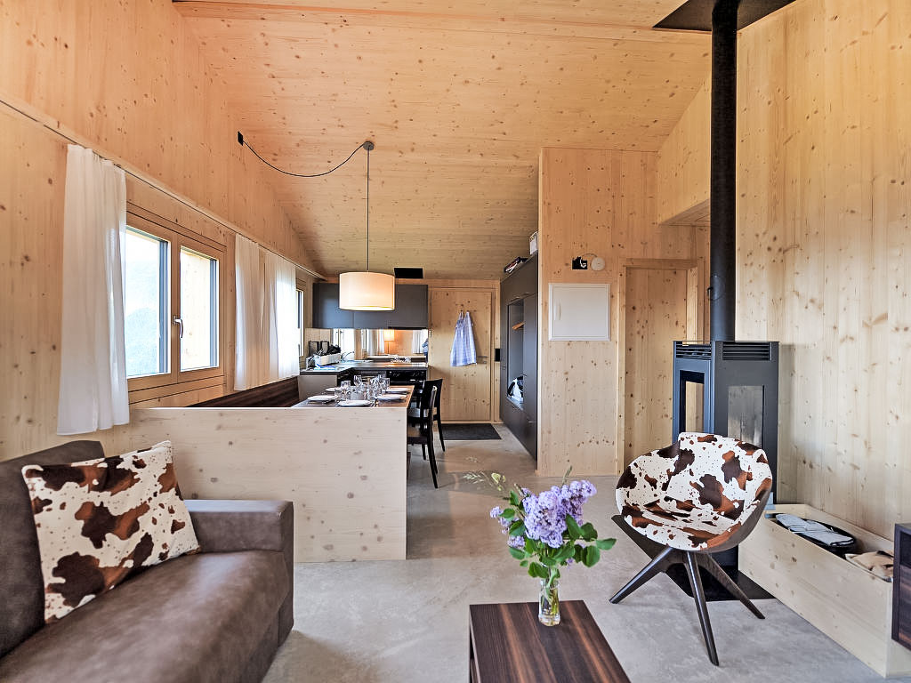 "Maiensäss Superior", 3-Zimmer-Chalet 58 m2, Südostlage. Komfortabel und gemütlich eingerichtet: Wohn-/Esszimmer mit 1 Doppeldiwanbett (140 cm, Länge 200 cm), Schwedenofen und Sat-TV (Flachbildschirm), Radio. Ausgang zur Terrasse. 1 Doppelzimmer. 1 Zimmer mit 2 Betten. Offene Küche (Backofen, Geschirrspüler, 4 Glaskeramikherd Platten, elektrische Kaffeemaschine, Kapseln für die Kaffeemaschine (Nespresso) extra). Dusche, sep. WC. E-Heizung, Holzheizung. Terrasse, Südostlage. Terrassenmöbel. Sehr schöne Sicht auf die Berge, das Tal und die Landschaft. Zur Verfügung: Safe, Kinderhochstuhl, Babybett (extra). Internet (Wireless LAN, gratis). Parkplatz (2 Autos) beim Haus. 2 Haustiere/Hunde erlaubt. Heizholz (nach Bedarf/extra).