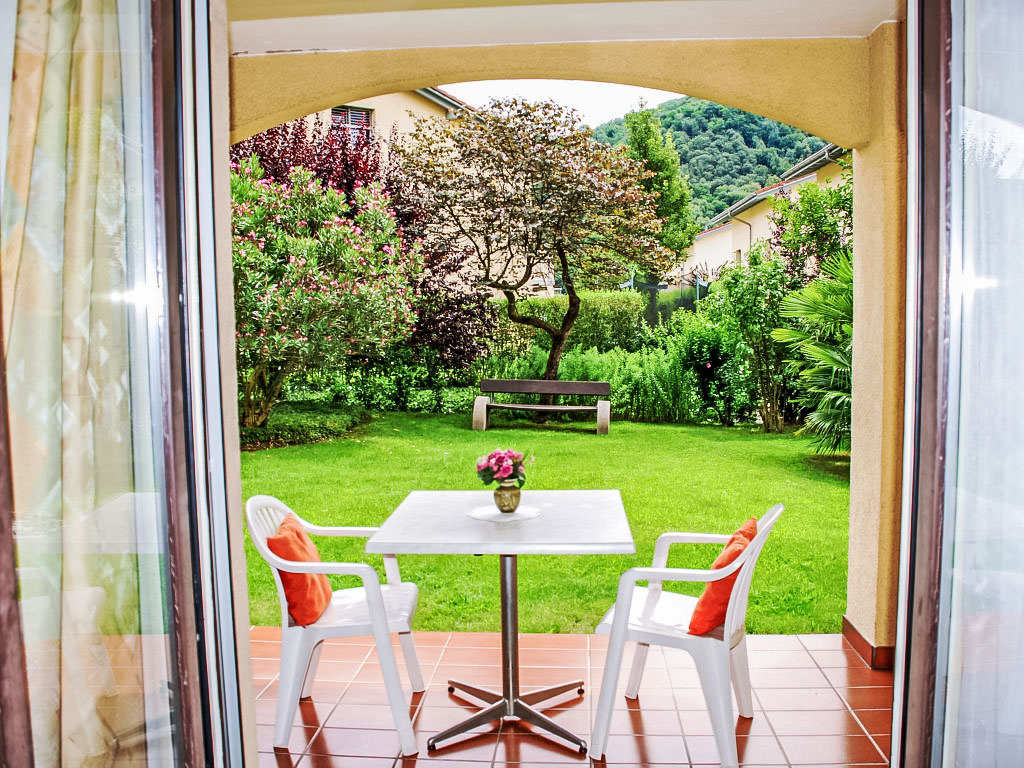"Gartenwohnung", 1-Zimmer-Wohnung 37 m2, im Erdgeschoss. Objekt geeignet für 2 Erwachsene + 1 Kind. Komfortabel und gemütlich eingerichtet: offenes Wohn-/Esszimmer mit 1 Doppelwandschrankbett (2 x 90 cm, Länge 200 cm), 1 Klappbett (90 cm, Länge 200 cm), Essecke und Kabel-TV (Flachbildschirm), Radio. Ausgang zum Gartensitzplatz. Kochnische im Eingang (2 Kochplatten). Bad/WC. Heizung. Grosser Gartensitzplatz. Terrassenmöbel, Liegestühle (2). Sicht auf den Garten. Zur Verfügung: Kinderhochstuhl, Babybett bis 2 Jahre (extra), Haartrockner. Bitte beachten: Nichtraucher-Unterkunft. Sonnenstoren. Die Wohnung befindet sich neben dem Restaurant.