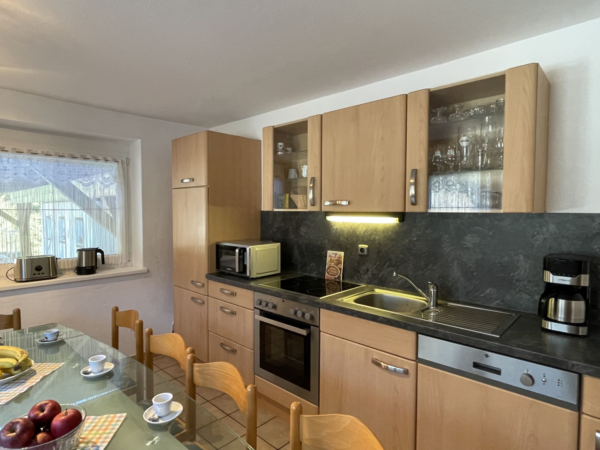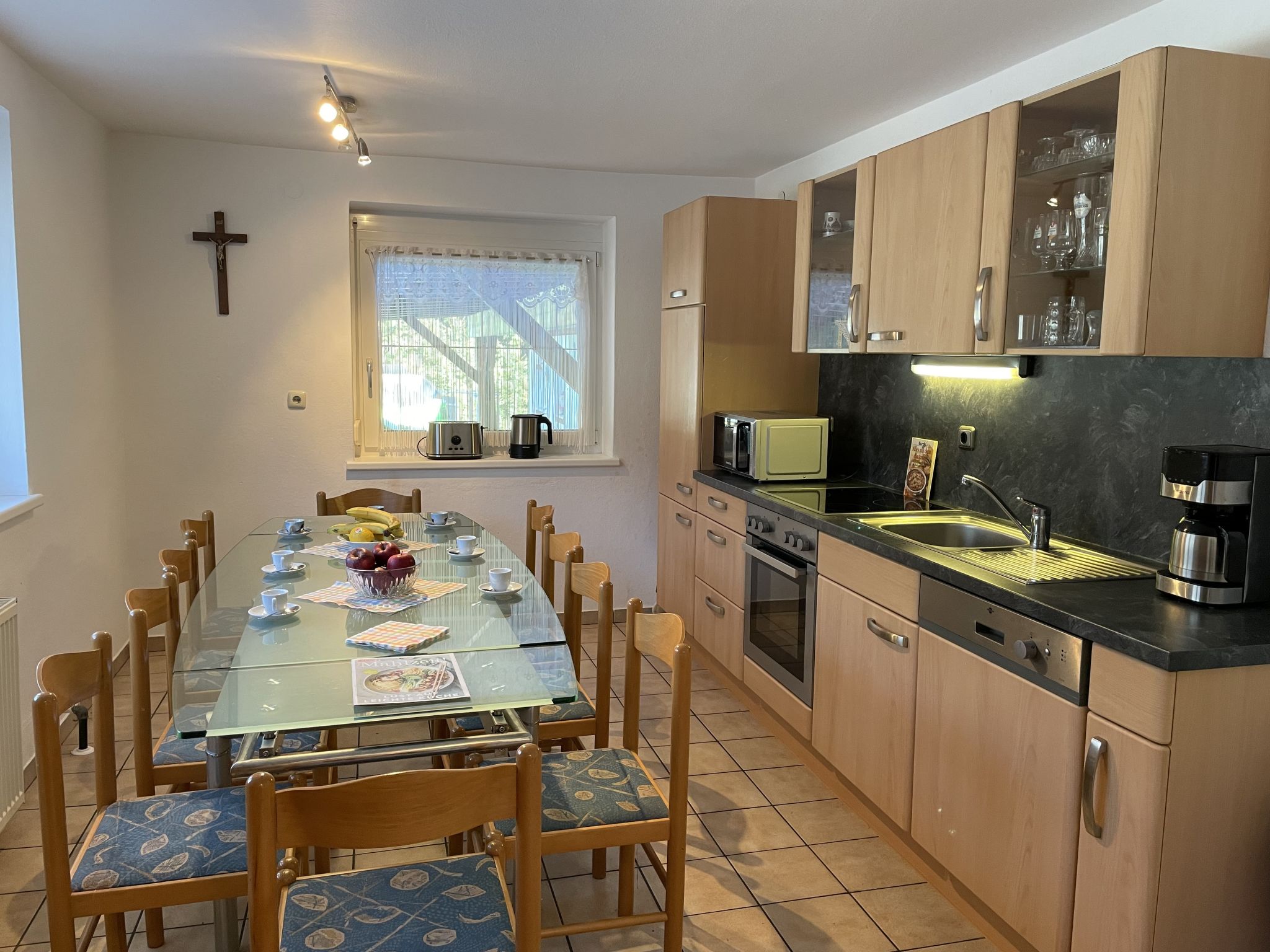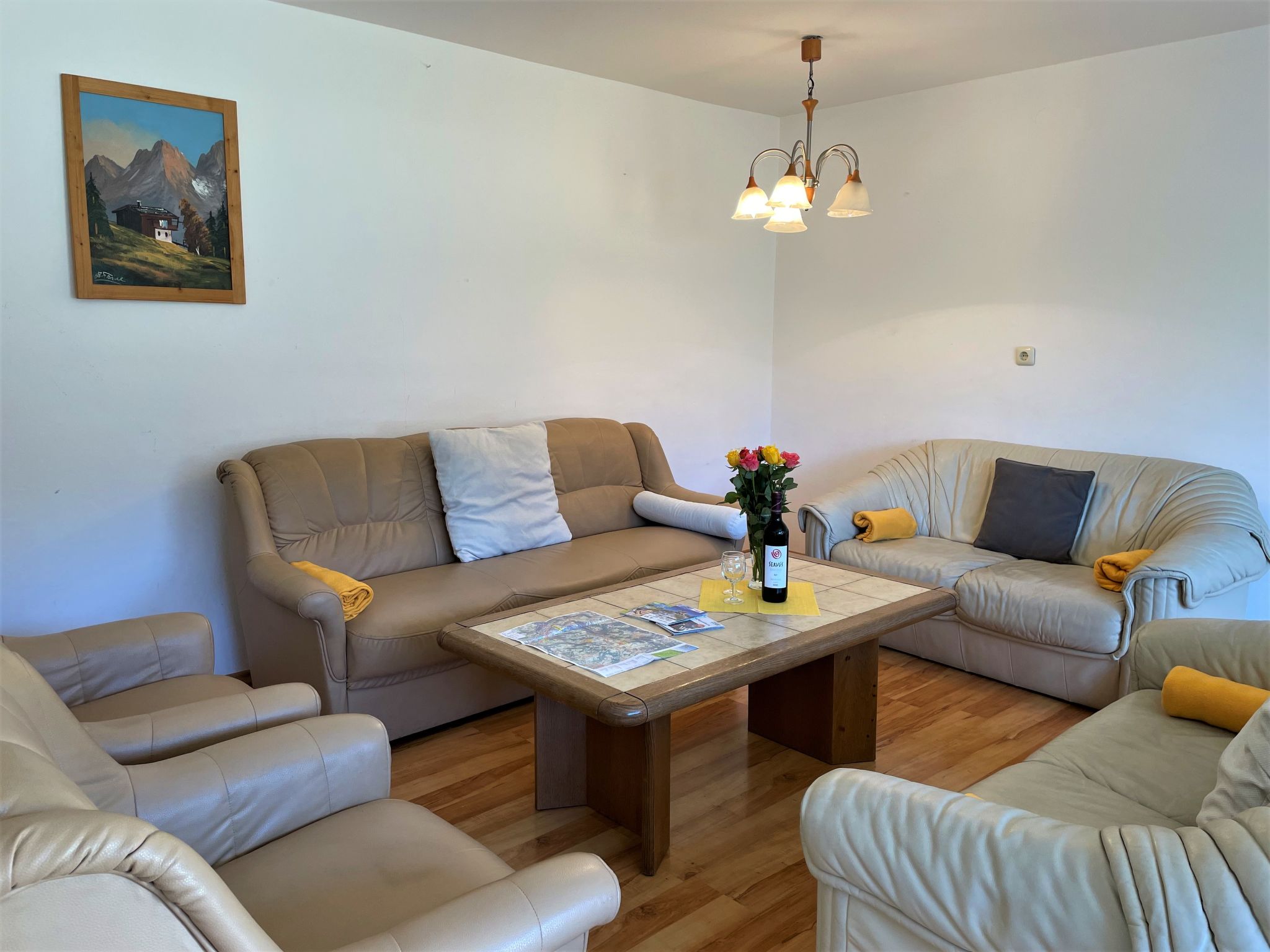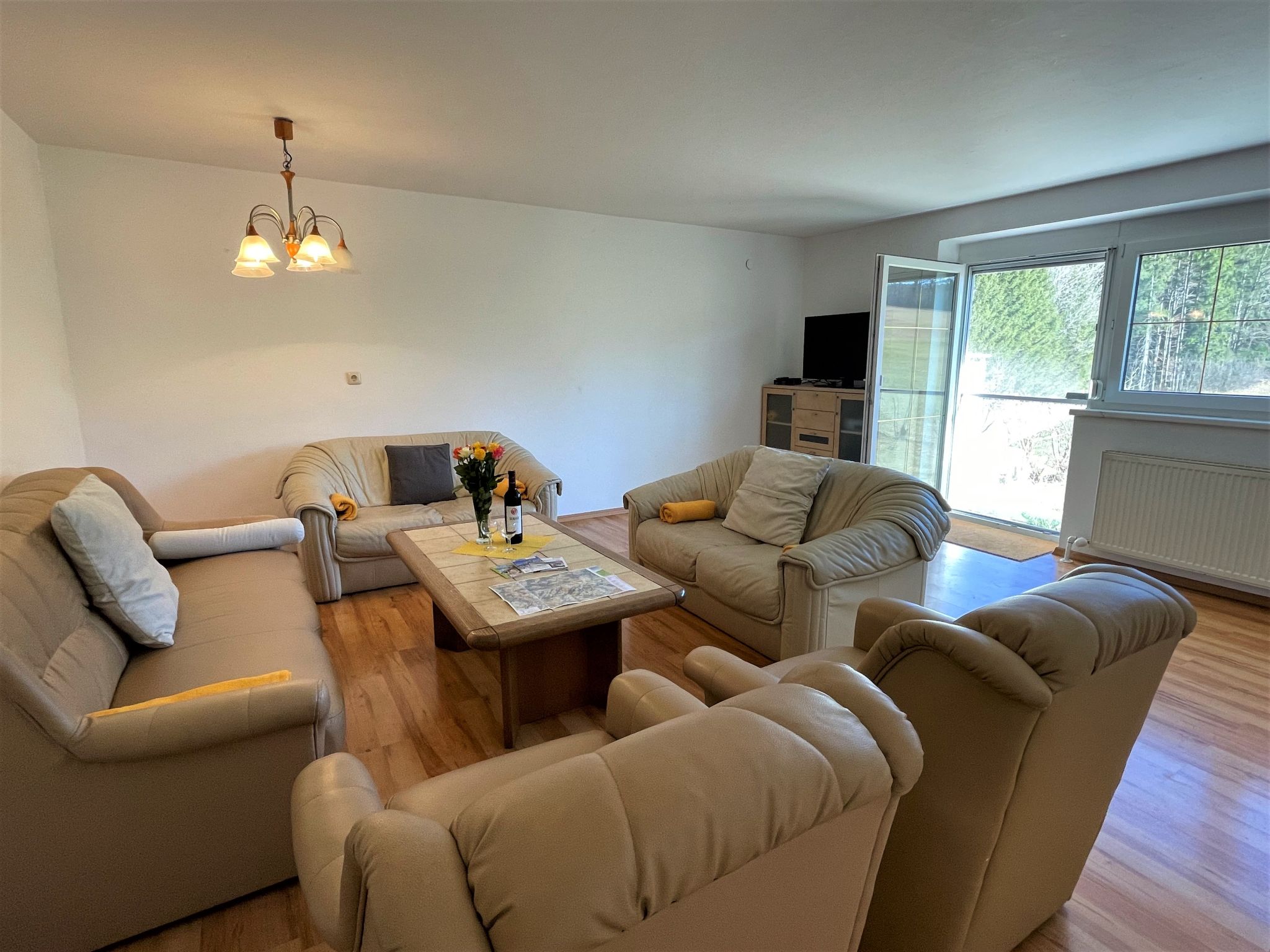"Anger (ANB100)", 6-Zimmer-Haus 240 m2 auf 2 Stockwerken. Zweckmässig eingerichtet: Wohnzimmer mit Sat-TV und Kachelofen. Ausgang zur Terrasse. 2 Zimmer, jedes Zimmer mit 1 Doppelbett. Küche (4 Kochplatten, Backofen, Geschirrspüler, Wasserkocher, Mikrowelle, elektrische Kaffeemaschine) mit Esstisch und Essecke. Bad/Dusche/WC. Obergeschoss: 1 Zimmer mit 1 Doppelbett und Waschbecken. Ausgang zum Balkon. 1 Zimmer mit 1 Doppelbett und Waschbecken. 1 Zimmer mit 1 Doppelbett. Bad/Dusche/WC. Ölheizung. Balkon, Terrasse teilweise überdacht. Terrassenmöbel. Schöne Sicht auf die Berge und den Wald. Zur Verfügung: Kinderhochstuhl, Babybett. Bitte beachten: Nichtraucher-Haus.