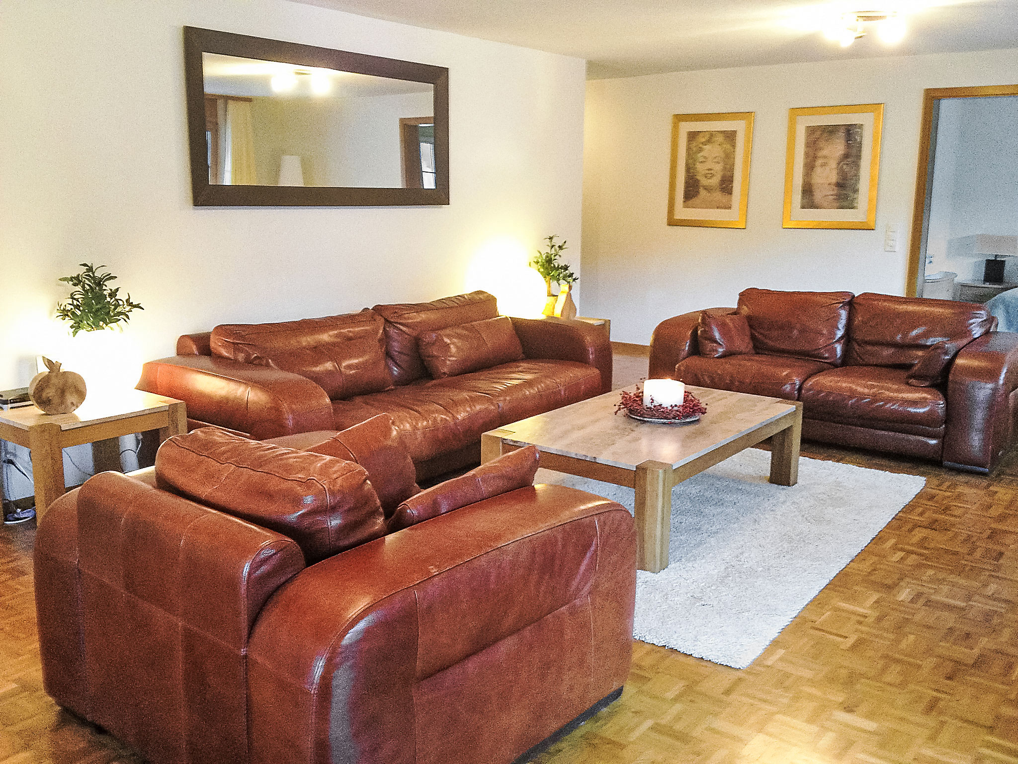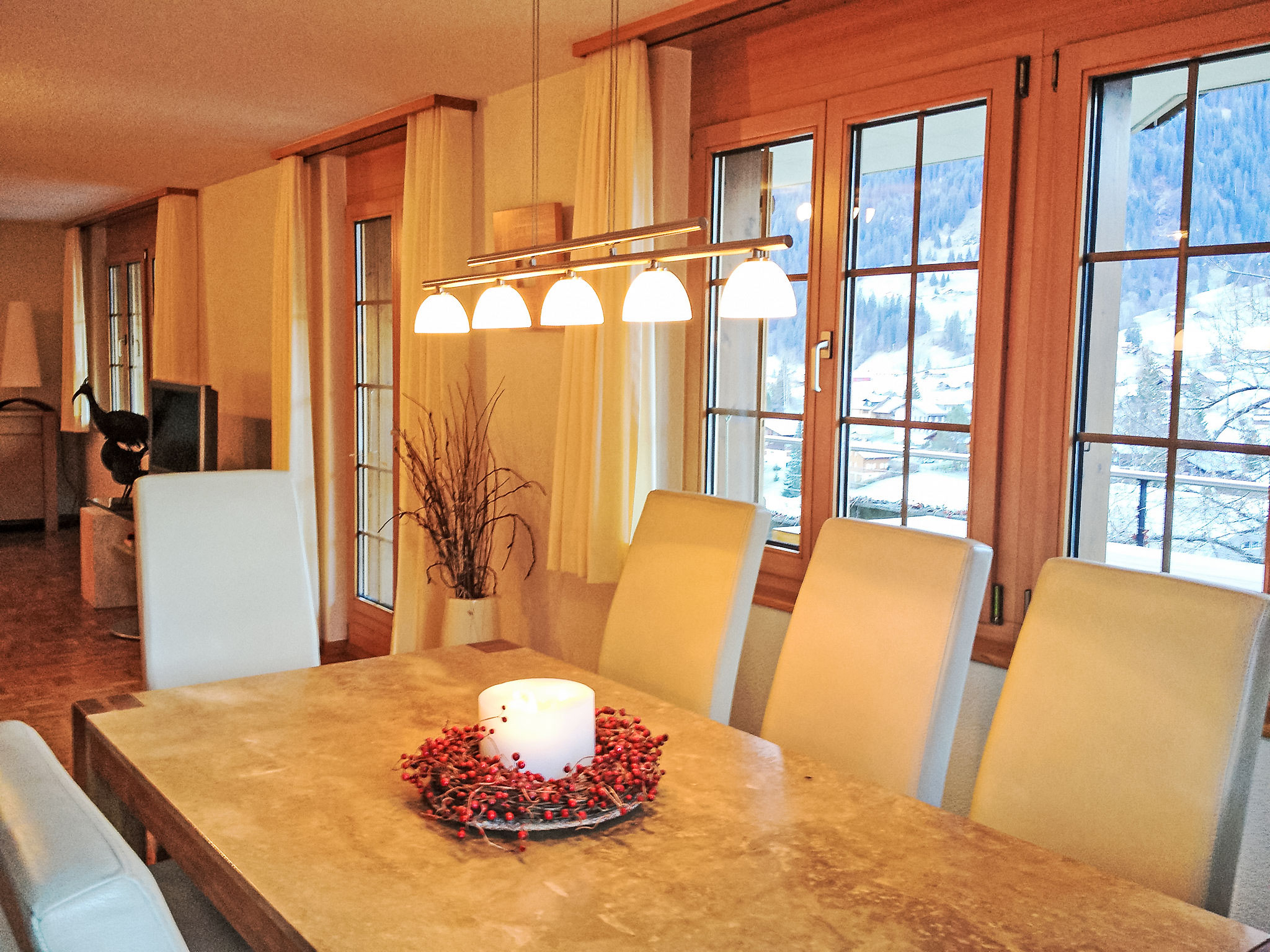 5-Zimmer-Wohnung 140 m2, im erhöhten Erdgeschoss, Südlage. Geschmackvoll und gemütlich eingerichtet: Wohn-/Esszimmer mit Digital-TV, Flachbildschirm, CD, Stereoanlage und DVD. Ausgang zur Terrasse, Richtung Süden und Richtung Westen. 2 Zimmer, jedes Zimmer mit 2 Betten (90 cm, Länge 200 cm). 1 Zimmer mit 1 Doppelbett (180 cm, Länge 200 cm). 1 Zimmer mit 1 franz. Bett (150 cm, Länge 200 cm). Offene Küche (Backofen, Geschirrspüler, 4 Glaskeramikherd Platten, Toaster, Wasserkocher, Mikrowelle, elektrische Kaffeemaschine, Racletteofen, Fondue Set (Käse)). Bad/WC, Dusche/WC, sep. WC. Bodenheizung. Holzböden. Grosse Terrasse, Südlage und Westlage. Terrassenmöbel, Liegestühle (2), Abstellkammer. Herrliche Sicht auf die Berge und Eigernordwand. Zur Verfügung: Waschmaschine, Wäschetrockner, Haartrockner. Internet (Wireless LAN, gratis). Parkplatz Nr. EG 5. Bitte beachten: Nichtraucher-Unterkunft. Feuerlöscher.