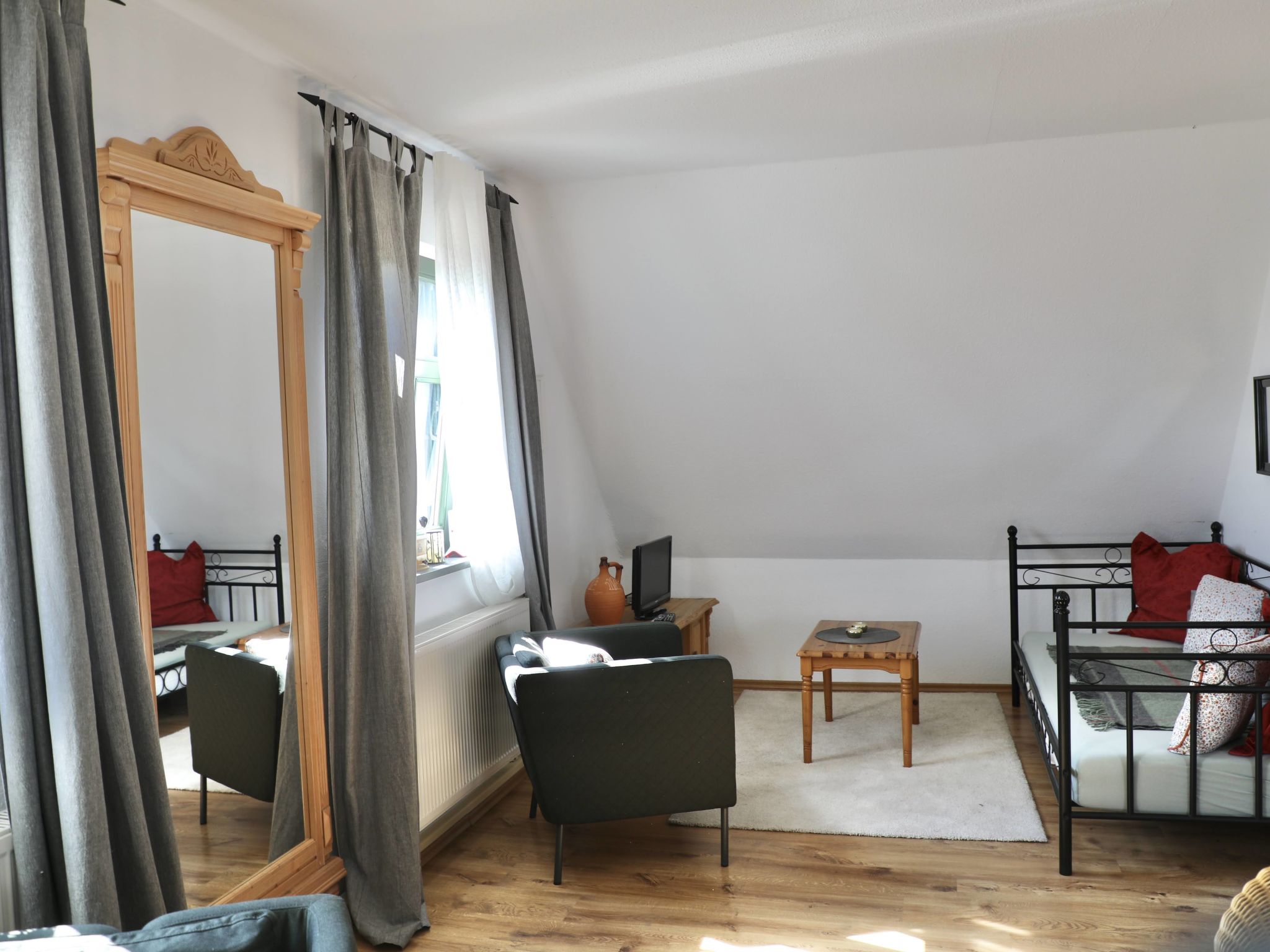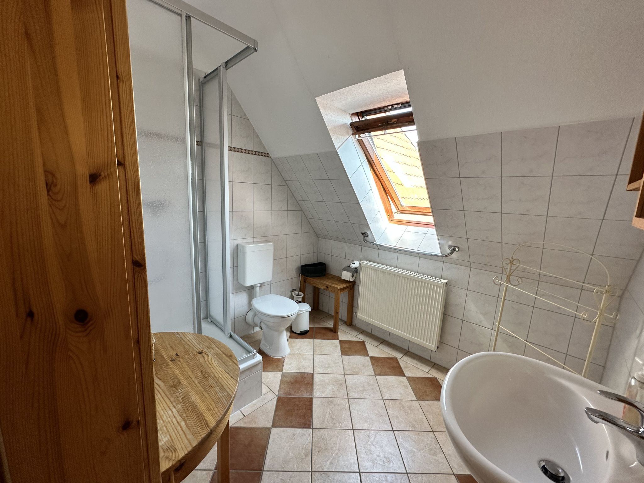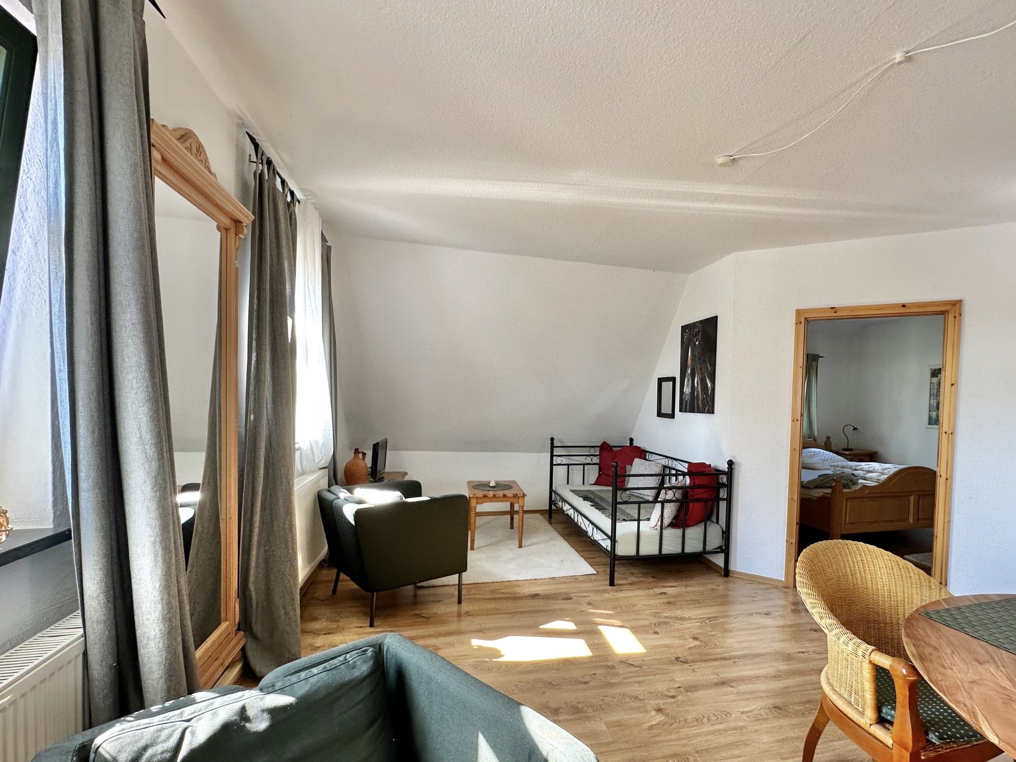 2-Zimmer-Wohnung 40 m2 im 1. Stock. Abgeschrägtes Wohn-/Esszimmer mit 1 Diwanbett und Sat-TV (Flachbildschirm). 1 abgeschrägtes Doppelzimmer. Kochnische (2 Kochplatten, elektrische Kaffeemaschine). Dusche/WC. Zur Verfügung: Internet (Wireless LAN, gratis). Bitte beachten: Nichtraucher-Unterkunft.