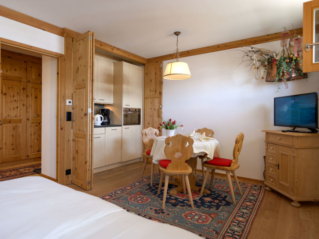 "Chesa Sur Puoz E8", 1-Zimmer-Studio 38 m2, im Erdgeschoss, Südlage. Komfortabel und gemütlich eingerichtet: kleiner Eingang mit Dusche/Bidet/WC. Wohn-/Schlafzimmer mit 1 Doppelbett (2 x 85 cm, Länge 200 cm), TV (Flachbildschirm). Kochnische (Backofen, Geschirrspüler, 2 Glaskeramikherd Platten, Toaster, Wasserkocher, elektrische Kaffeemaschine). Liegestühle (2). Eingeschränkte Sicht auf die Berge. Zur Verfügung: Haartrockner. Internet (Wireless LAN, gratis). Bitte beachten: Nichtraucher-Unterkunft, kein Parkplatz. :kein Balkon-Terrasse - nur Gemeinschaftssitzplatz im Aussenbereich - siehe Foto.