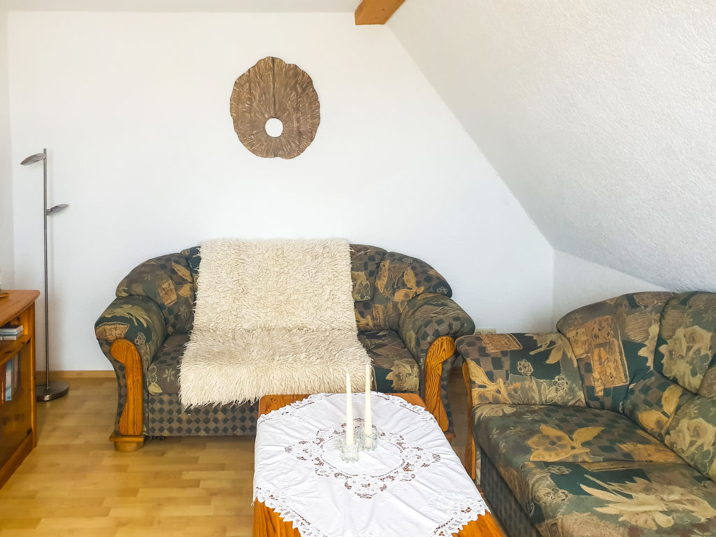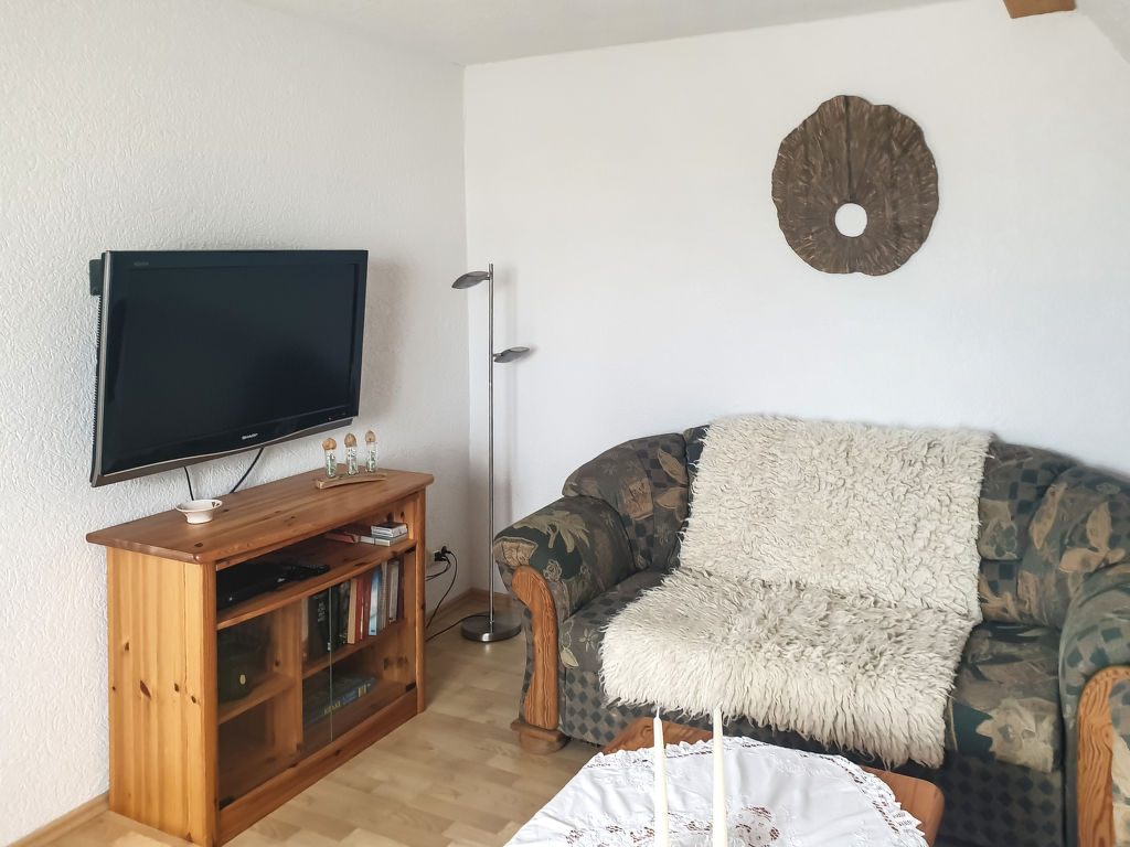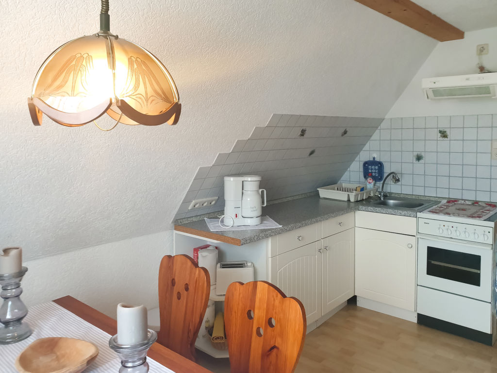 2-Zimmer-Wohnung 49 m2 im 1. Stock. Zweckmässig und gemütlich eingerichtet: abgeschrägtes Wohnzimmer 16 m2 mit Sat-TV (Flachbildschirm). 1 abgeschrägtes Zimmer 16 m2 mit 1 Doppelbett (180 cm, Länge 200 cm). Küche 8 m2 (Backofen, 4 Glaskeramikherd Platten, Mikrowelle, elektrische Kaffeemaschine) mit Esstisch. Dusche/WC. Zur Verfügung: Internet (Wireless LAN, gratis). Bitte beachten: Nichtraucher-Unterkunft. Rauchmelder.